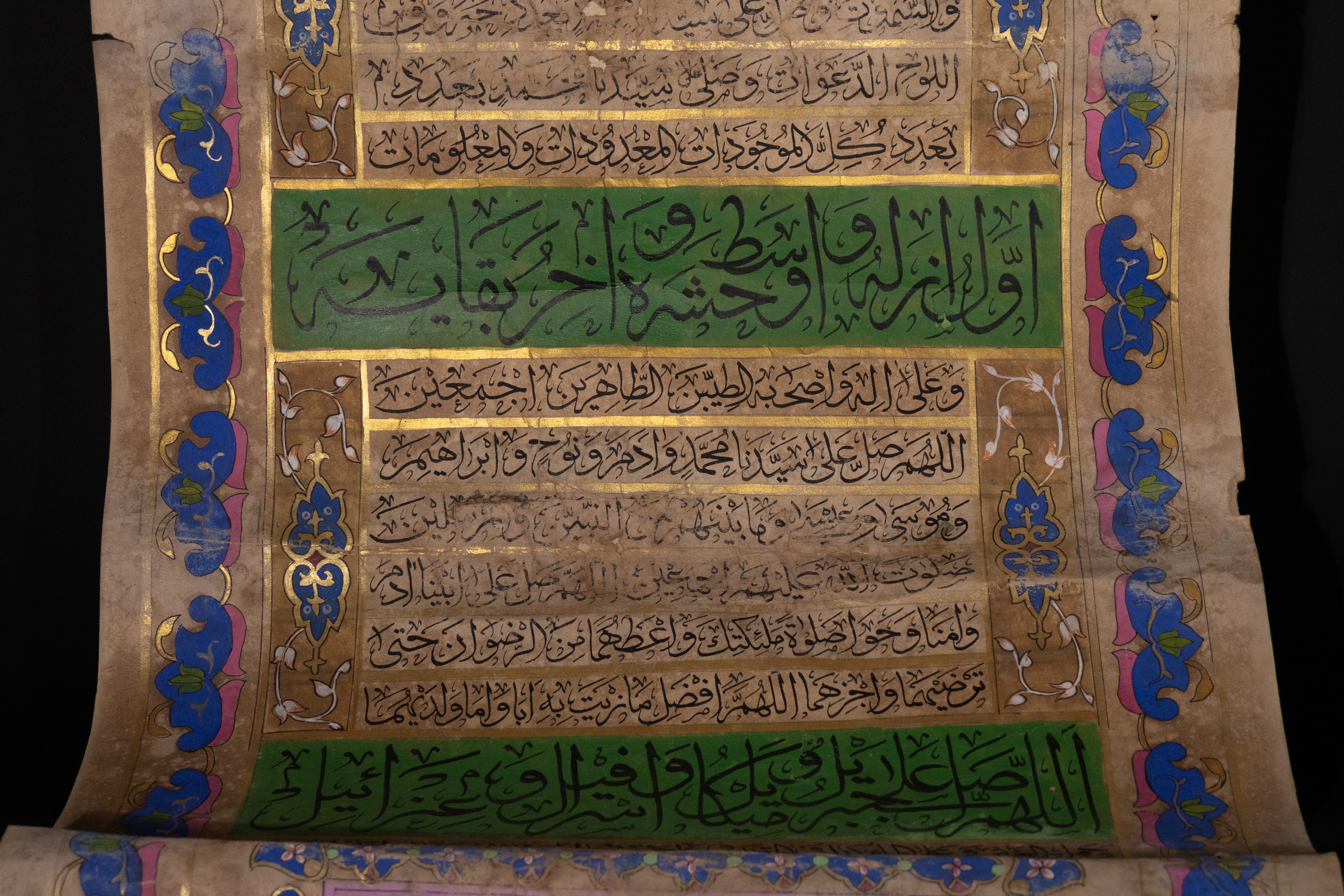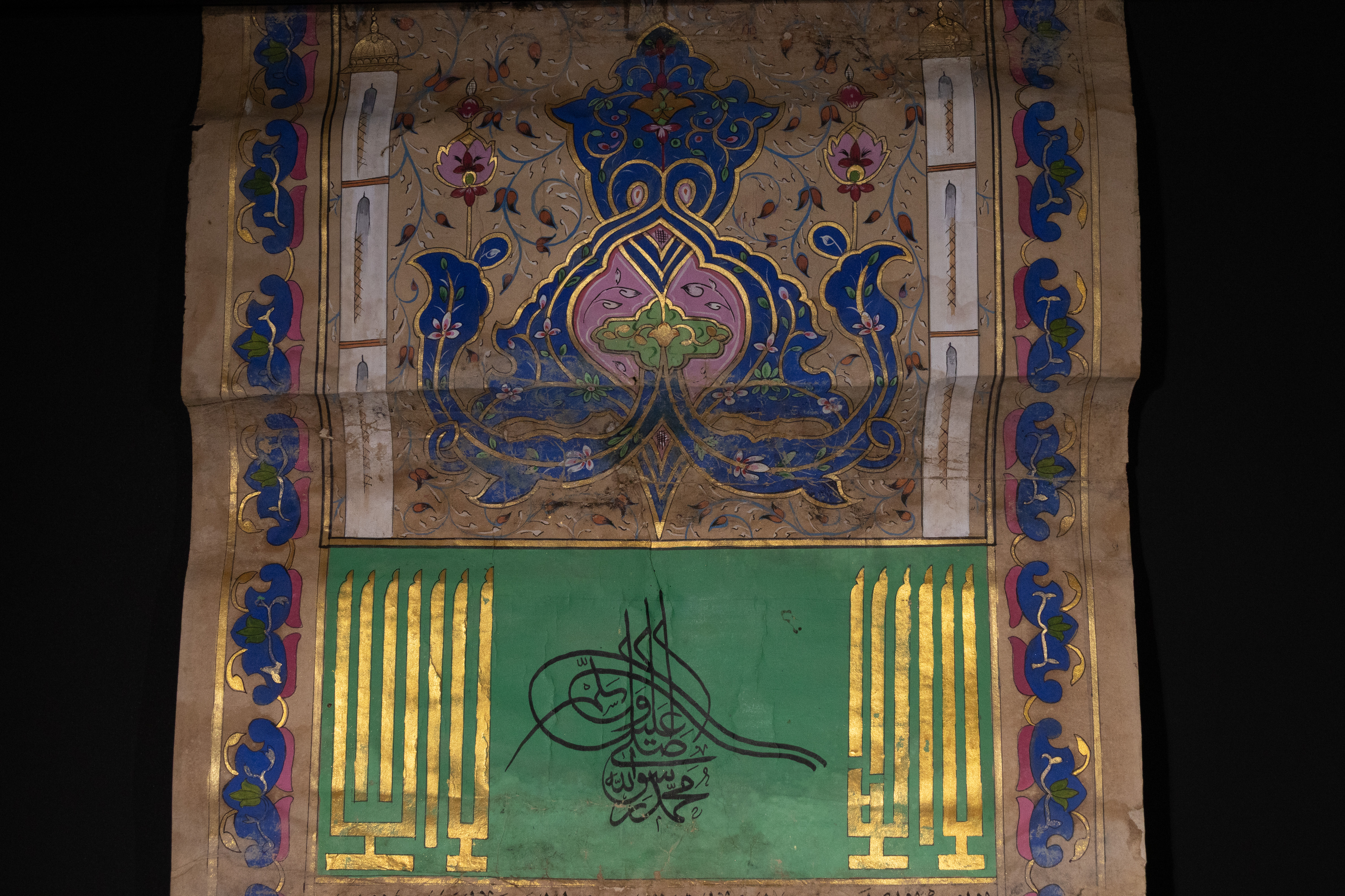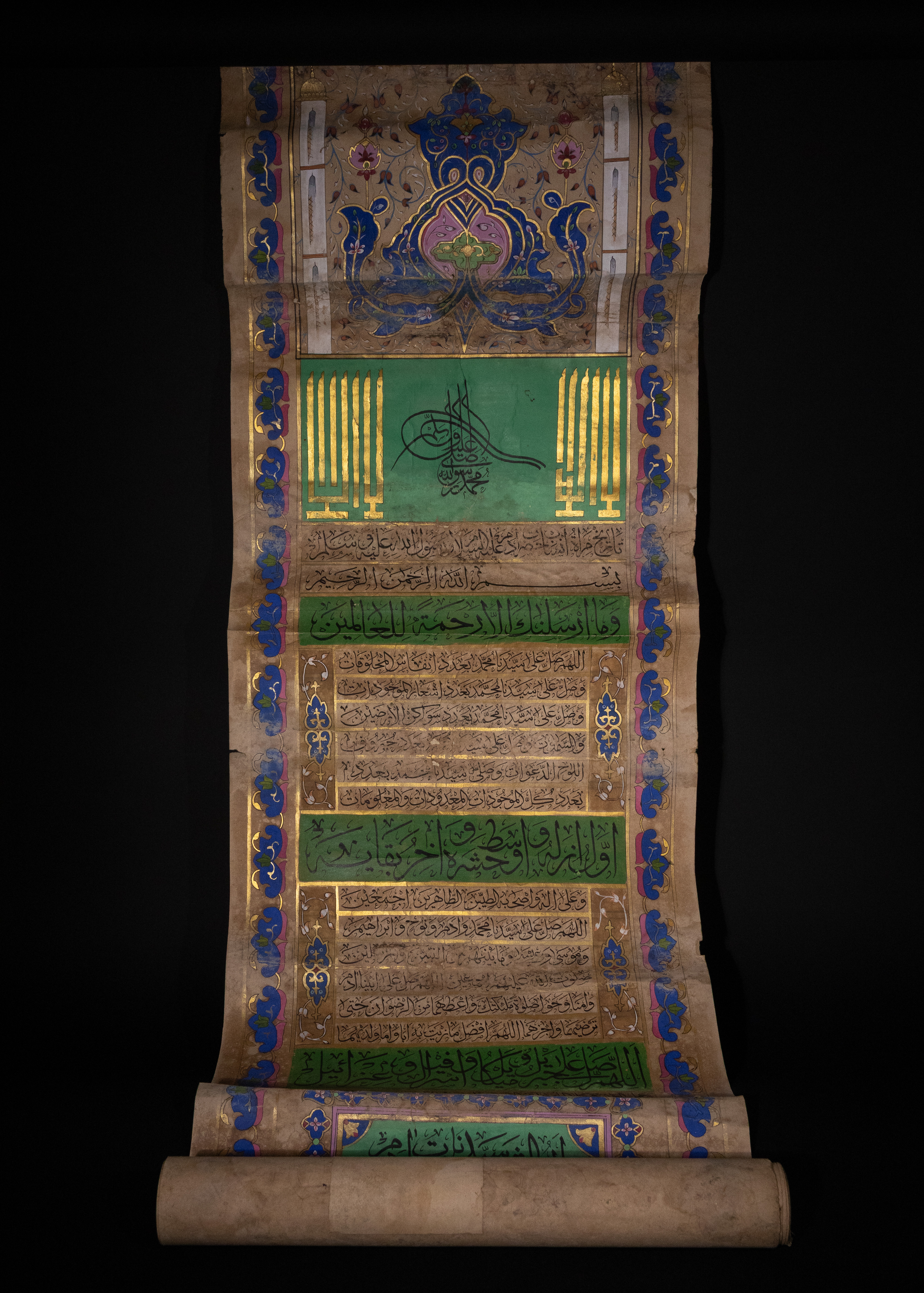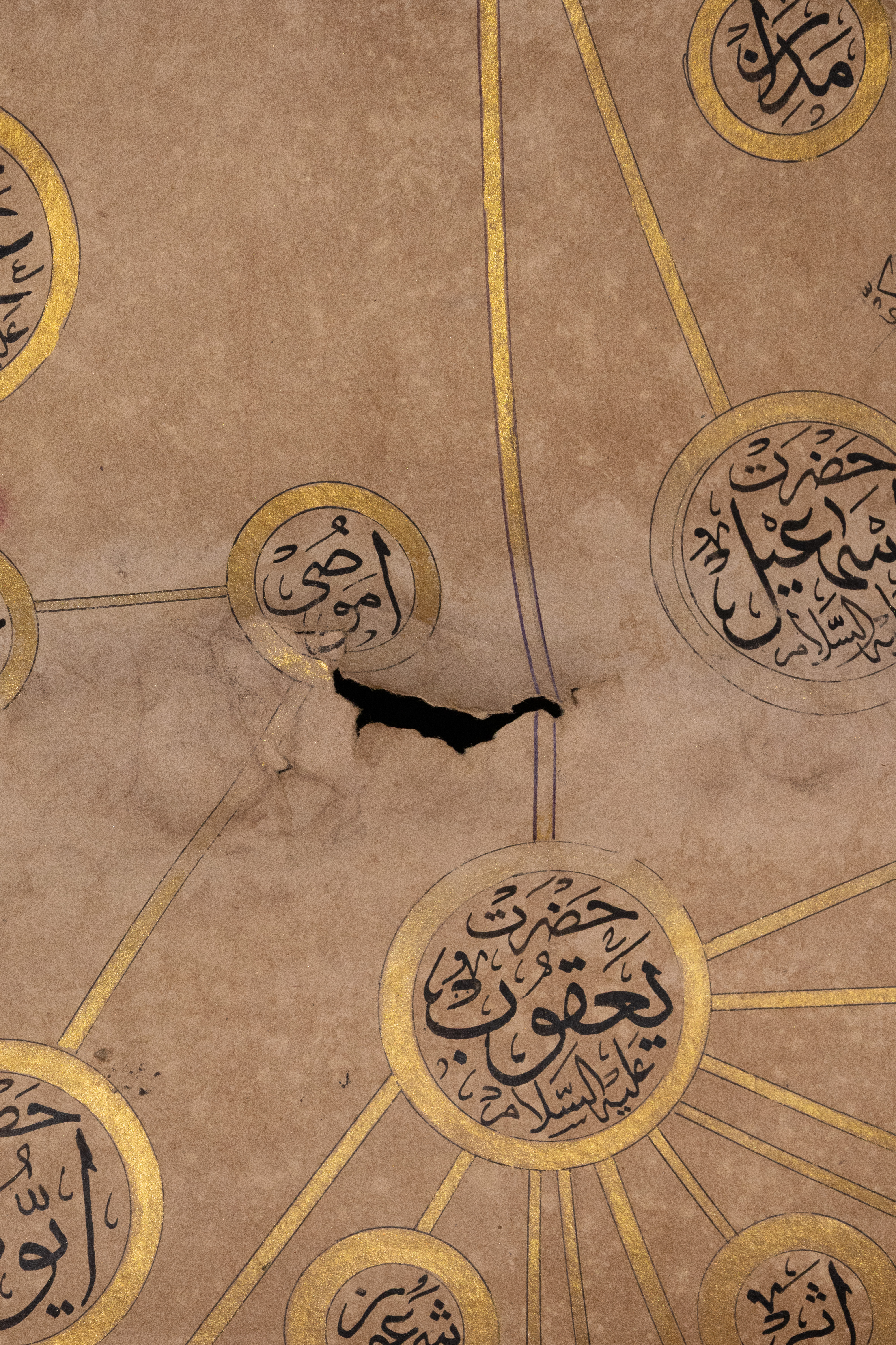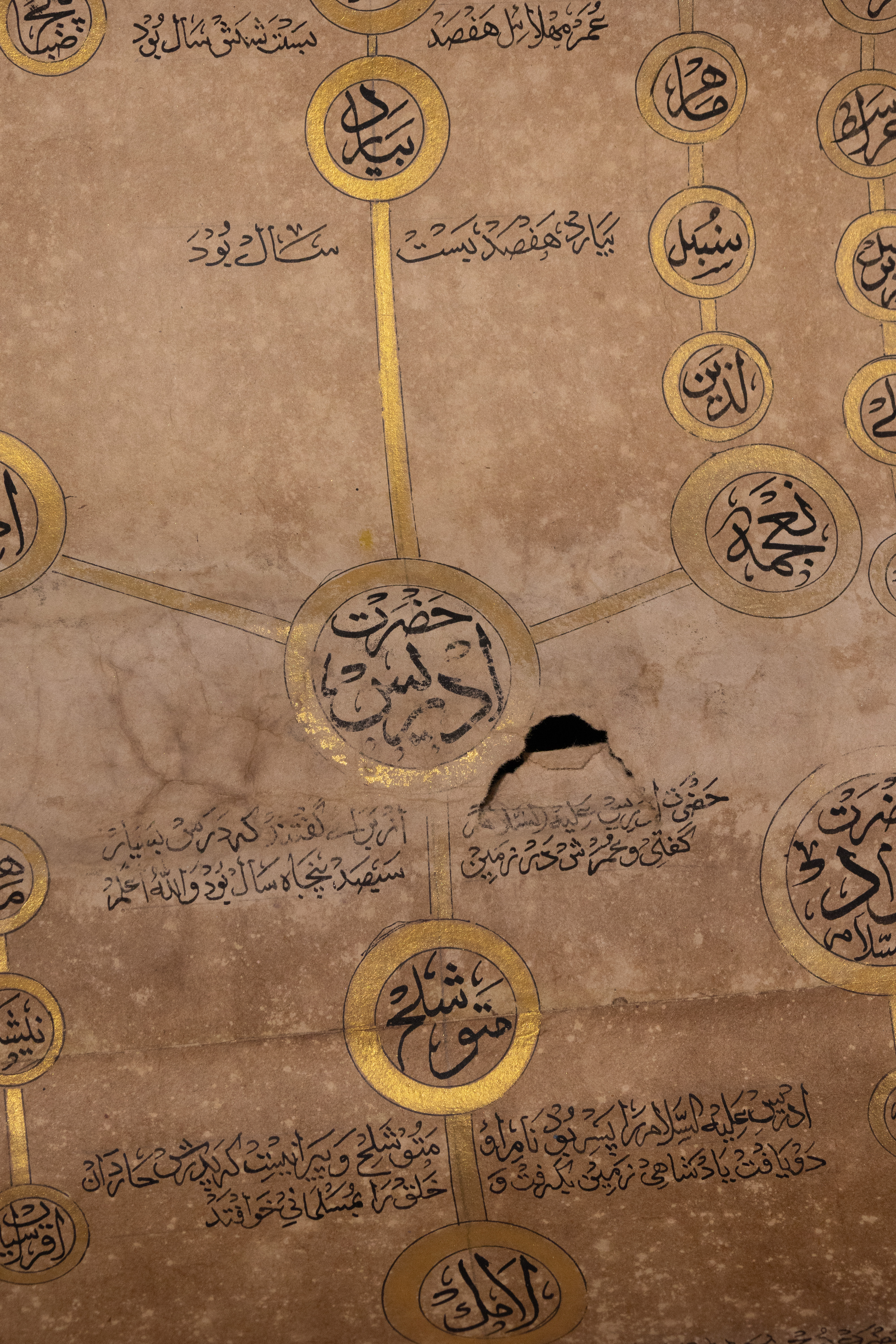 An illuminated Islamic genealogical scroll, likely Ottoman or Persian, dating to the 19th Century. Executed on aged paper, it features extensive Islamic calligraphy in black ink, vibrant green, blue, and pink pigments, and prominent gold embellishments. Its layout includes a large Ottoman Tughra, decorative floral and foliate borders, and multiple panels of Arabic text. A significant portion details an interconnected genealogical or spiritual lineage (silsila) through gold-outlined circles containing Arabic names, identified as prophets or revered figures, such as ‘أبو البشر محمد’ (Abu al-Bashar Muhammad, ‘Father of Humanity, Muhammad’).