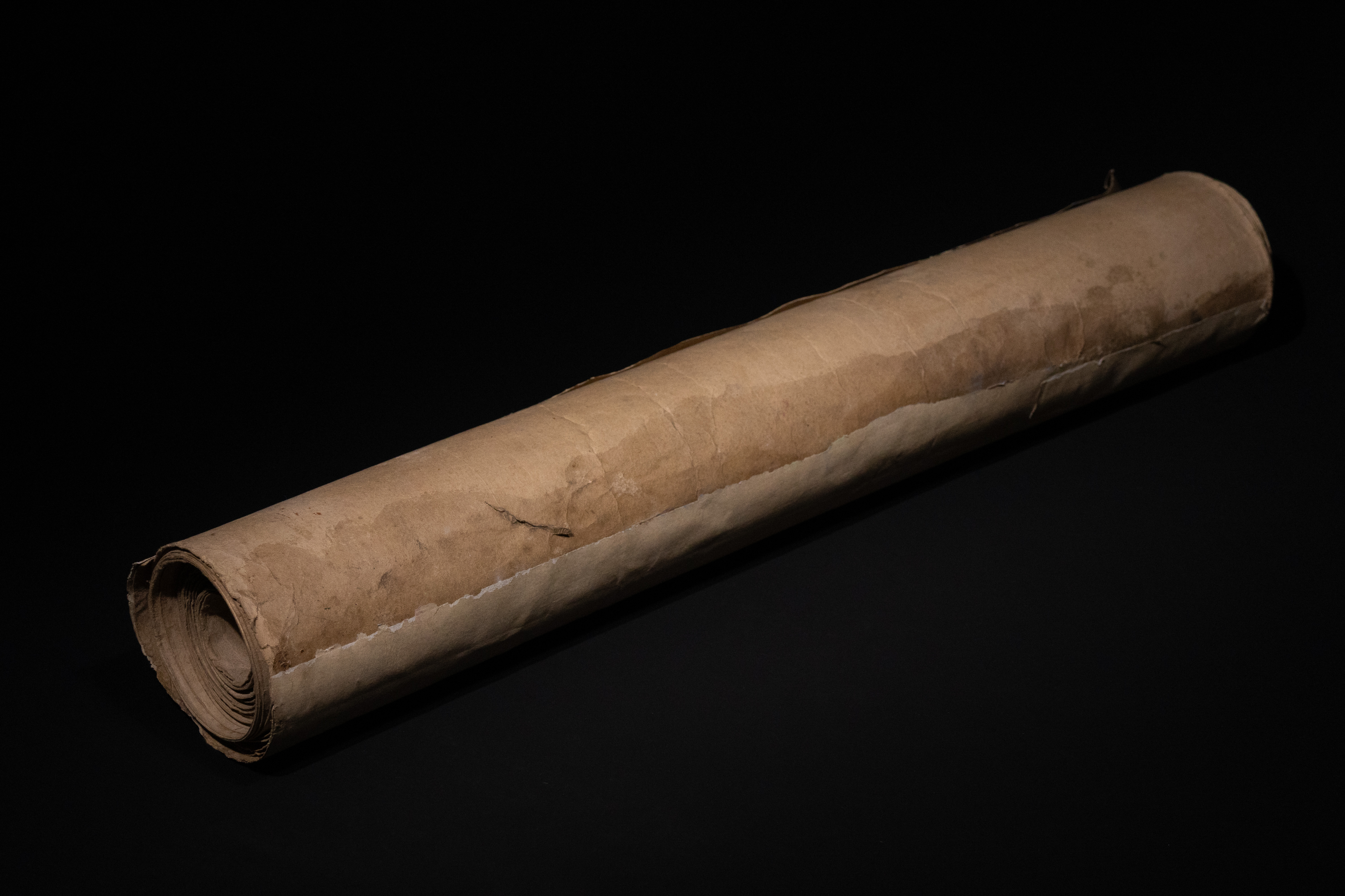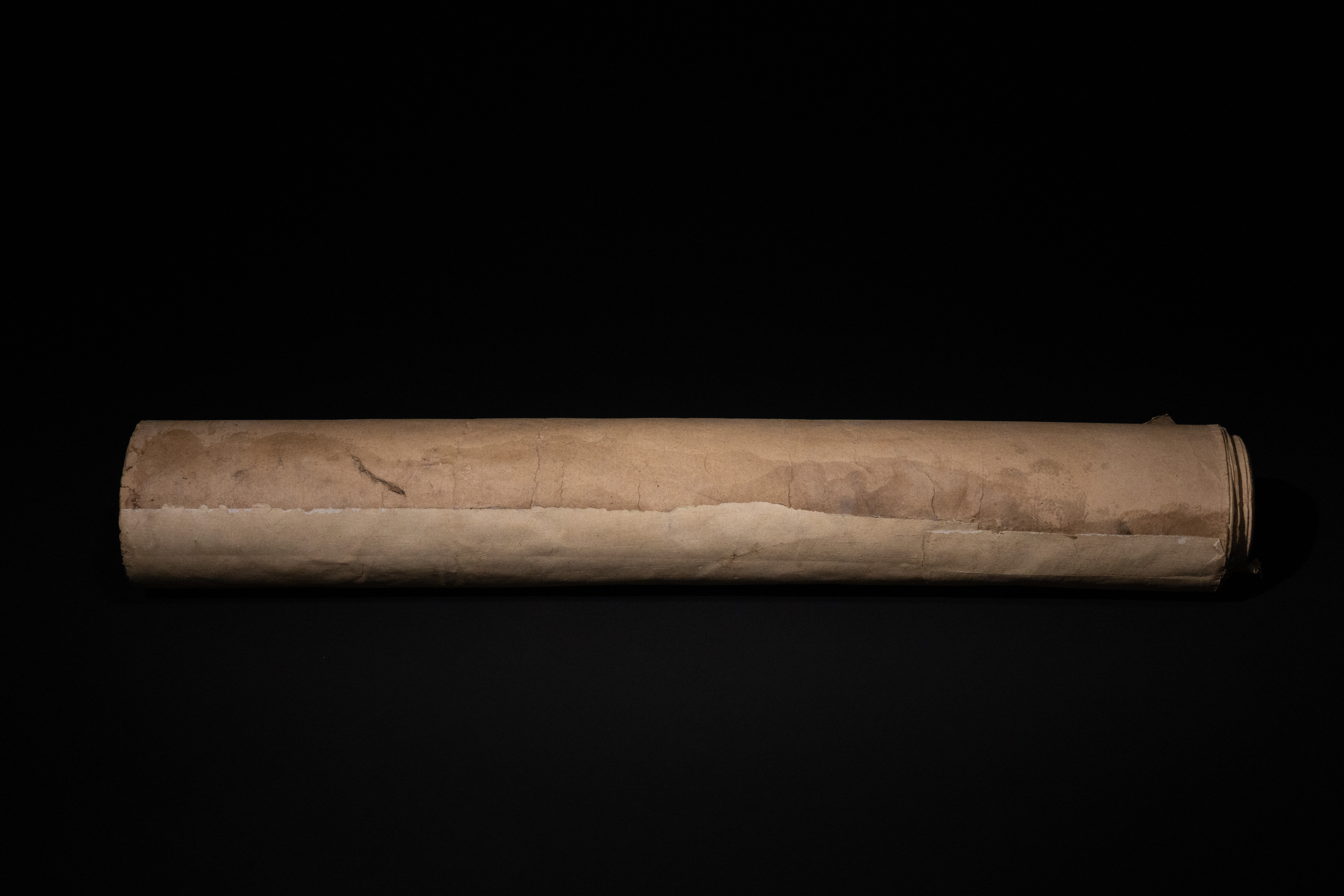 Significant age-related wear, including extensive discoloration, creasing, and notable tears and losses to the paper, particularly in the central areas of the scroll. Pigment and gold losses are also present.