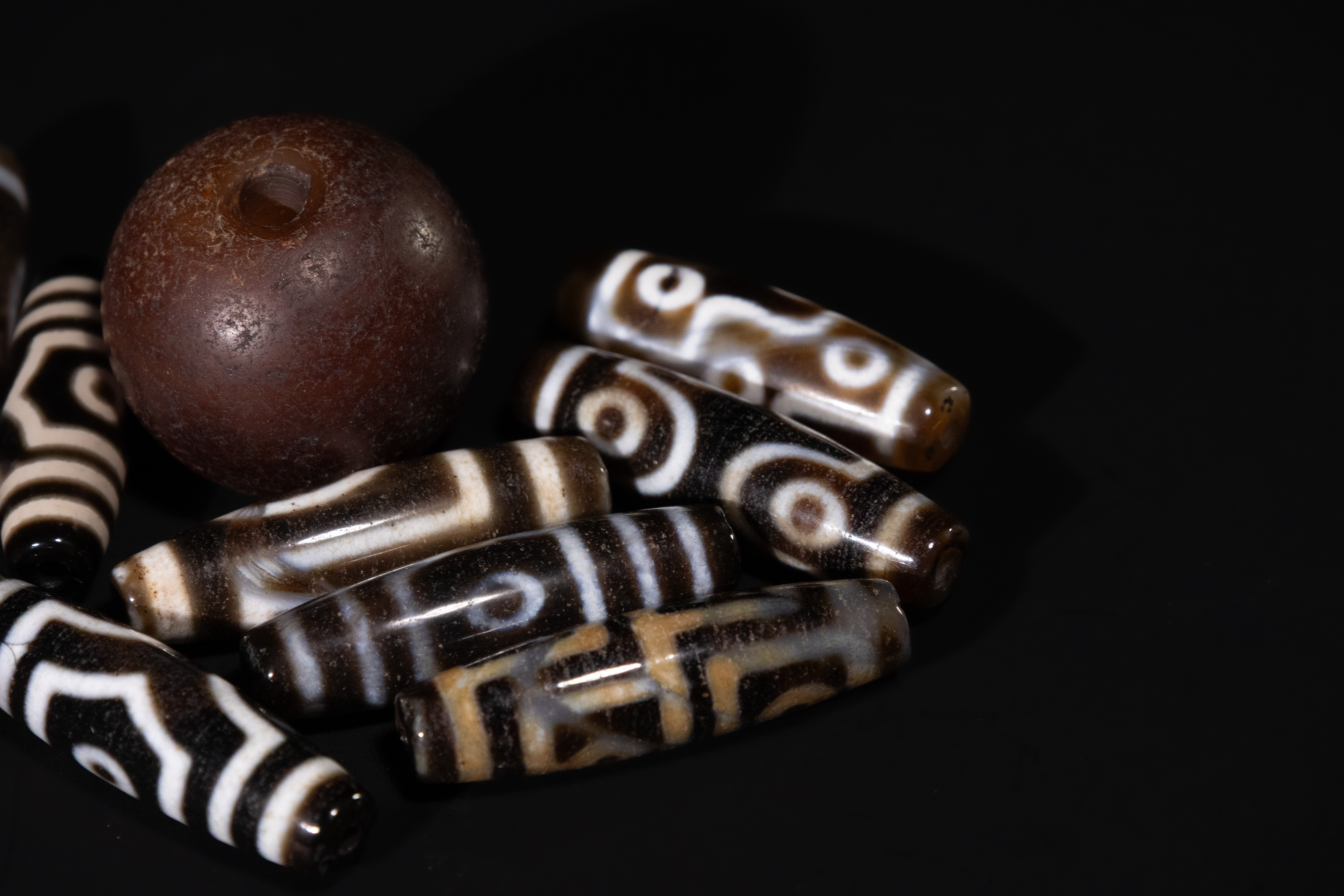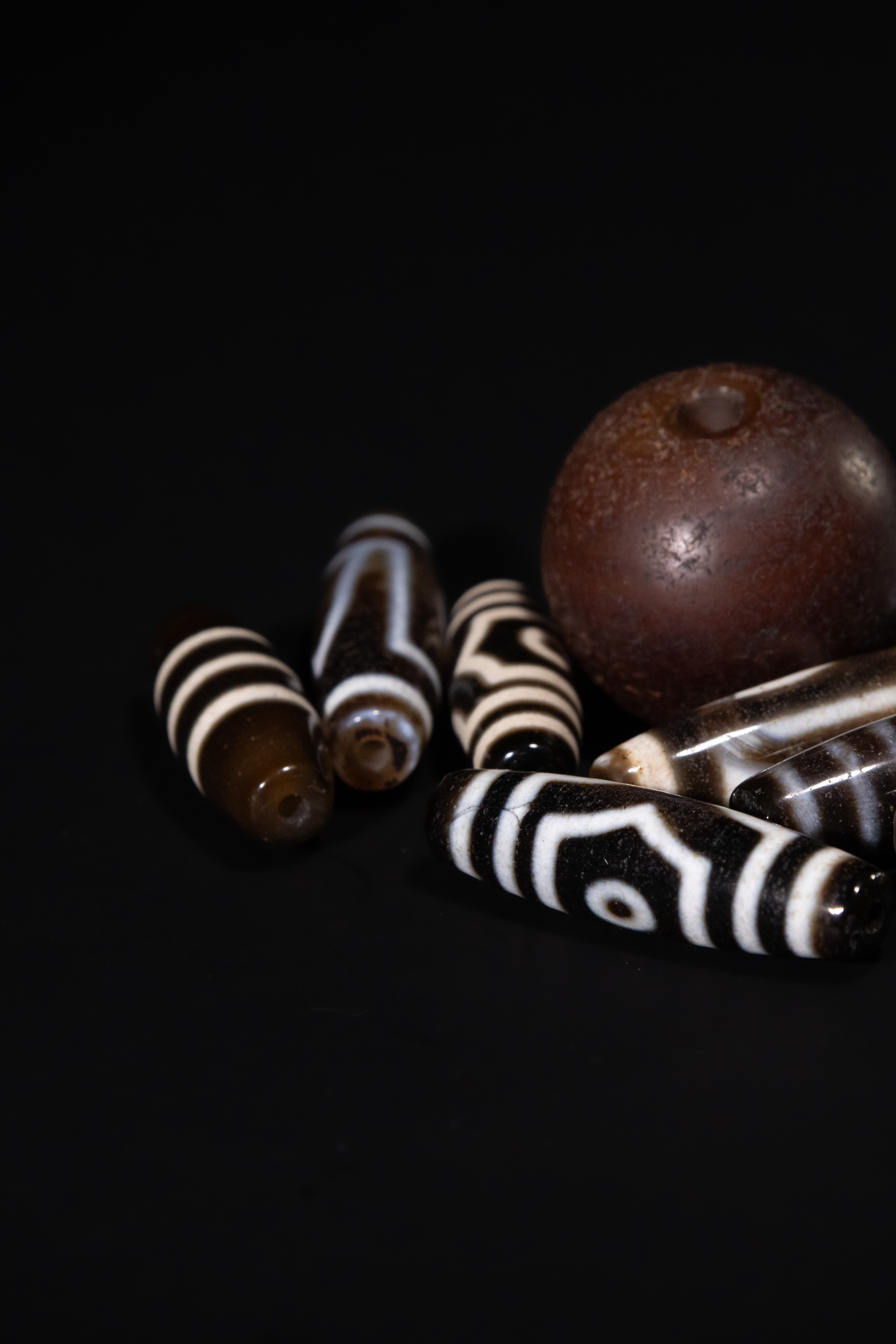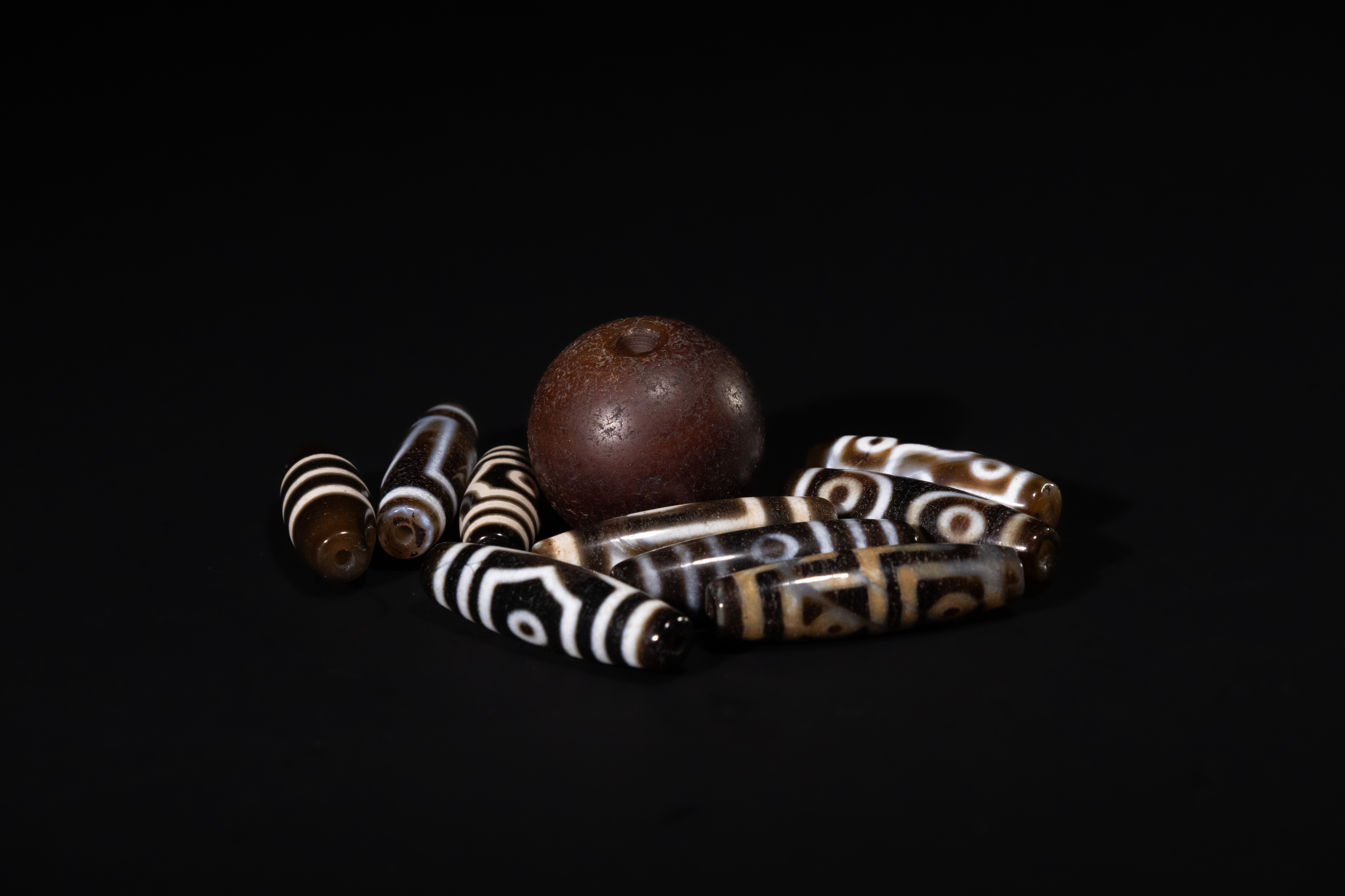 A collection of ten Tibetan Agate Dzi beads. Comprising one large, spherical, matte dark brown bead and nine elongated, cylindrical or barrel-shaped beads. The smaller beads are crafted from polished, translucent banded agate, featuring intricate black and white (or dark brown and cream) ‘eye’ patterns, concentric circles, and geometric designs characteristic of Dzi beads. All beads are centrally drilled.