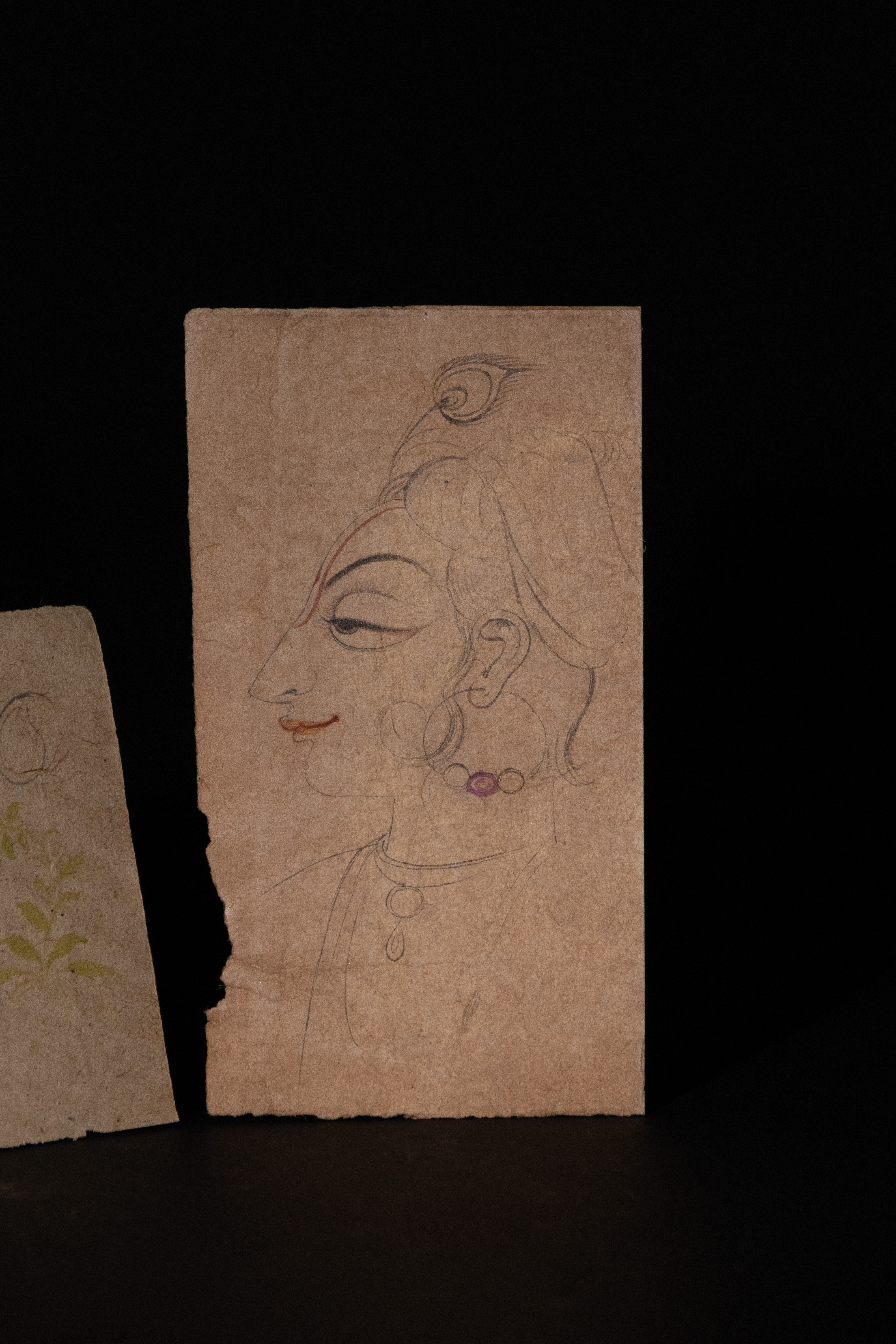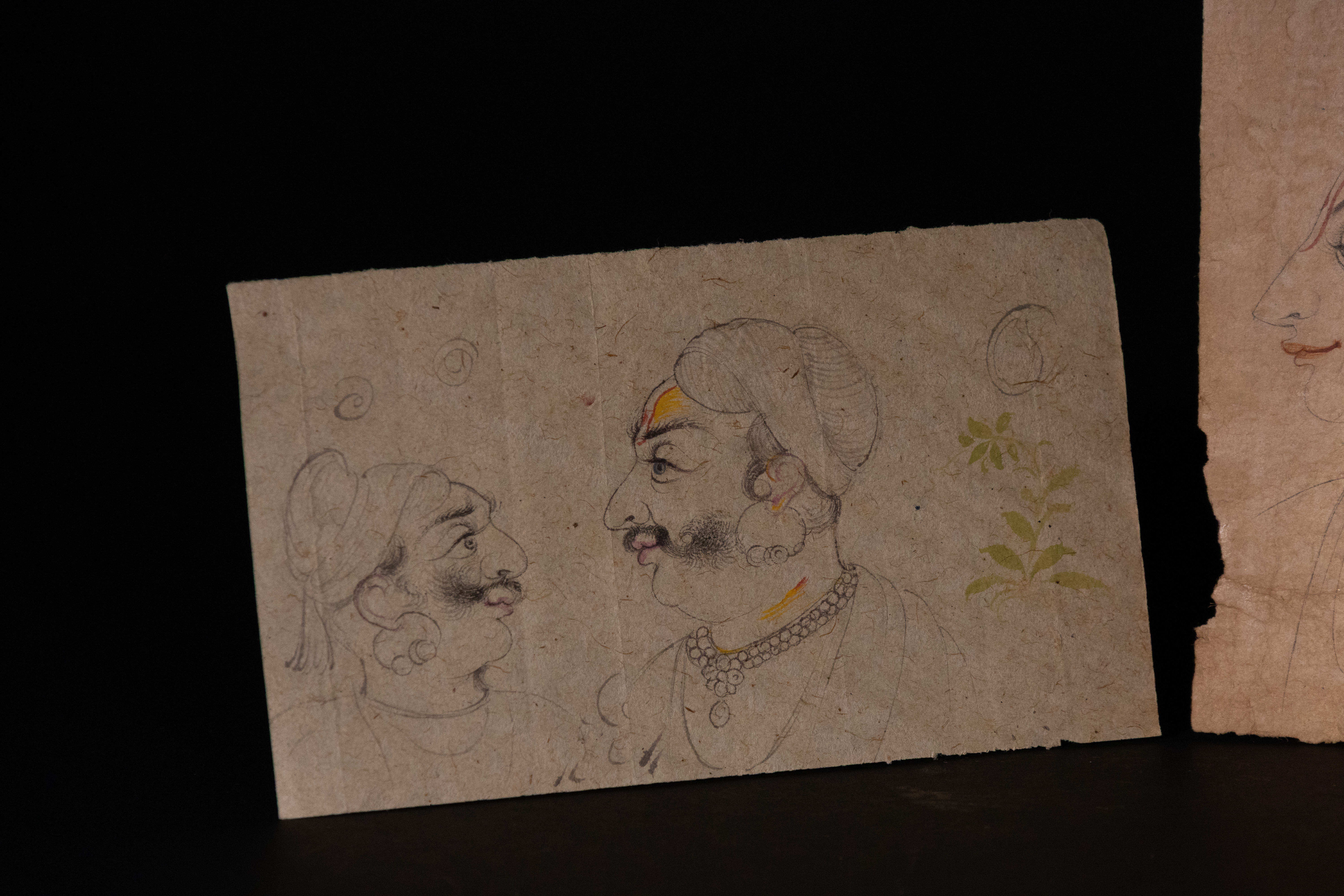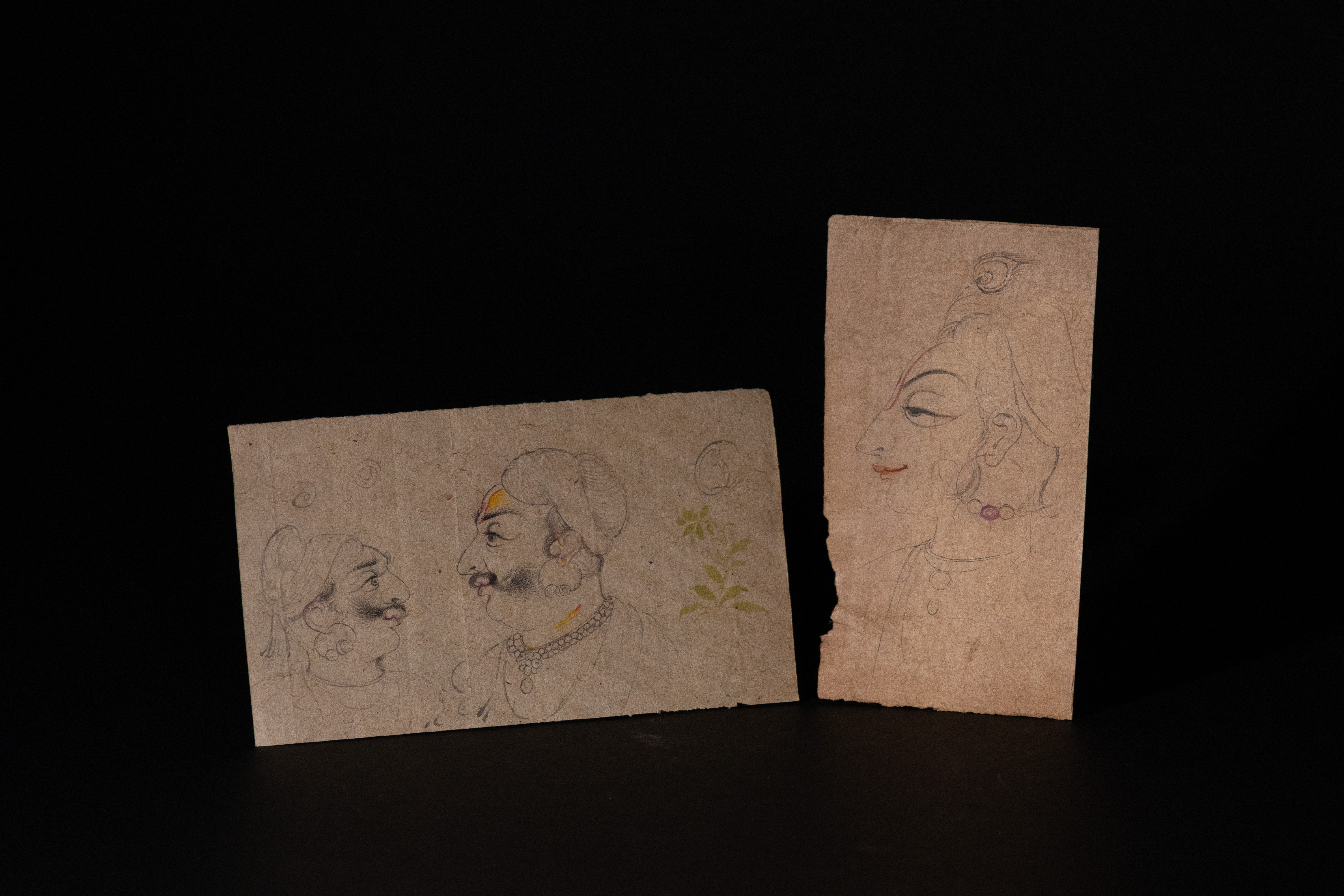 A Pair of Indian School, 18th/19th Century preliminary sketches, executed on aged, fibrous handmade paper, consistent with the style of Indian miniature painting. The first, a horizontal piece, depicts two male figures in profile, adorned with turbans, mustaches, and jewelry, rendered in fine dark ink or pencil with subtle yellow and green pigment accents. A faint Devanagari character resembling ‘श’ (sha) is visible in the upper right corner. The second, a vertical sketch, portrays a single male figure in profile with an elaborate coiffure, jeweled ear ornament, and delicate facial features, executed in similar dark ink or pencil with minimal red detailing. A faint numeral ‘2’ is present in its upper right.