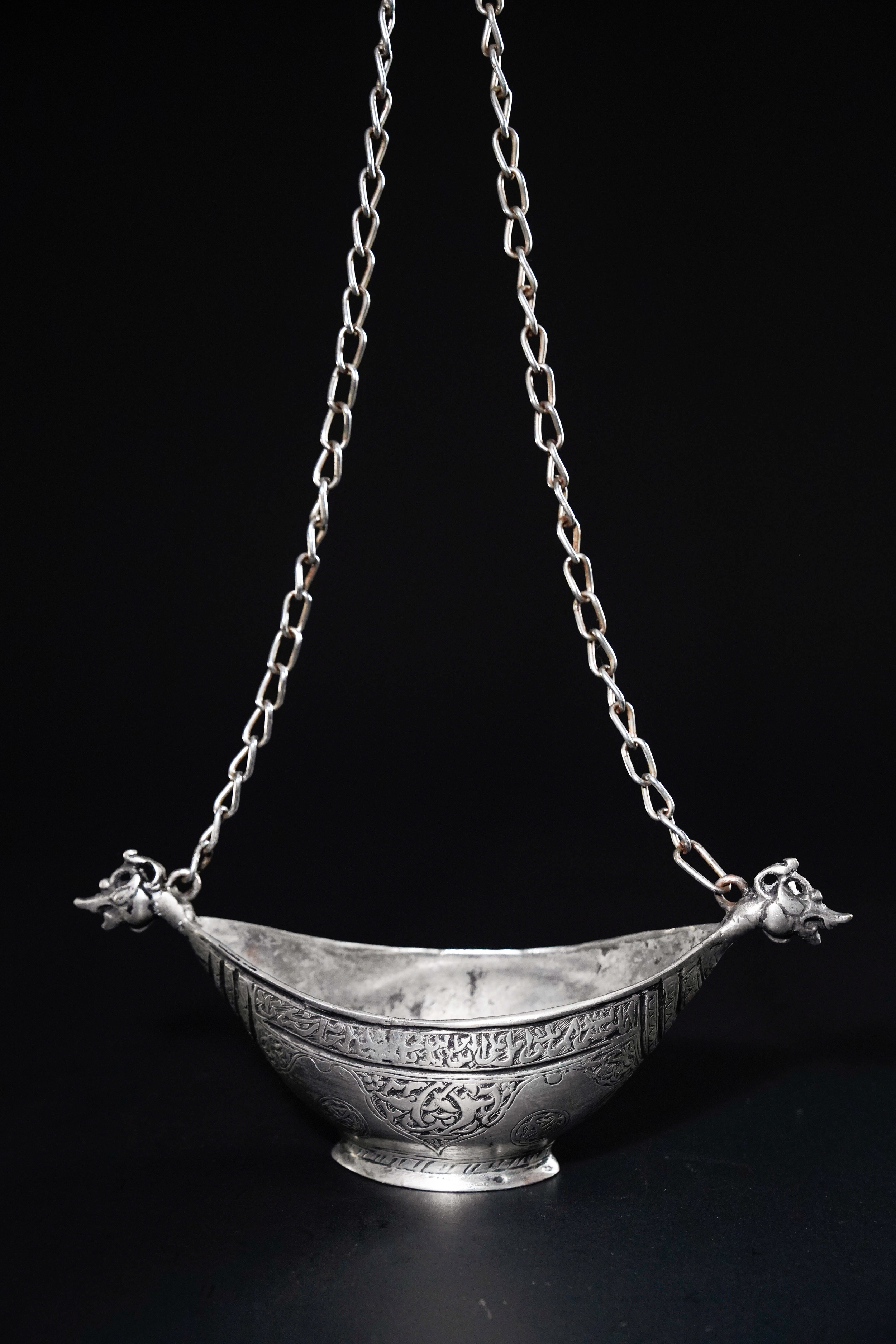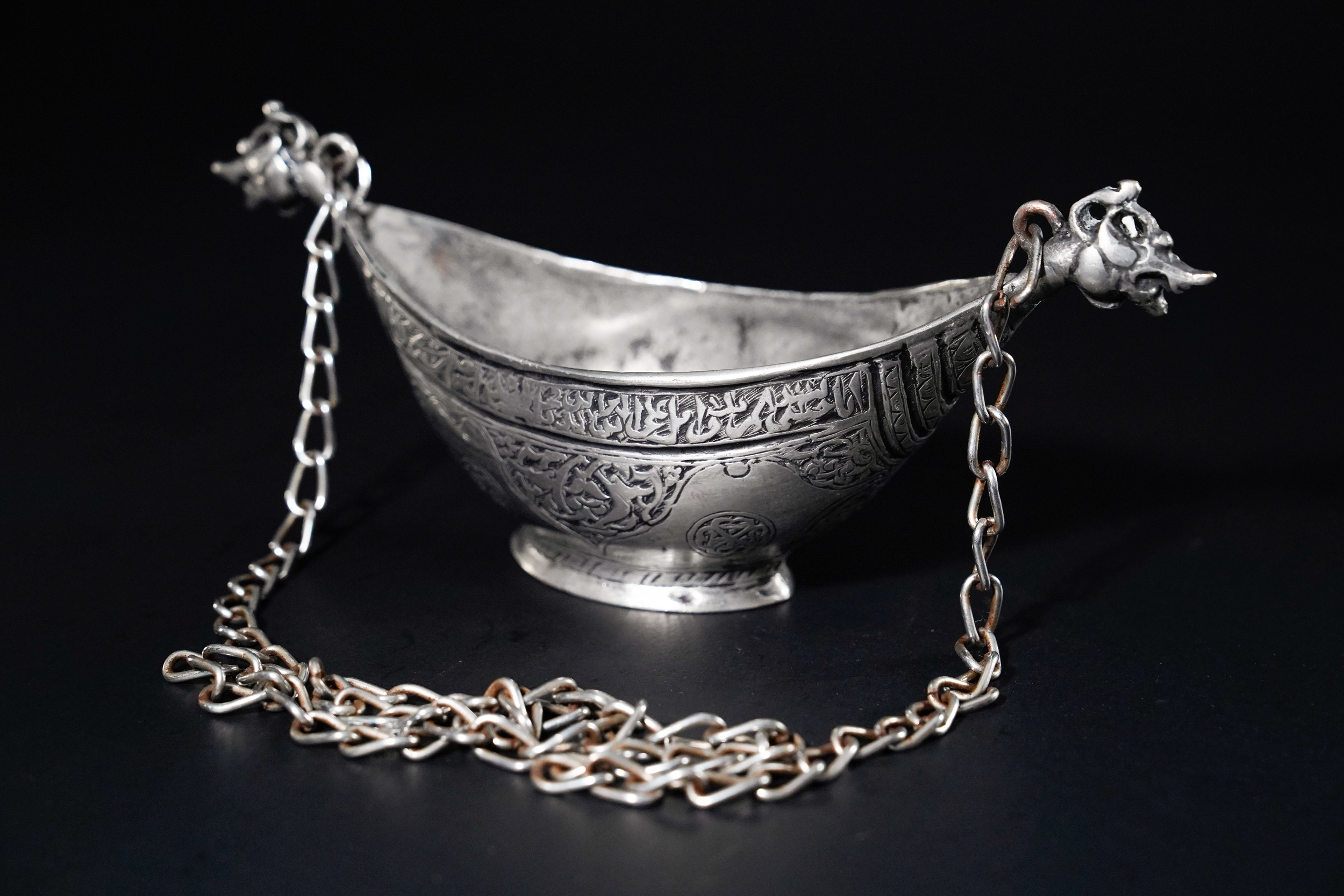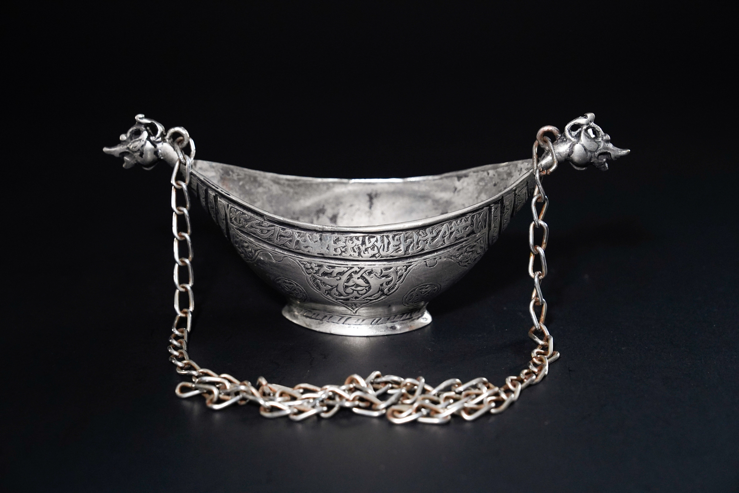 A Safavid Copper Kashkul Beggar’s Bowl with Chain Suspension, 17th Century.