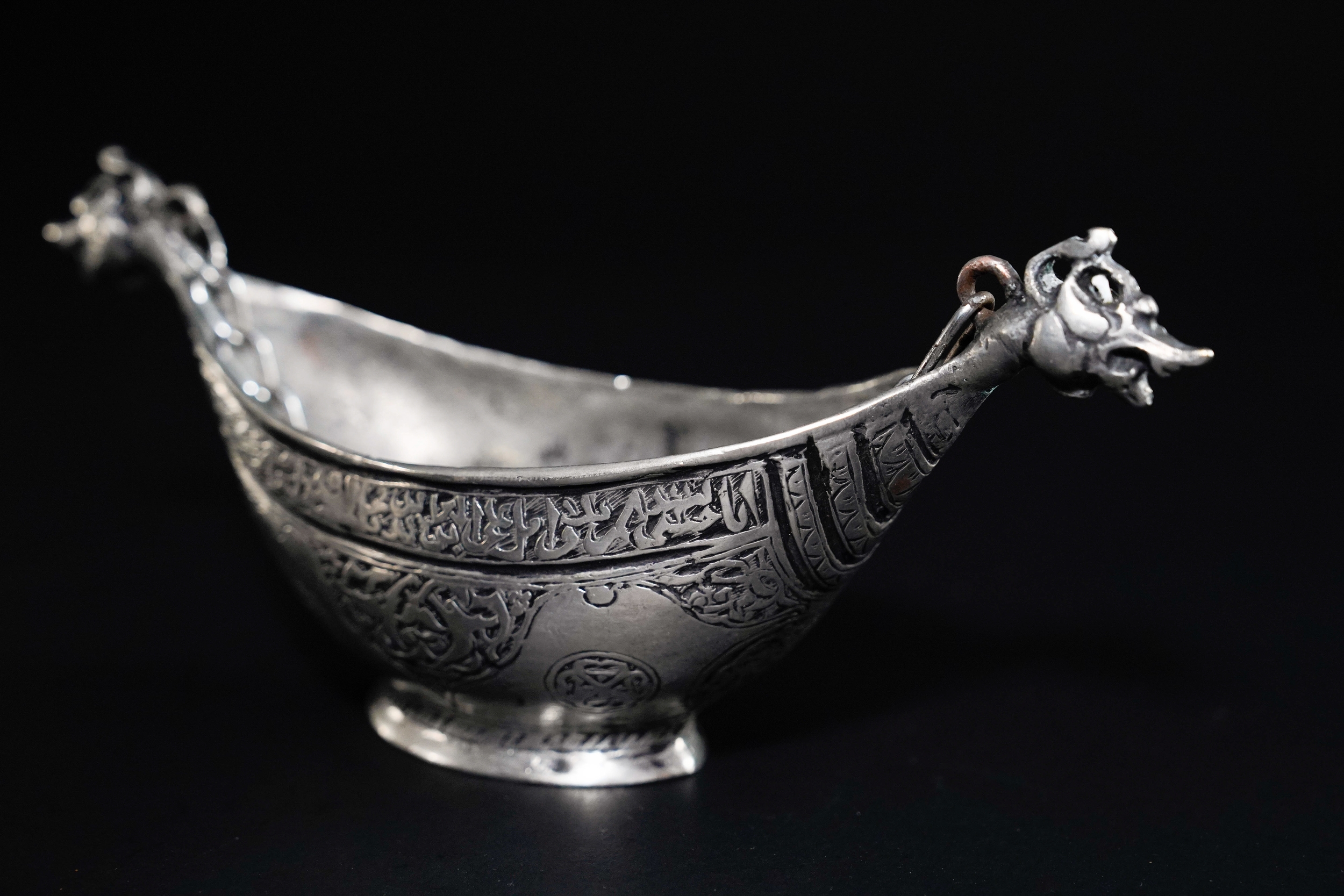 A finely crafted Safavid copper kashkul elegantly shaped in the traditional boat-like form. The vessel is extensively engraved with cartouches of flowing naskh script bordered by floral scrollwork, and features two finely cast dragon-head terminals from which a chain is suspended. Raised on a small oval foot with engraved decoration around the base.