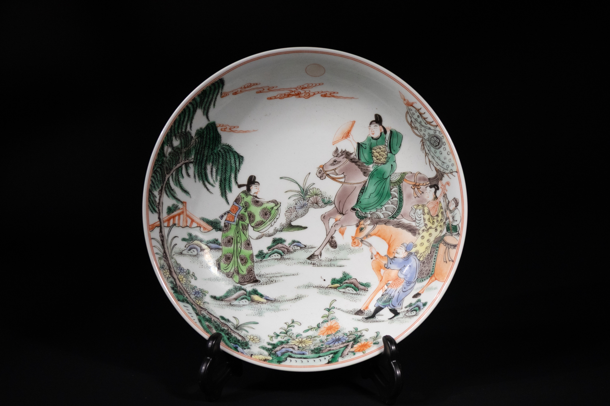 The dish is painted in vibrant famille verte enamels with a courtly scene depicting noble figures on horseback and attendants in a garden landscape. The central scene features finely rendered robes, a willow tree, distant mountains, and a bridge under a rising sun. The reverse is adorned with scattered floral sprays and a neatly drawn six-character mark, possibly indicating the period or origin of the piece.