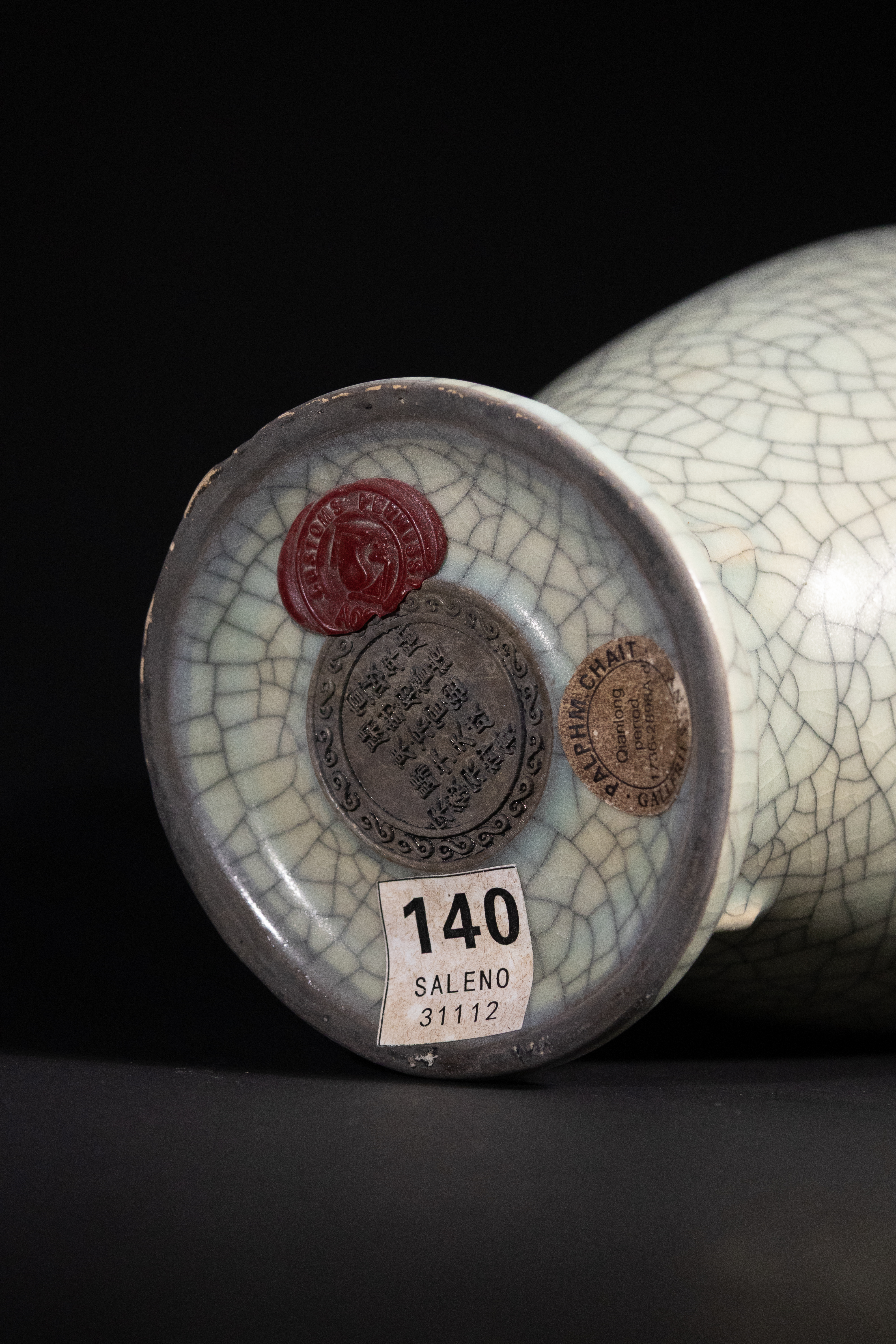 A celadon-glazed ceramic vase of baluster form with a flared rim and foot, exhibiting a pale grey-green celadon glaze uniformly patterned with a fine, dark crackle network. The base reveals an unglazed foot rim, multiple Chinese seal marks, a red wax seal, a ‘P. & F. CHATT BALHAM ENGLAND’ sticker, and a ‘SALENO 140’ inventory number. The vase is accompanied by a custom-fitted wooden storage box, marked with a vertically inscribed Chinese text ‘廣州十三行’ (Guǎngzhōu Shísānháng), translating to ‘Canton Thirteen Factories’ or ‘Canton Thirteen Hongs’, and featuring an affixed historical photographic print.