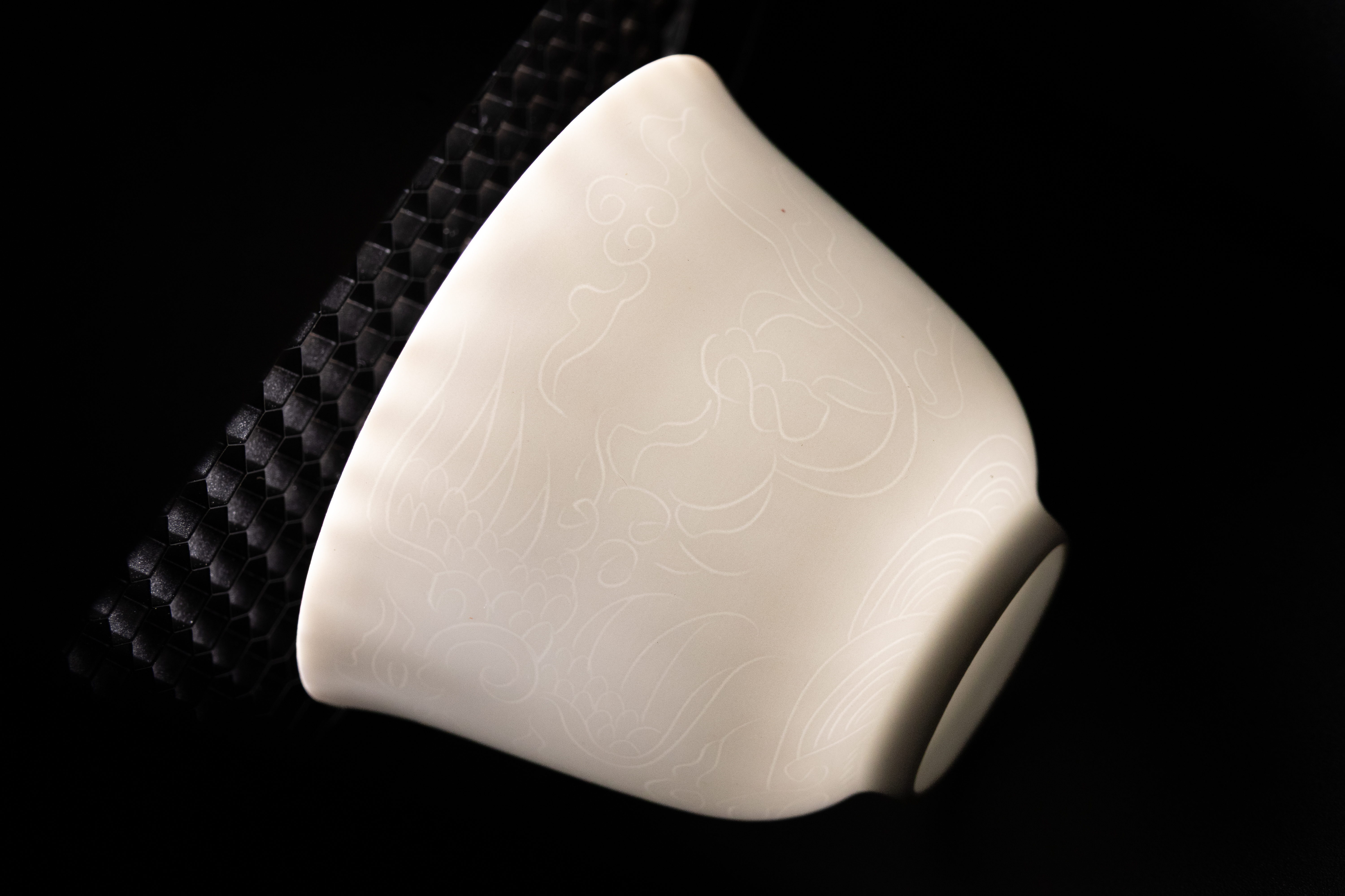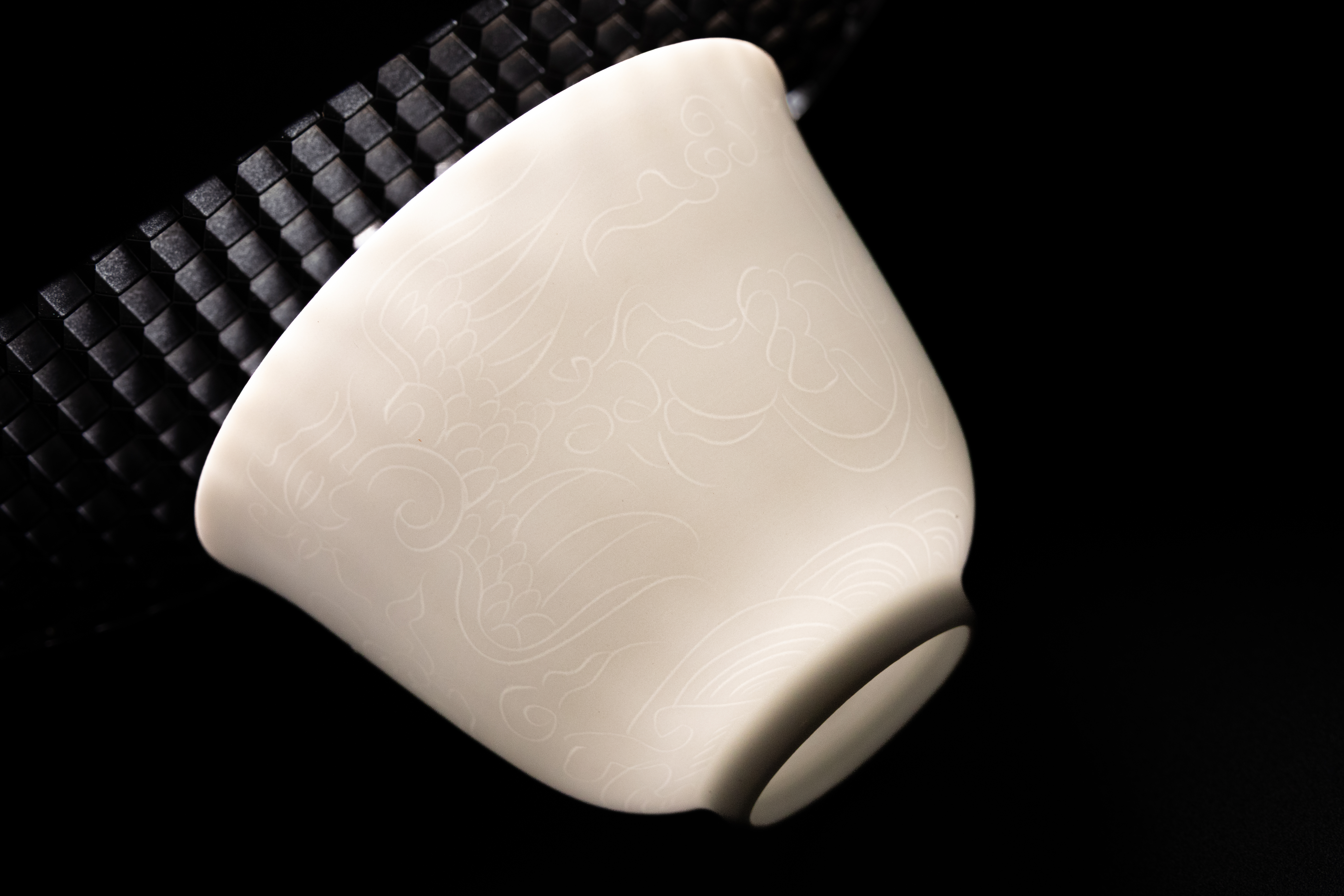 Lot 28: A Pair of Chinese White Glazed Porcelain Cups with Anhua Dragon and Phoenix Decoration, Possibly Kangxi Period