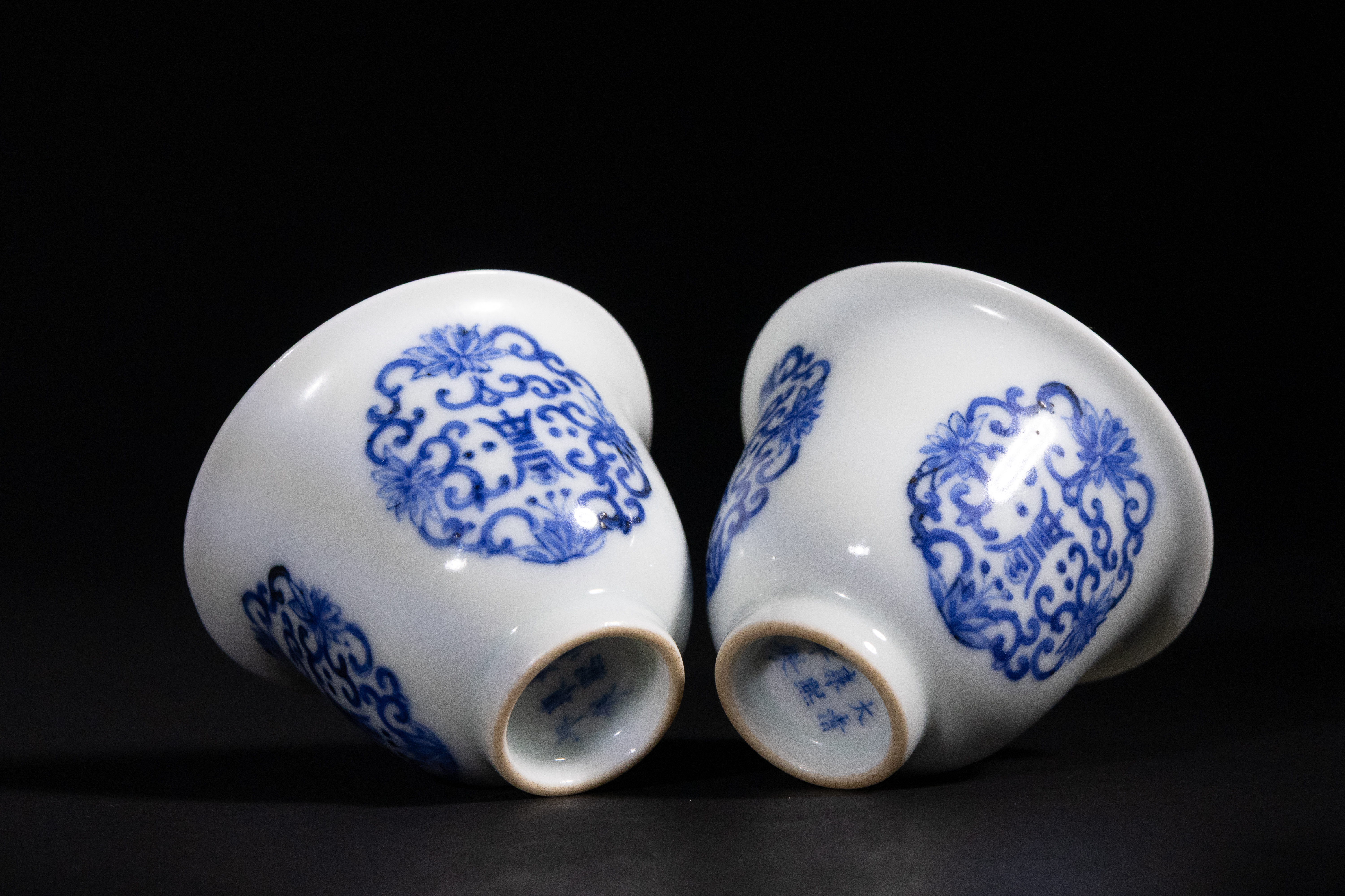 Lot 29: A Pair of Chinese Blue and White Porcelain 'Shou' Medallion Cups, Kangxi Mark