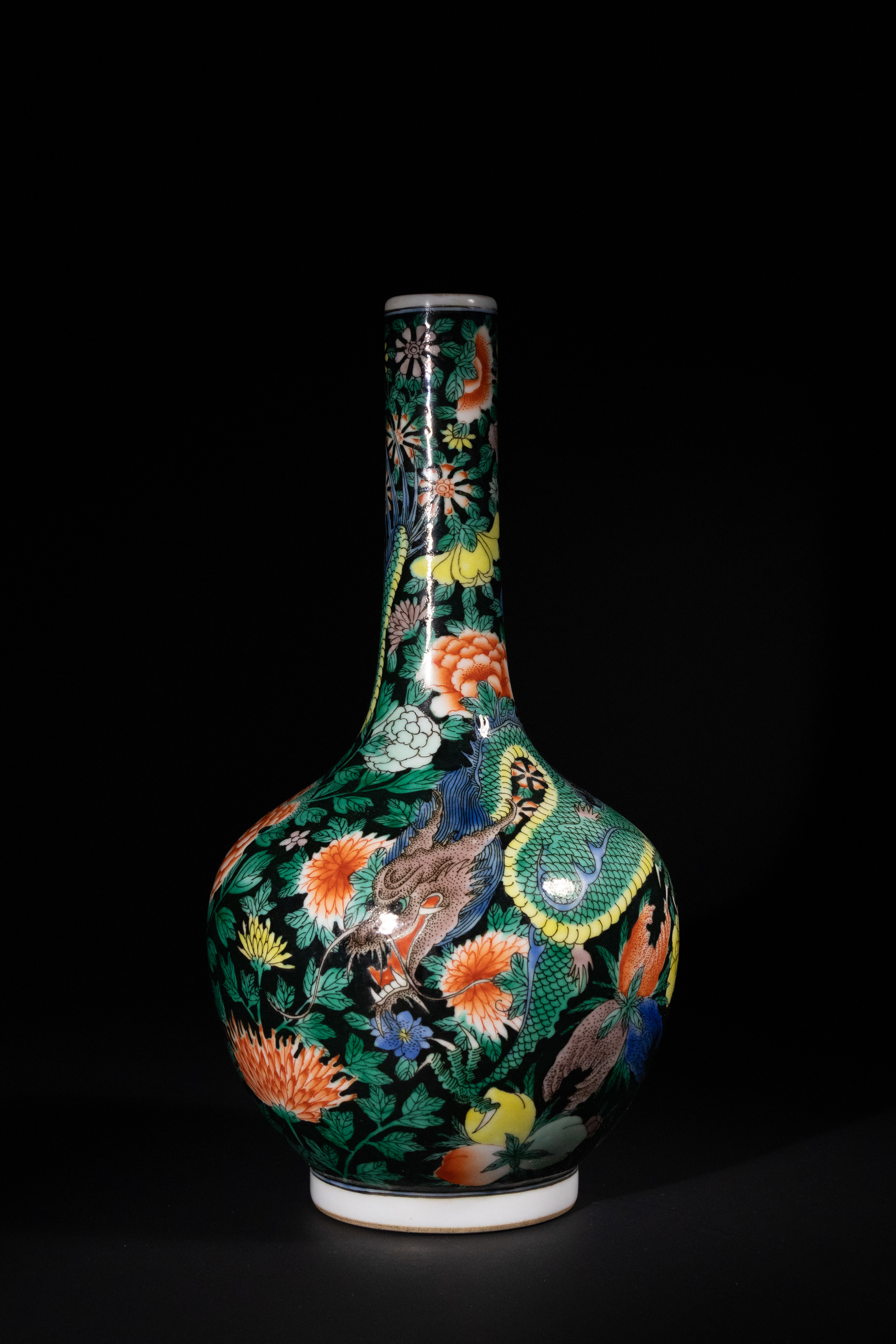 Lot 30: A Chinese Wucai Porcelain Dragon Flower Bottle Vase, Kangxi Mark