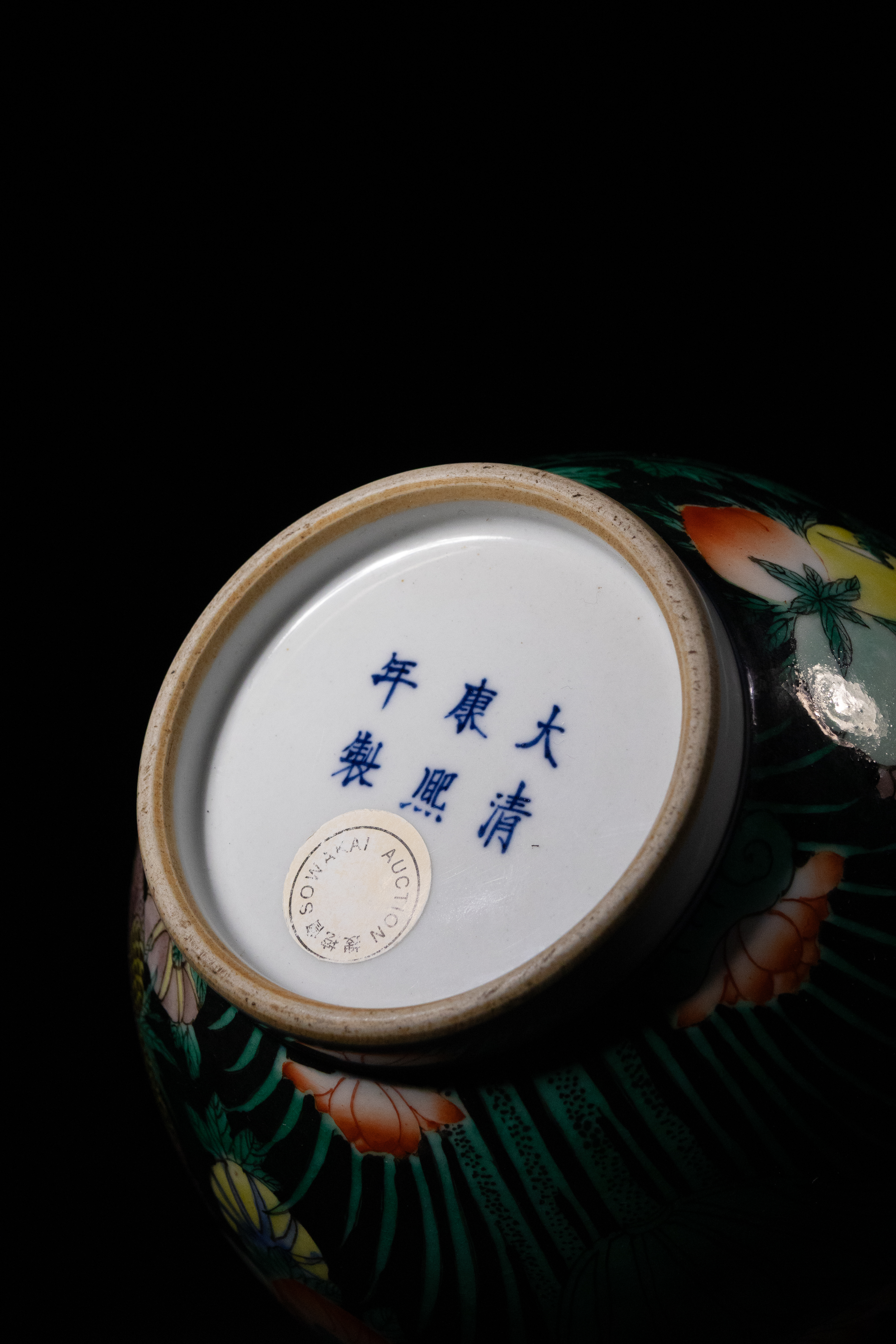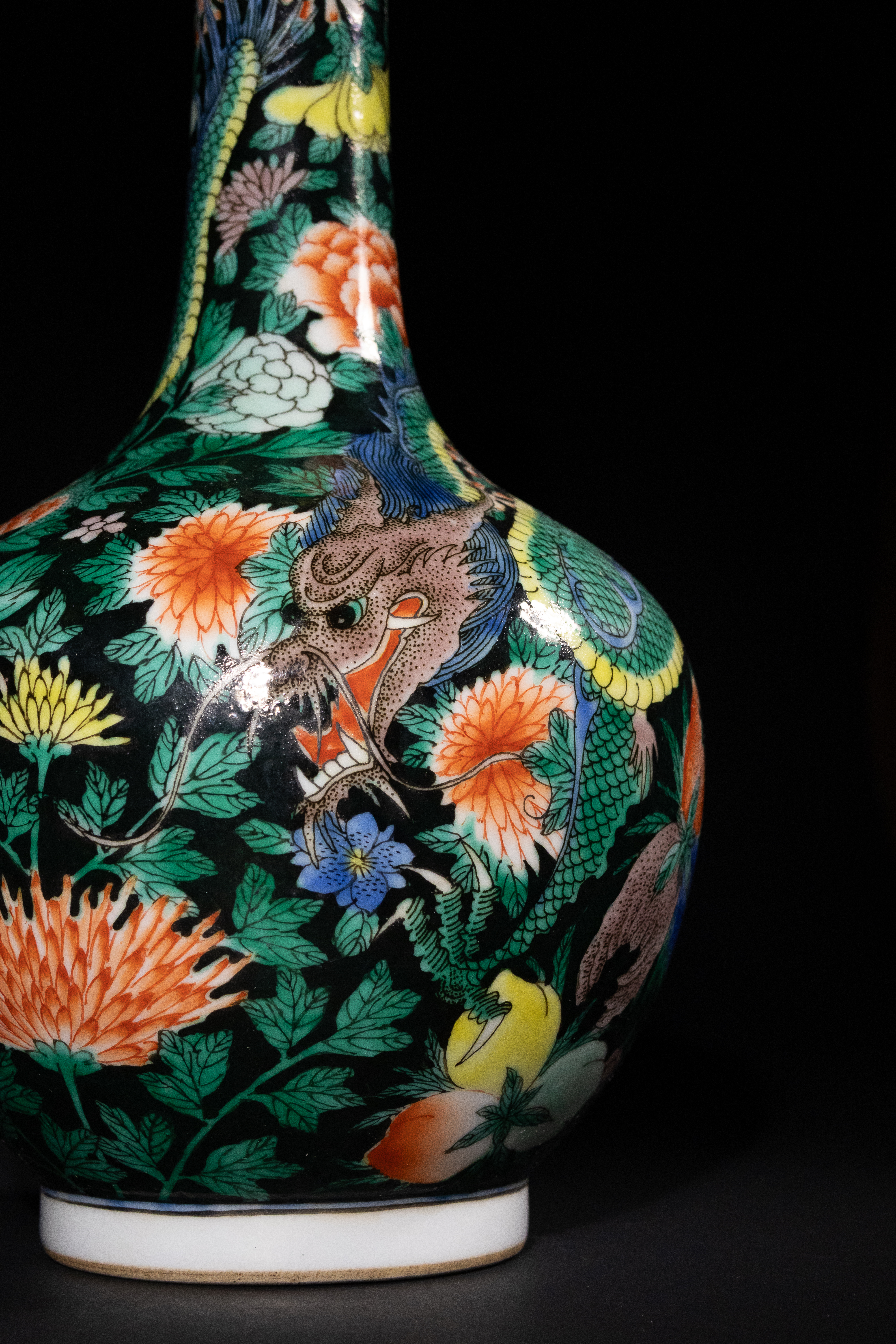 A Chinese porcelain bottle vase, identified through market consensus as a Kangxi Marked Wucai Porcelain Dragon Flower Bottle Vase. It features a globular body and a tall, slender neck, decorated with intricate polychrome enamel designs on a lustrous black ground. The vibrant decoration depicts two five-clawed dragons, one green and one brown/gold, coiling amidst a profusion of auspicious flowers including peonies, chrysanthemums, and lotus blossoms, interspersed with dense foliage. The base bears a six-character underglaze blue reign mark, 大清康熙年製 (Dà Qīng Kāngxī nián zhì), translating to "Made in the Great Qing Dynasty, Kangxi Period."