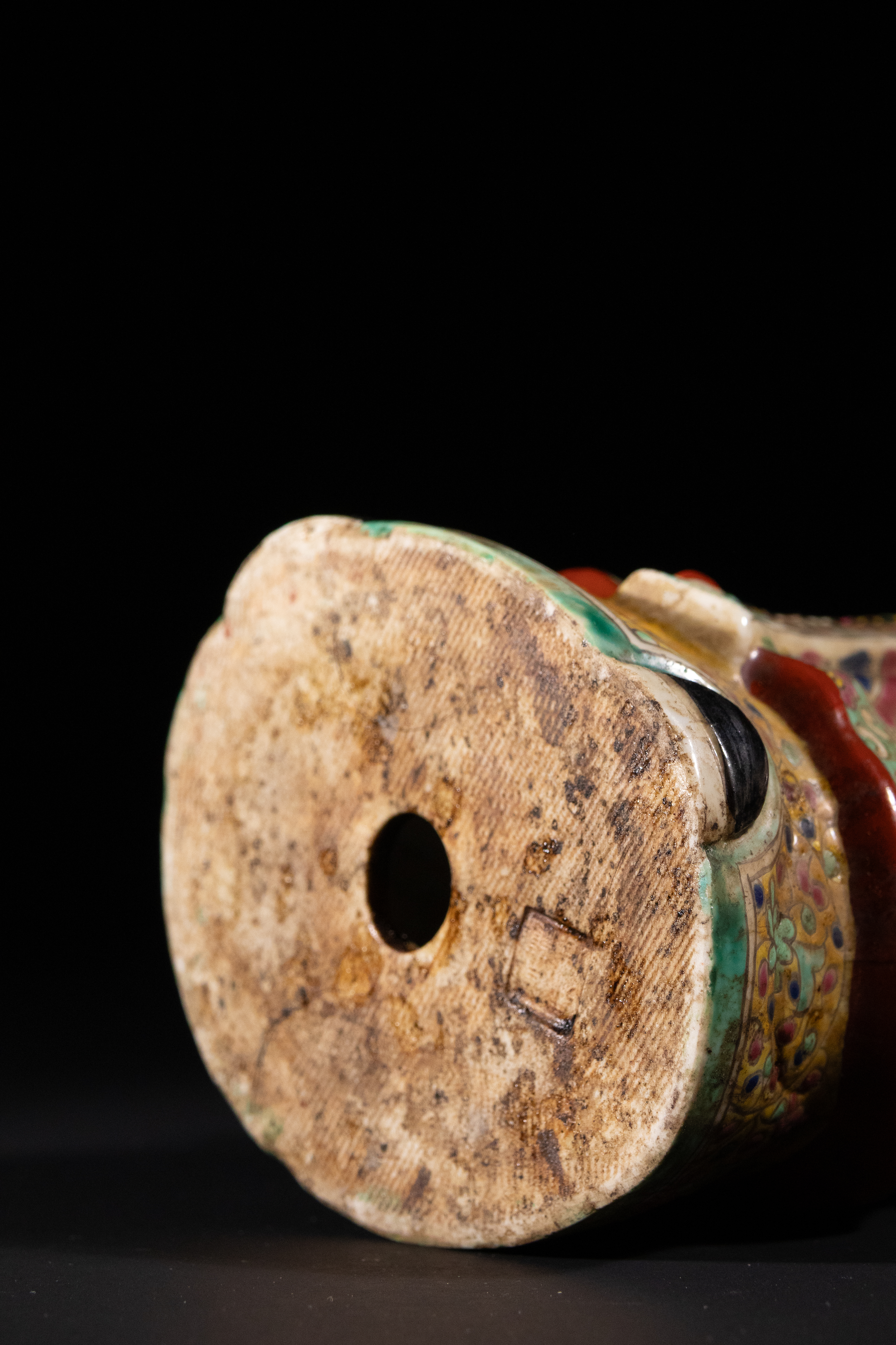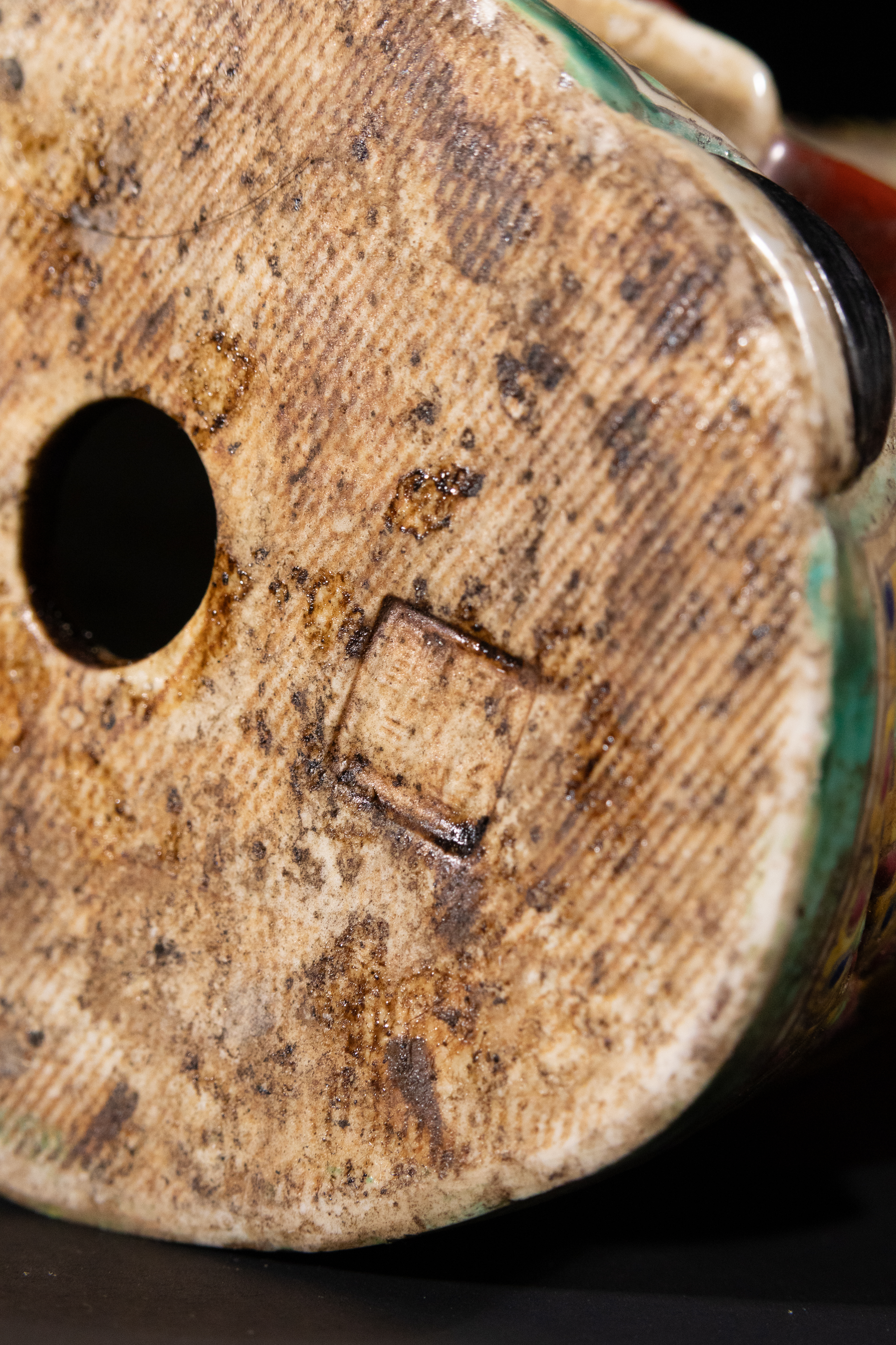 Generally good apparent condition. Enamels are bright. No immediately visible chips or cracks. The unglazed base shows some surface dirt and minor firing imperfections consistent with age.