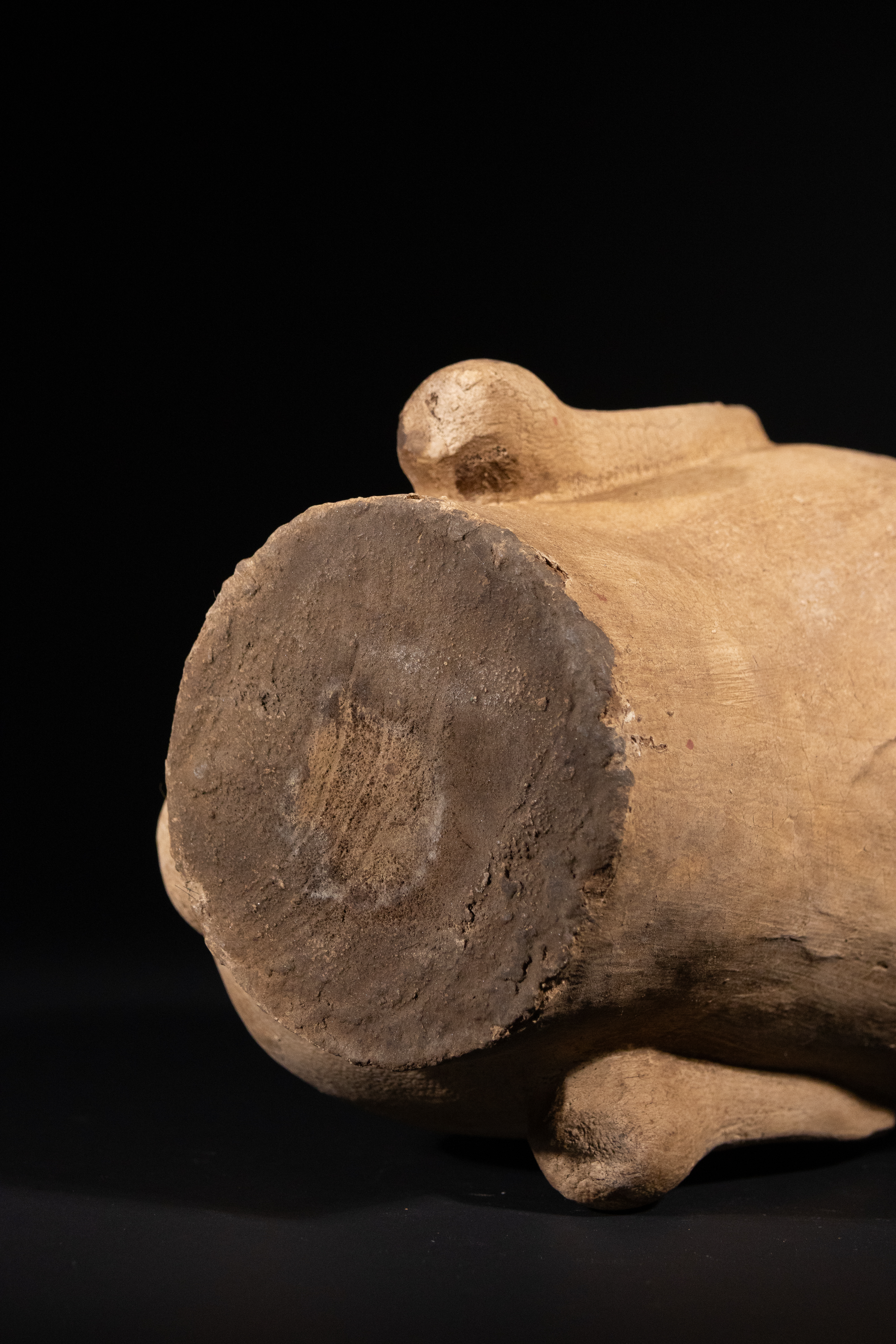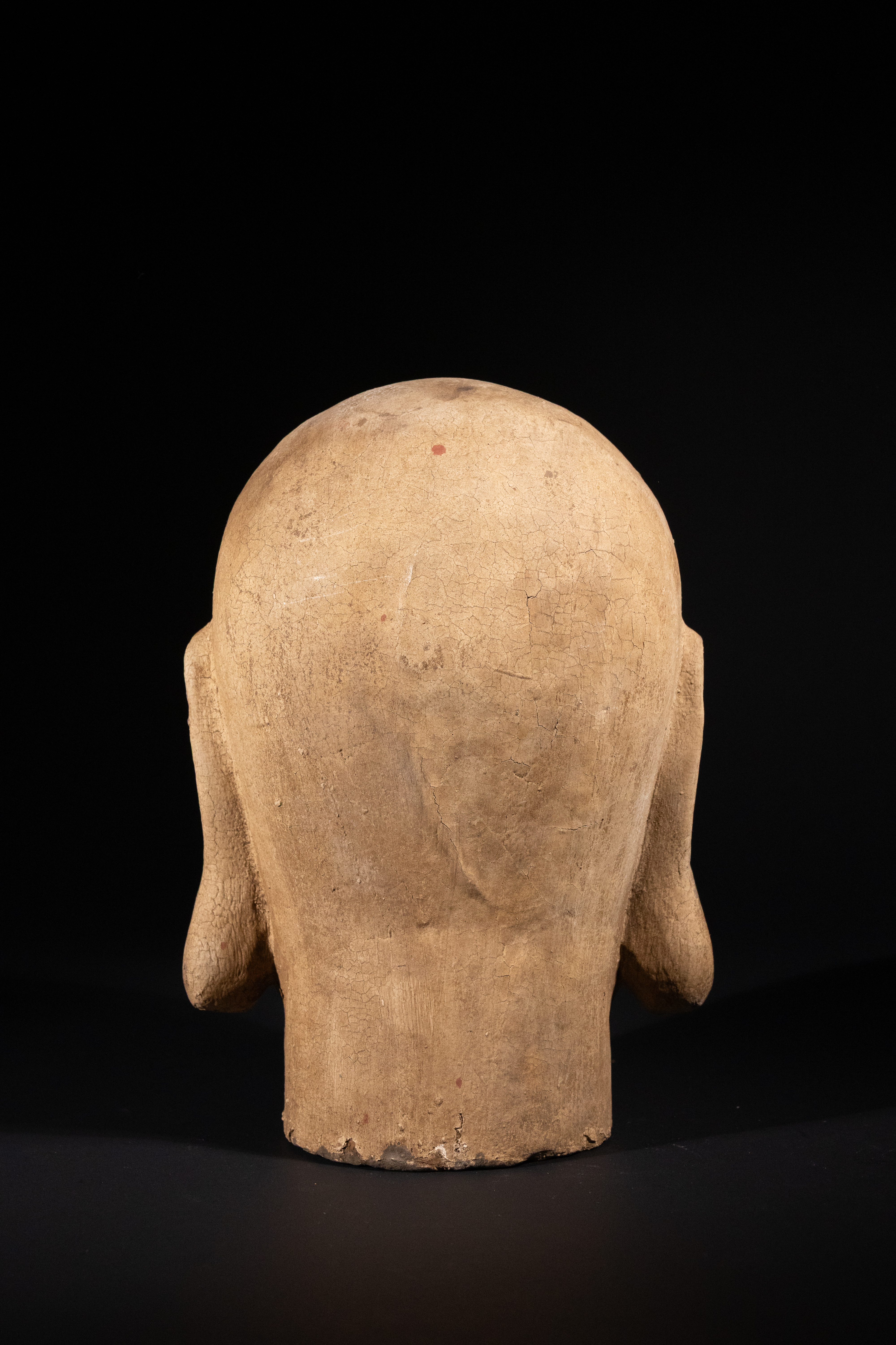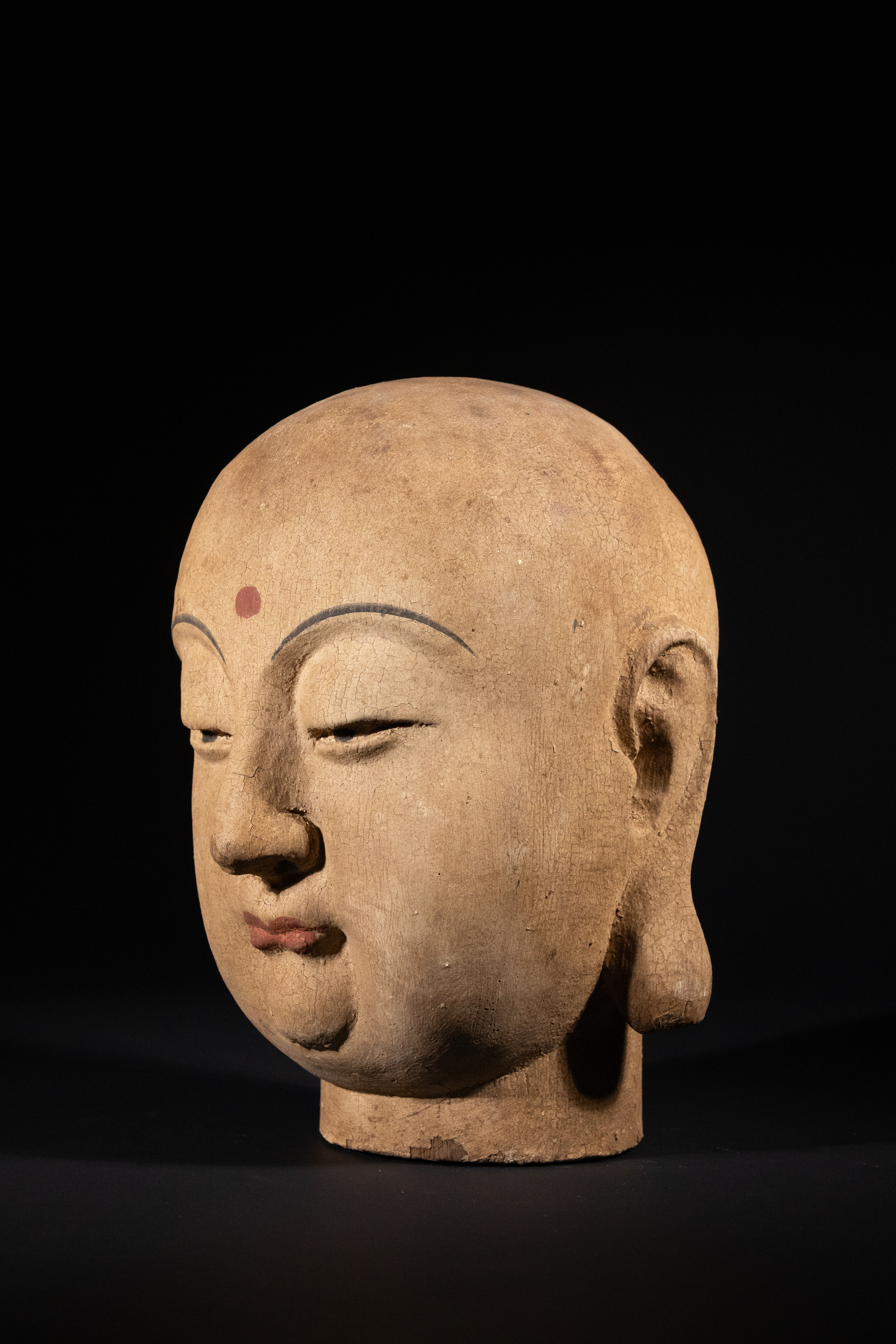 Extensive surface craquelure throughout. Significant loss to original polychromy, particularly across the crown and reverse. The neck exhibits a rough, circular break where it was separated from a larger sculpture.