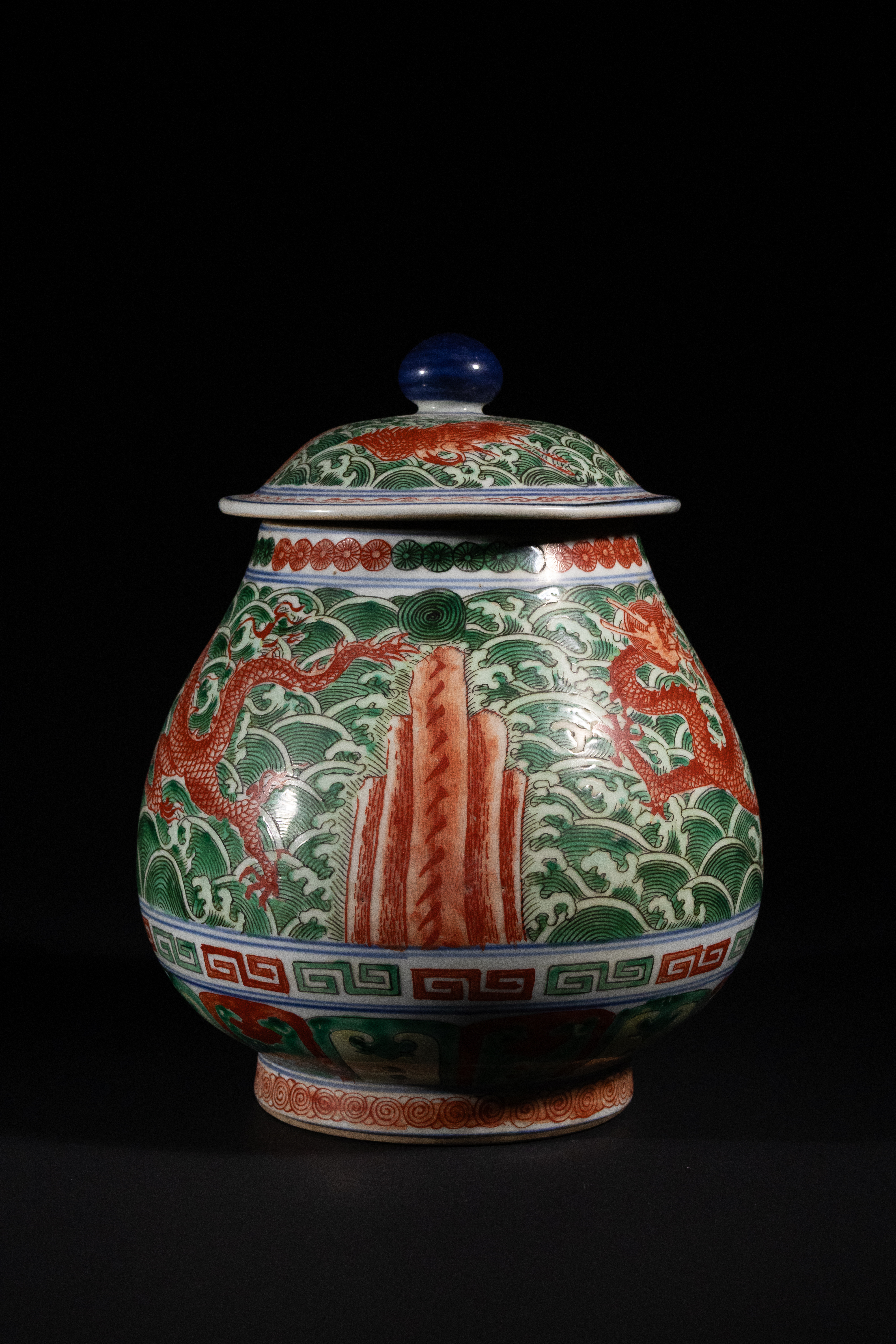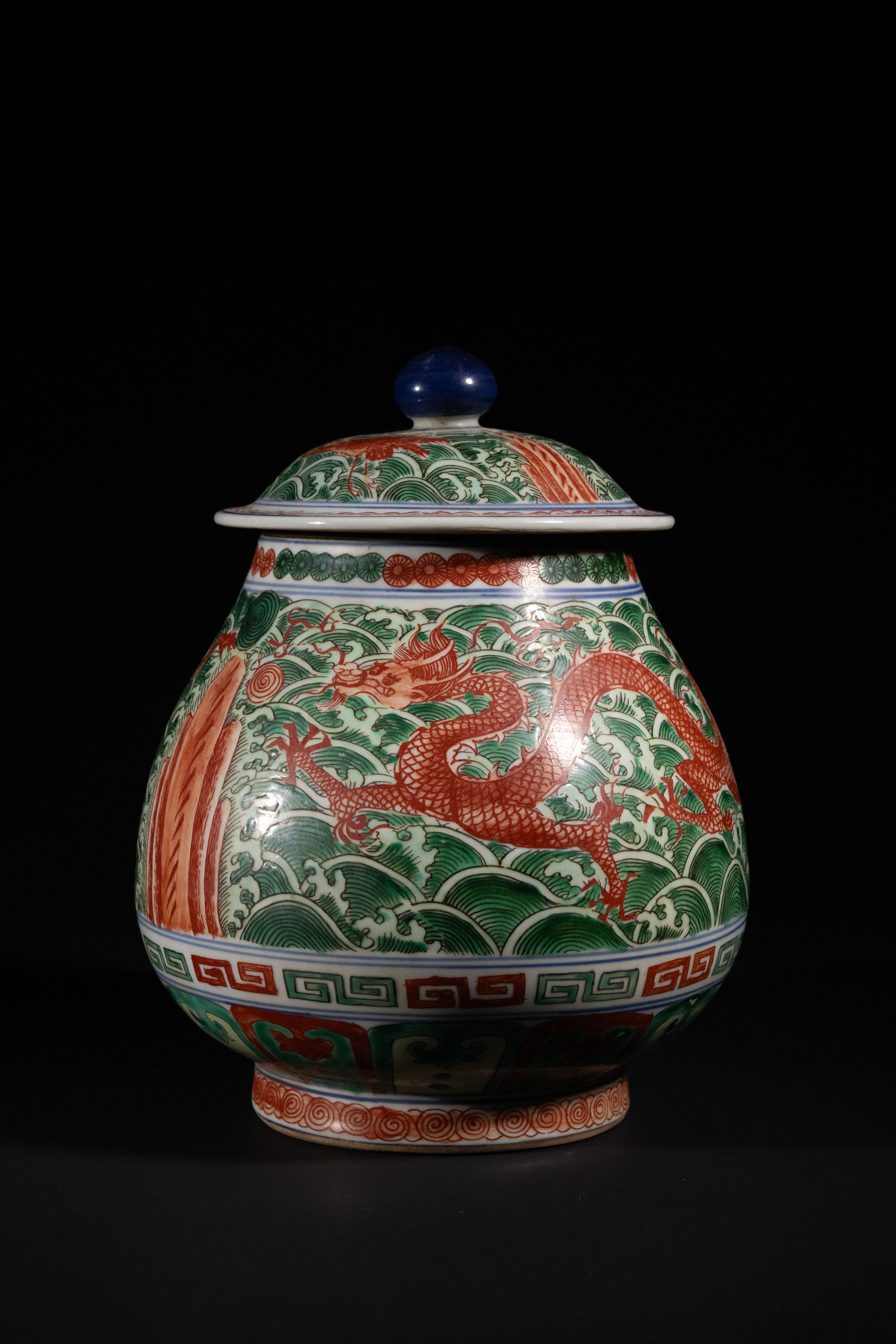 A Chinese Wucai Porcelain Dragon Jar with Lid, featuring a globular body and a domed lid topped with a blue spherical finial. The vessel is adorned with vibrant polychrome enamel decoration, primarily in shades of green and iron red, accented with blue and white. The main body displays two red five-clawed dragons in pursuit amidst turbulent green waves, interspersed with stylized orange-red rock formations. Decorative borders include a blue and white wave band, a red and blue stylized cloud pattern, and a prominent red and blue geometric meander (leiwen) band above the flared foot, which bears red scroll motifs. The lid continues the green wave pattern with red accents.