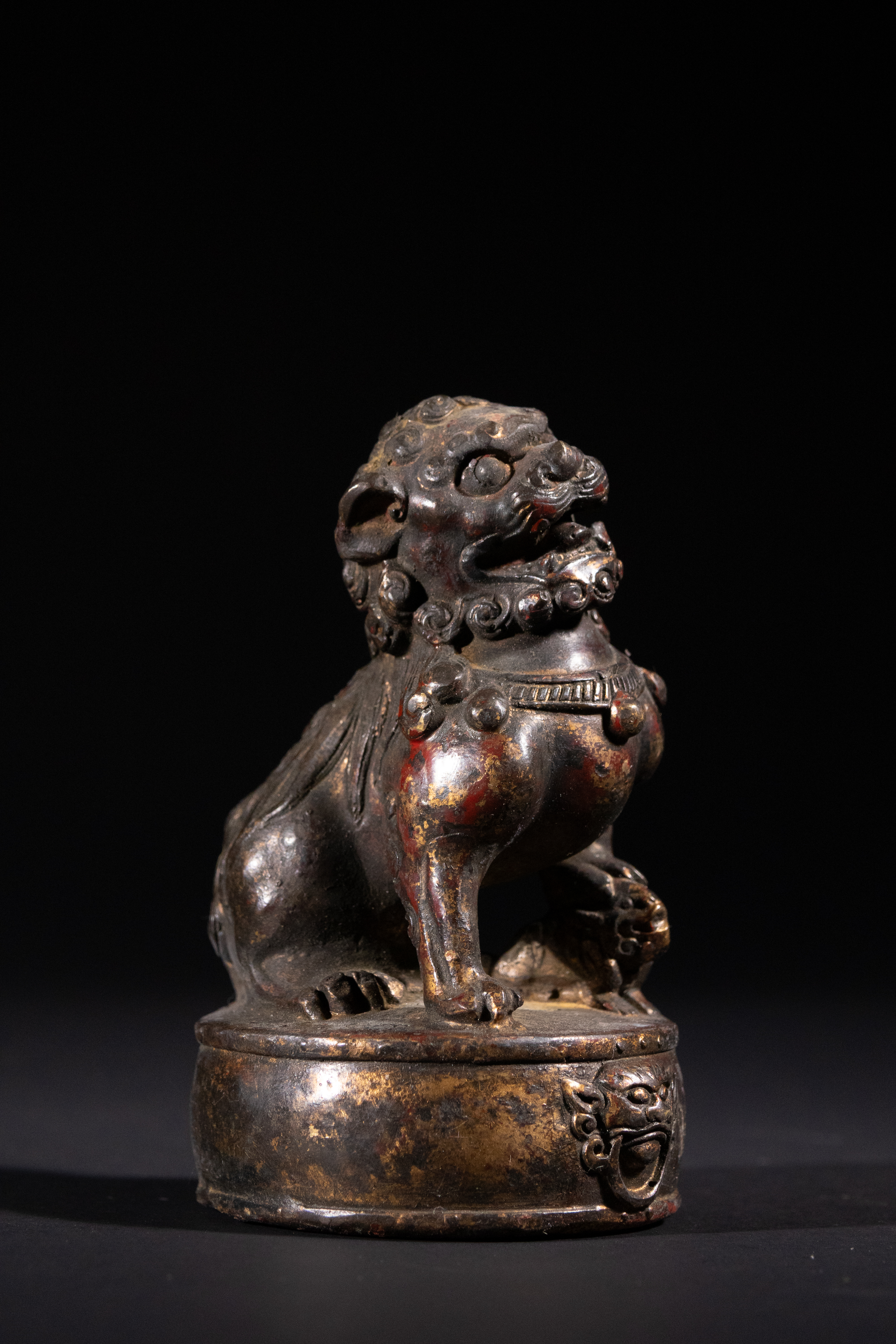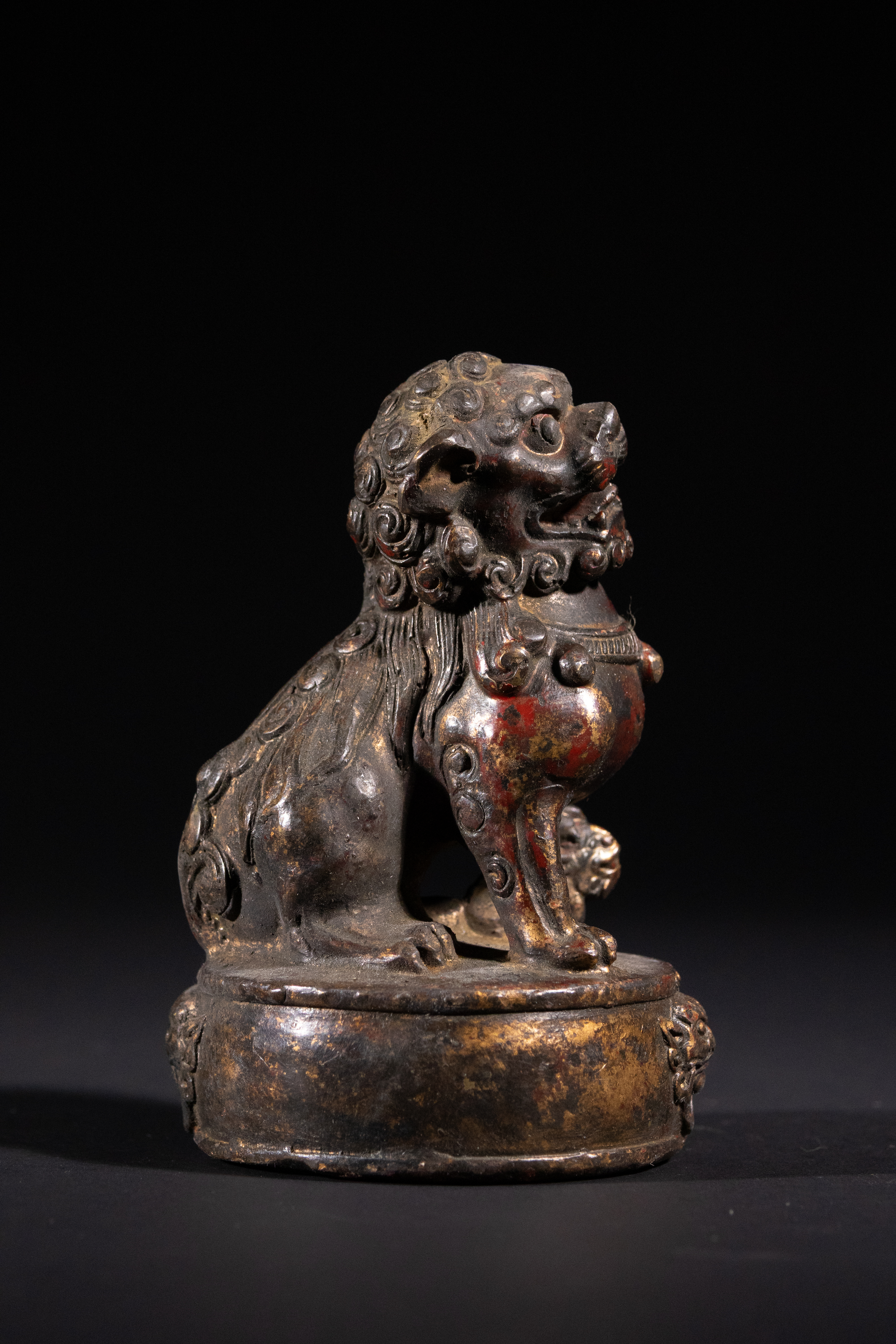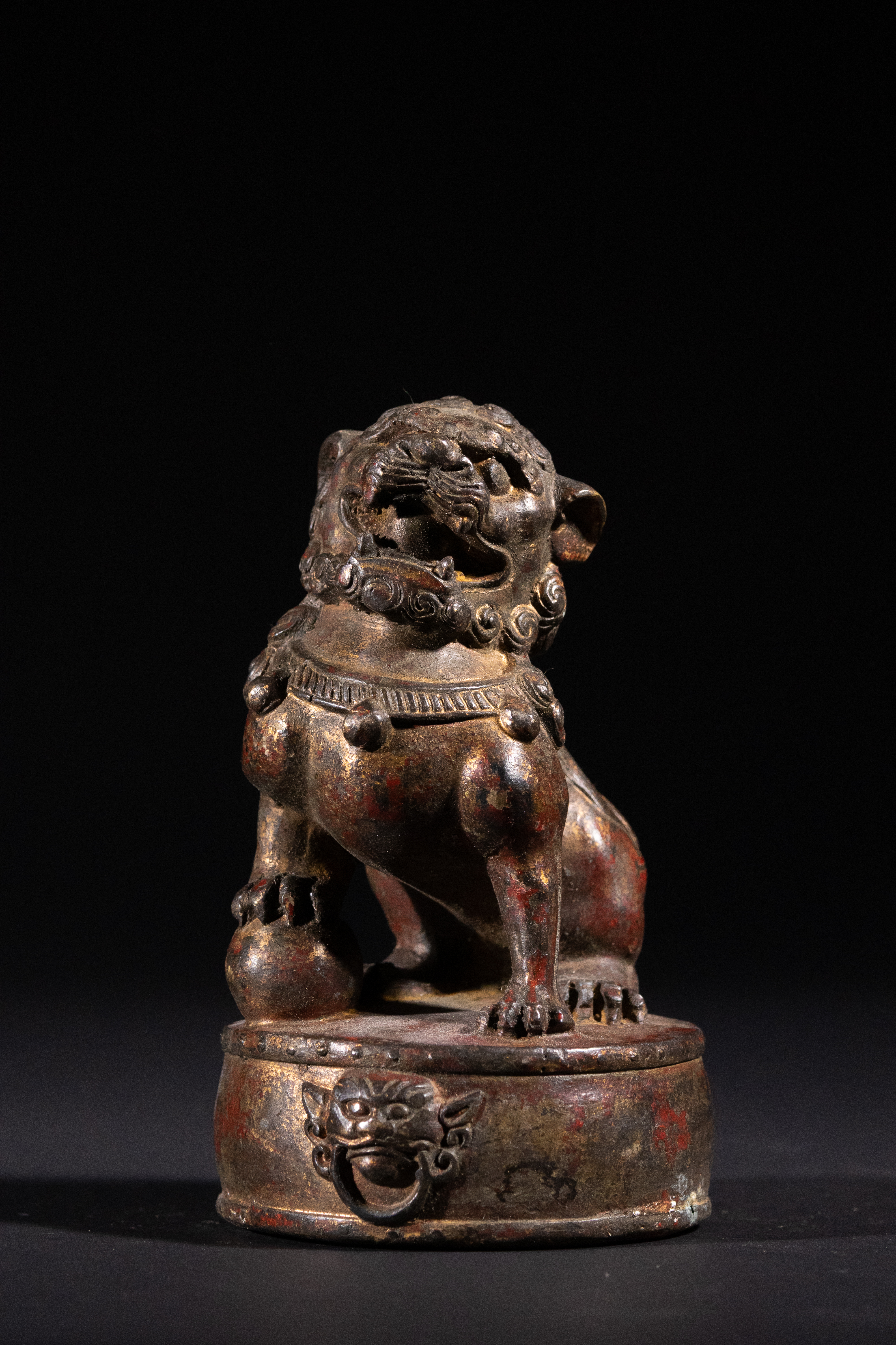 Good antique condition. Significant losses to the original red lacquer/paint and gilding, revealing the underlying patinated bronze/brass. Surface wear and minor abrasions consistent with age and handling. No apparent structural damage or repairs.
