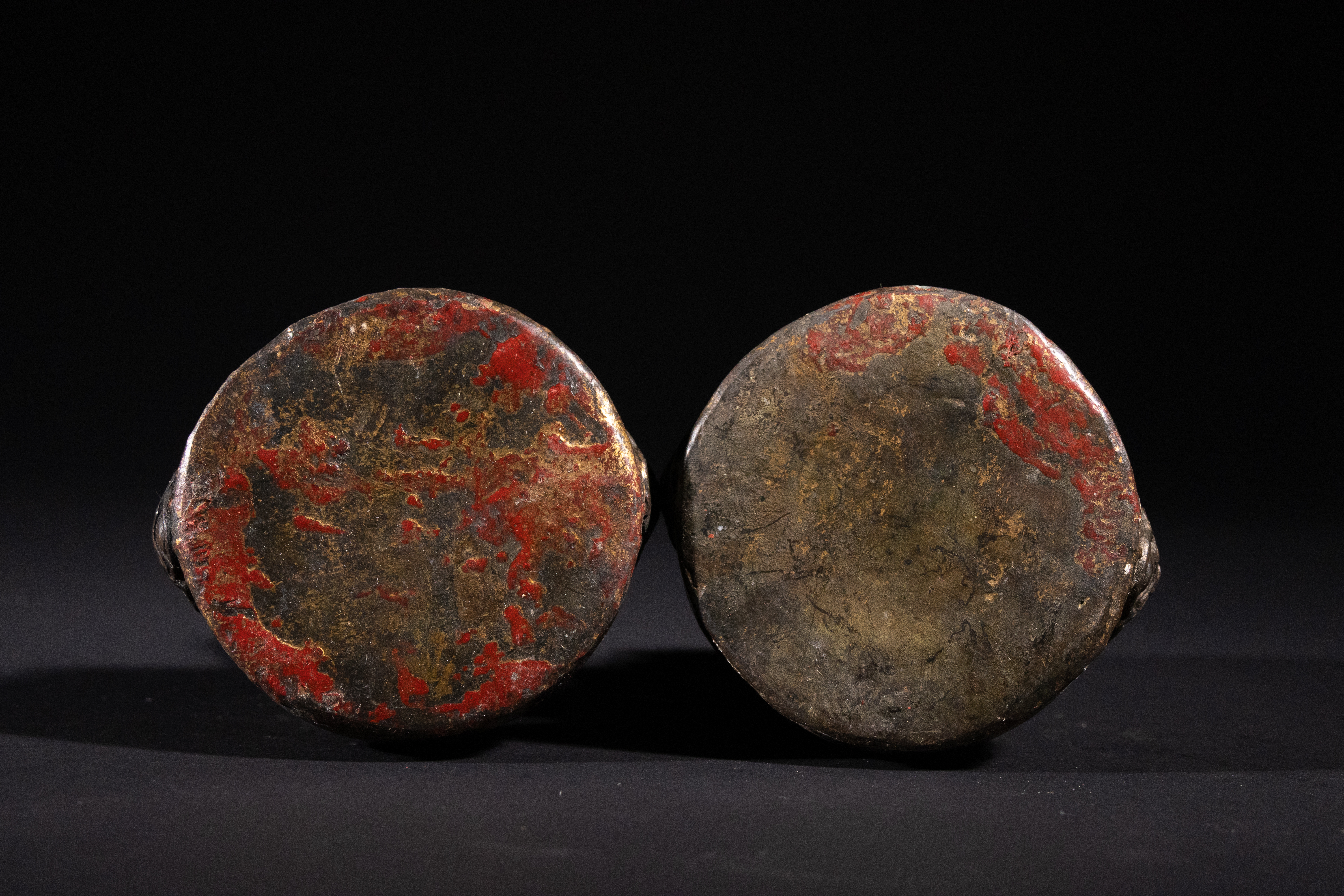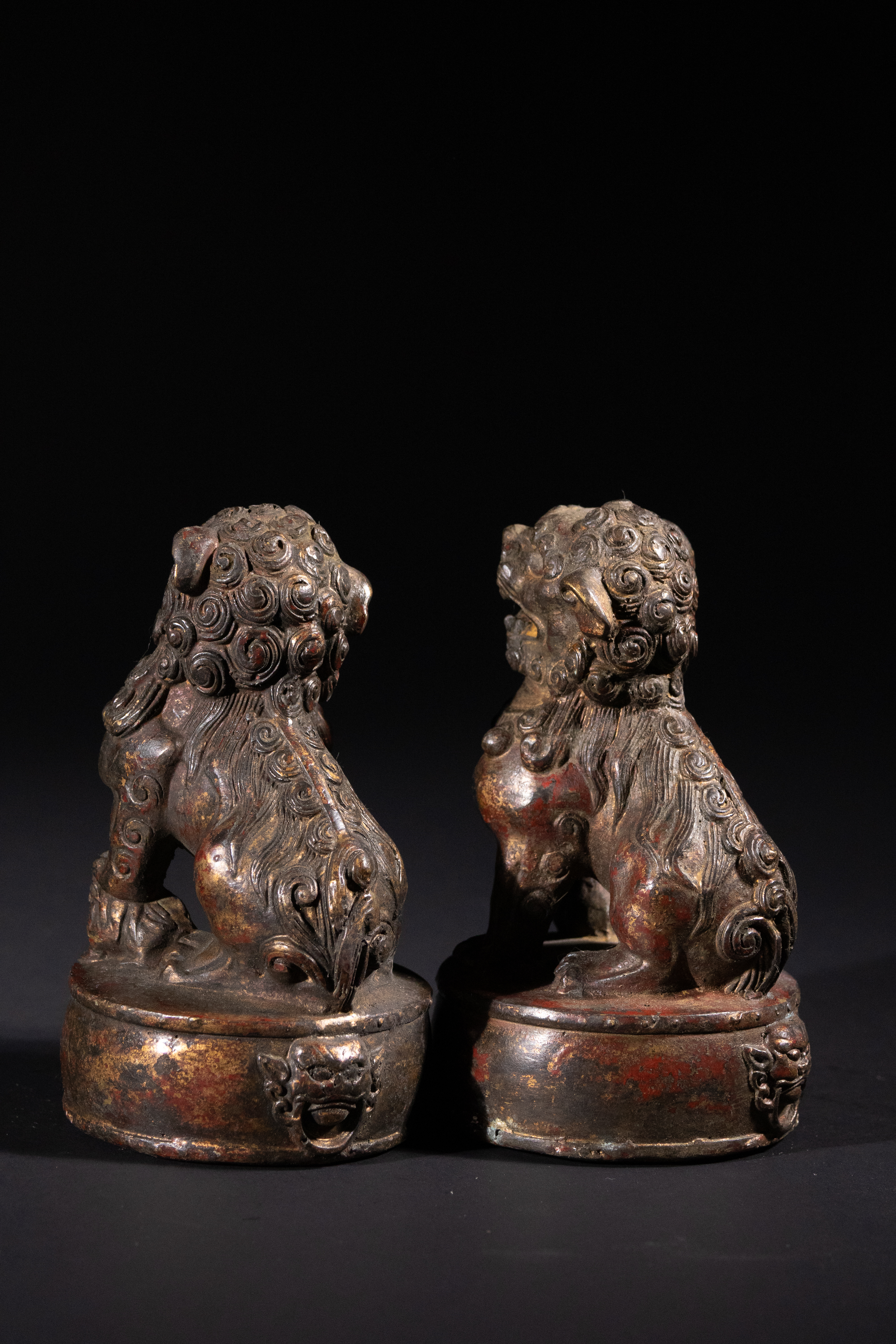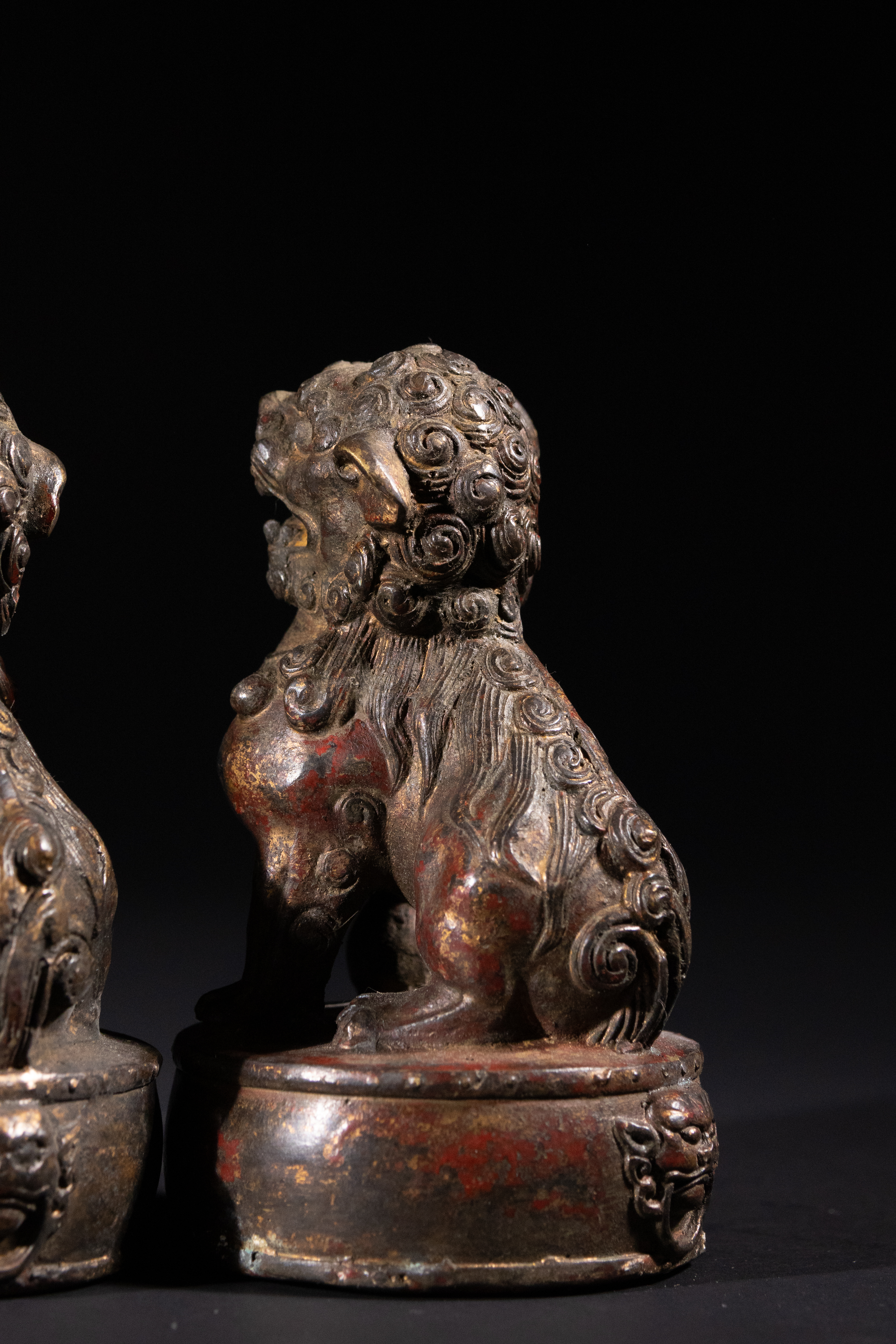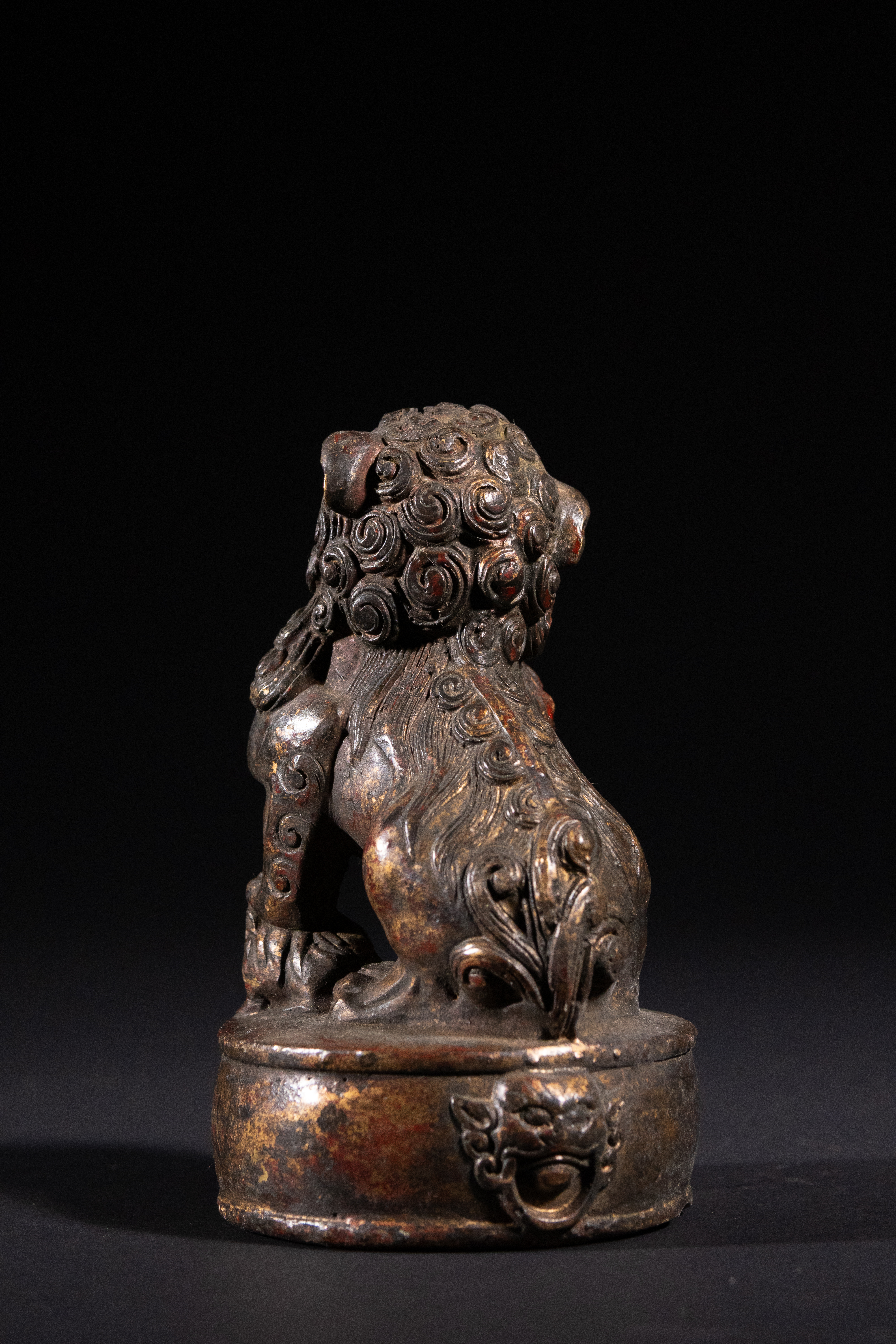 Good antique condition. Significant losses to the original red lacquer/paint and gilding, revealing the underlying patinated bronze/brass. Surface wear and minor abrasions consistent with age and handling. No apparent structural damage or repairs.