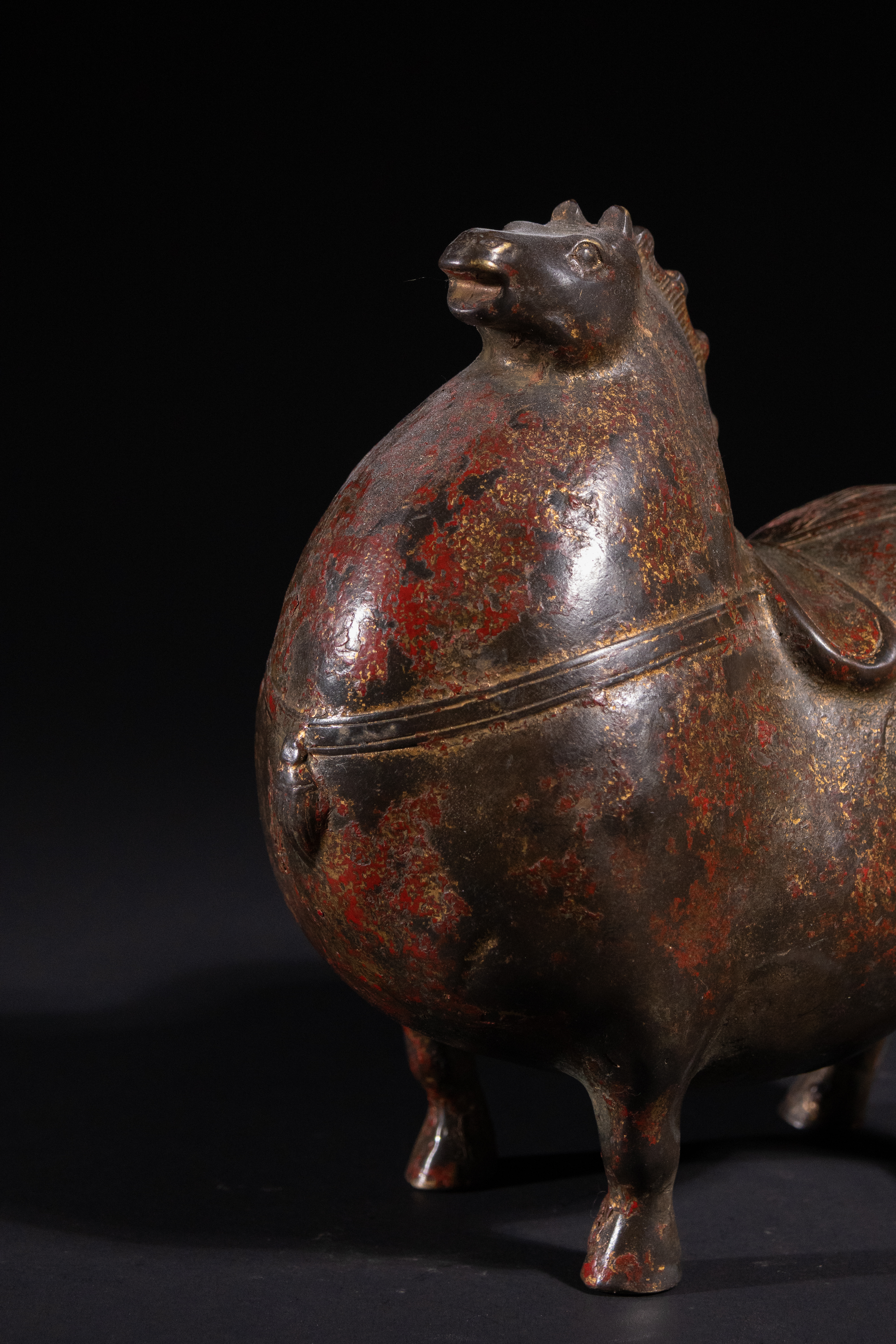 A Chinese gilt bronze Tang Dynasty style horse figure, cast in bronze as a stylized, corpulent horse. It functions as a lidded vessel, indicated by a prominent horizontal seam around its robust body. The figure depicts the horse standing on thick legs, with an upward-tilted head, open mouth, stylized mane, and a curled tail. A saddle form and a harness band are sculpted onto its body.