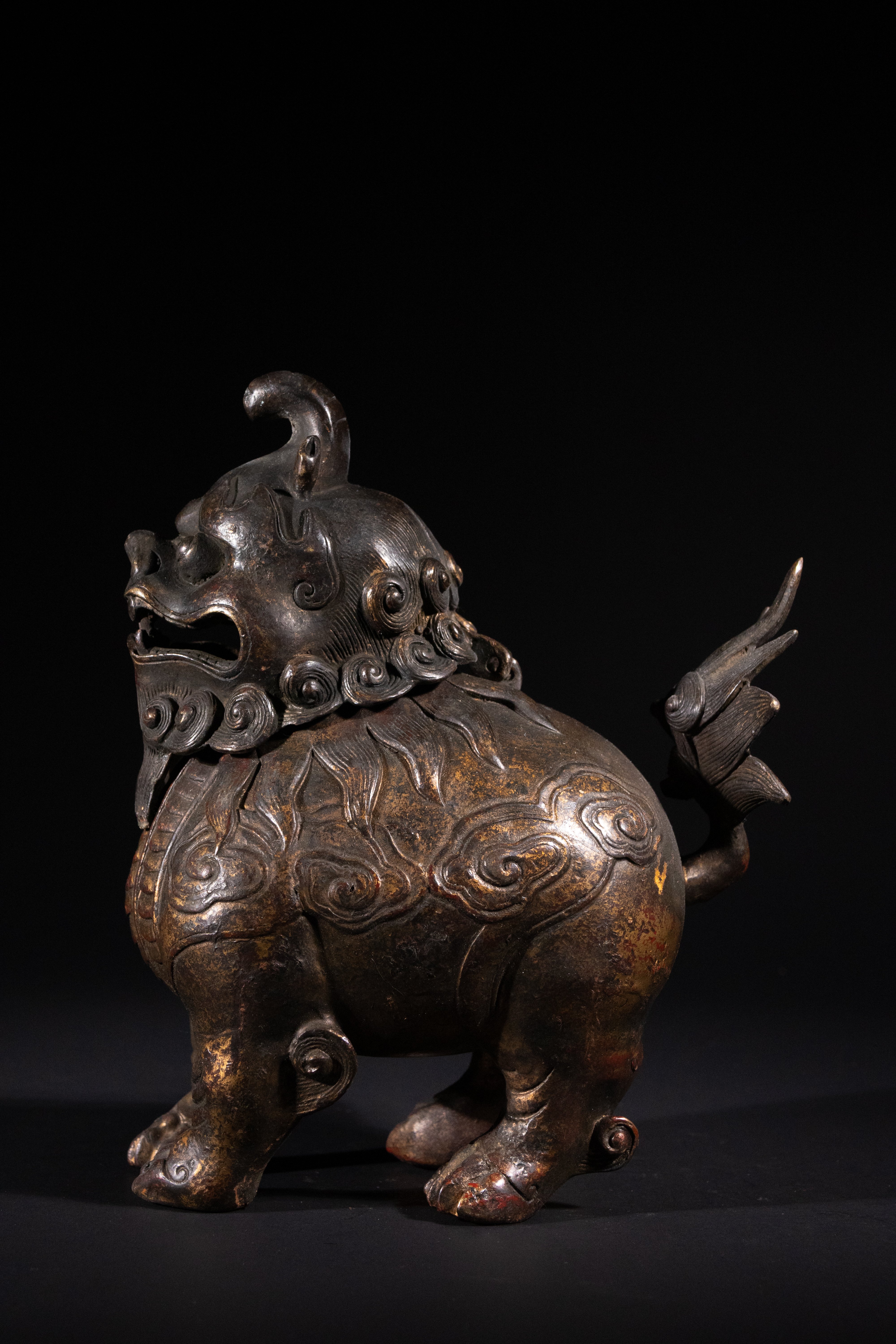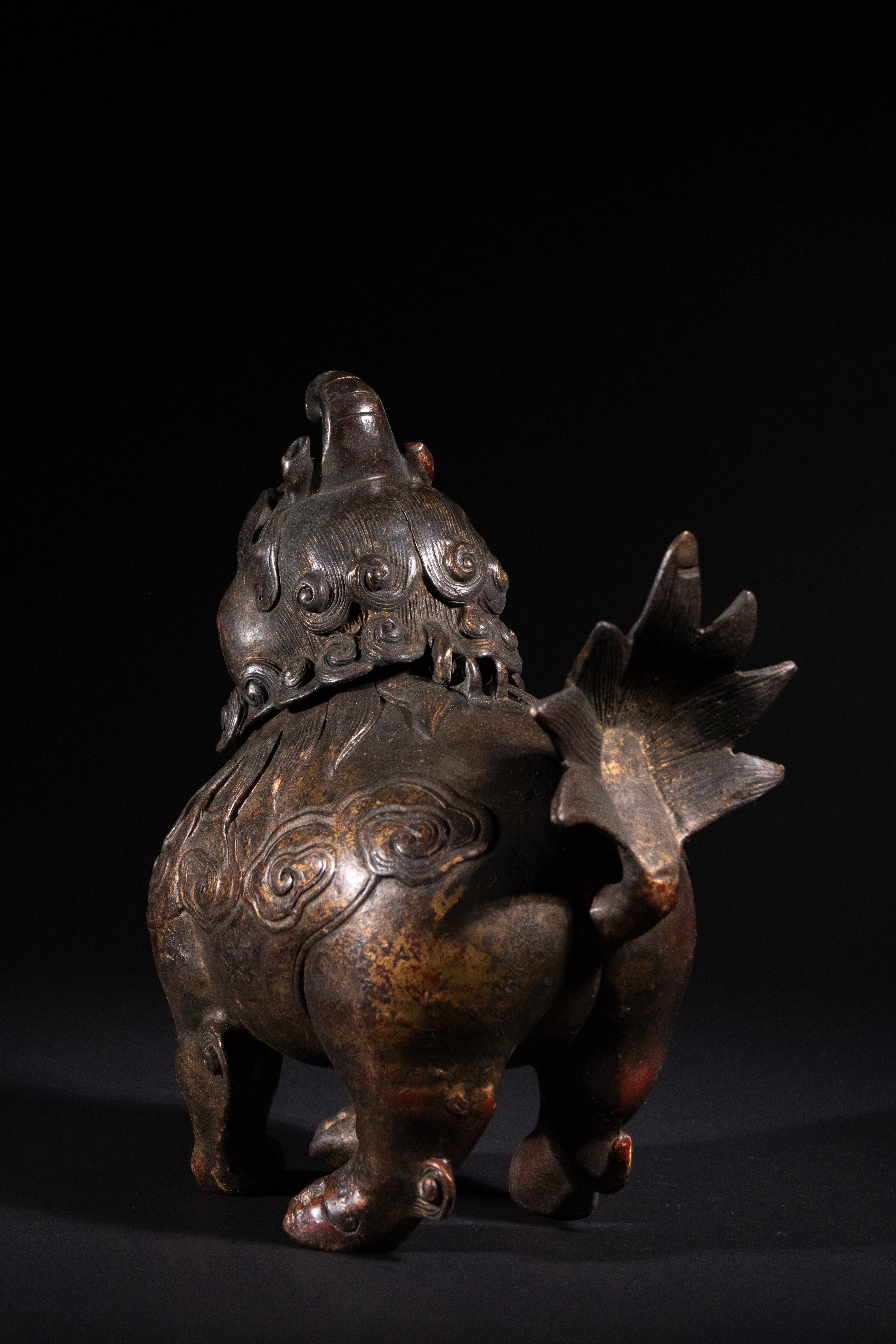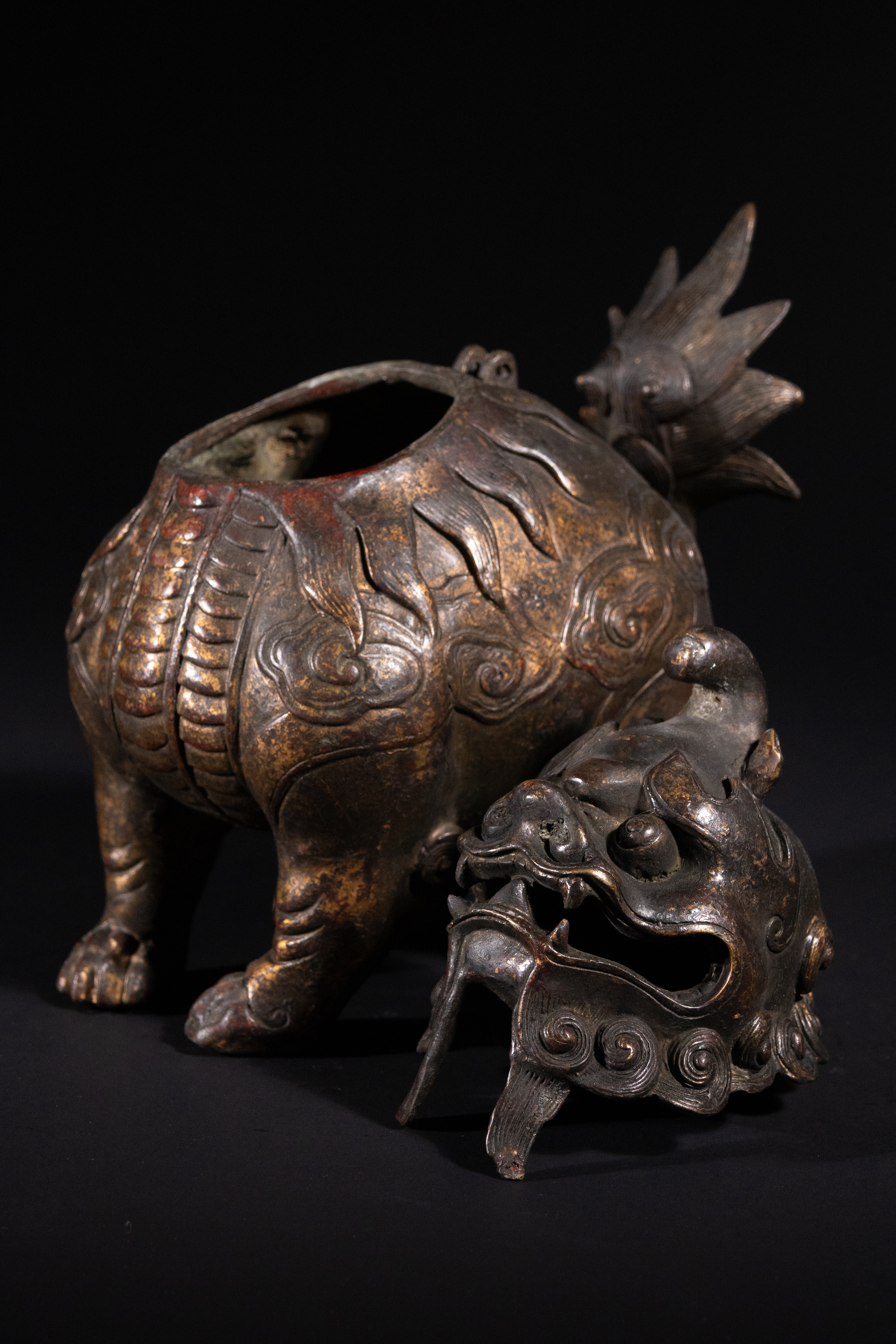 A Chinese parcel-gilt bronze censer, cast in the form of a crouching luduan, possibly Qianlong period. The mythical beast features a powerful head with prominent eyes and an open snout, with its removable head serving as the lid. Its body is segmented, resembling scales or armor, and it is adorned with a stylized flame-like tail. The surface exhibits a rich, dark patina with discernible traces of original gilding and reddish pigment, particularly on the raised decorative elements such as scrolling clouds and scales.