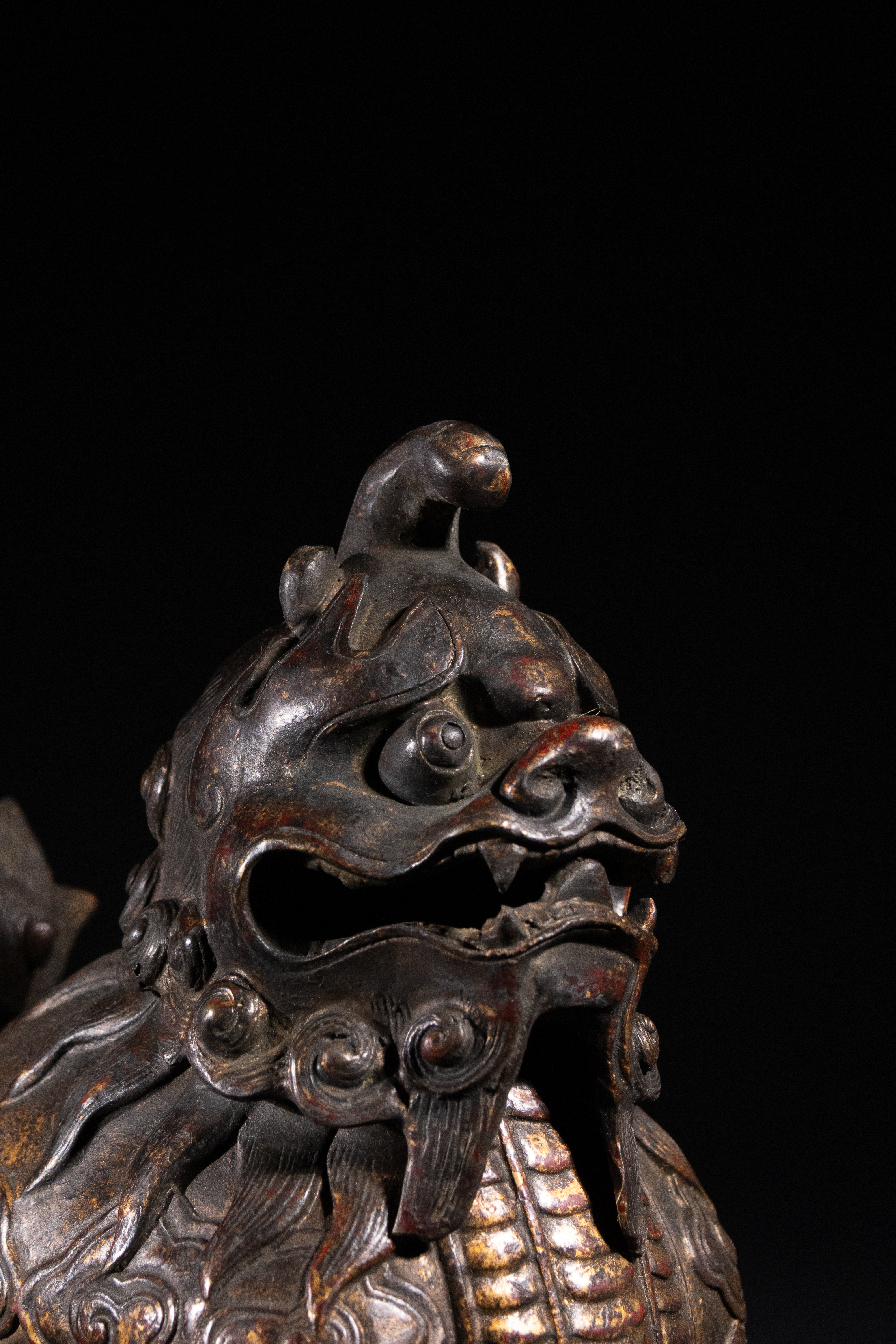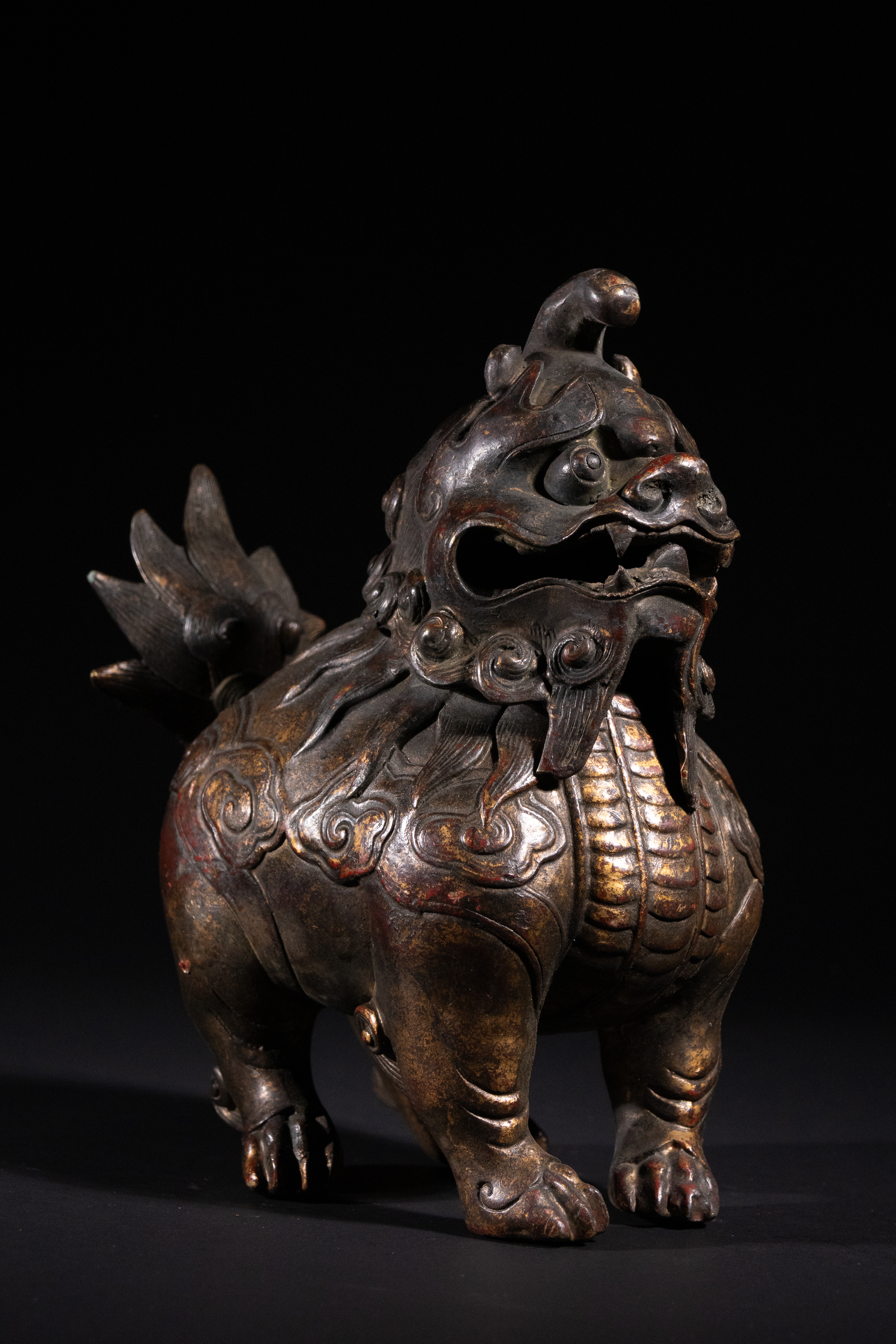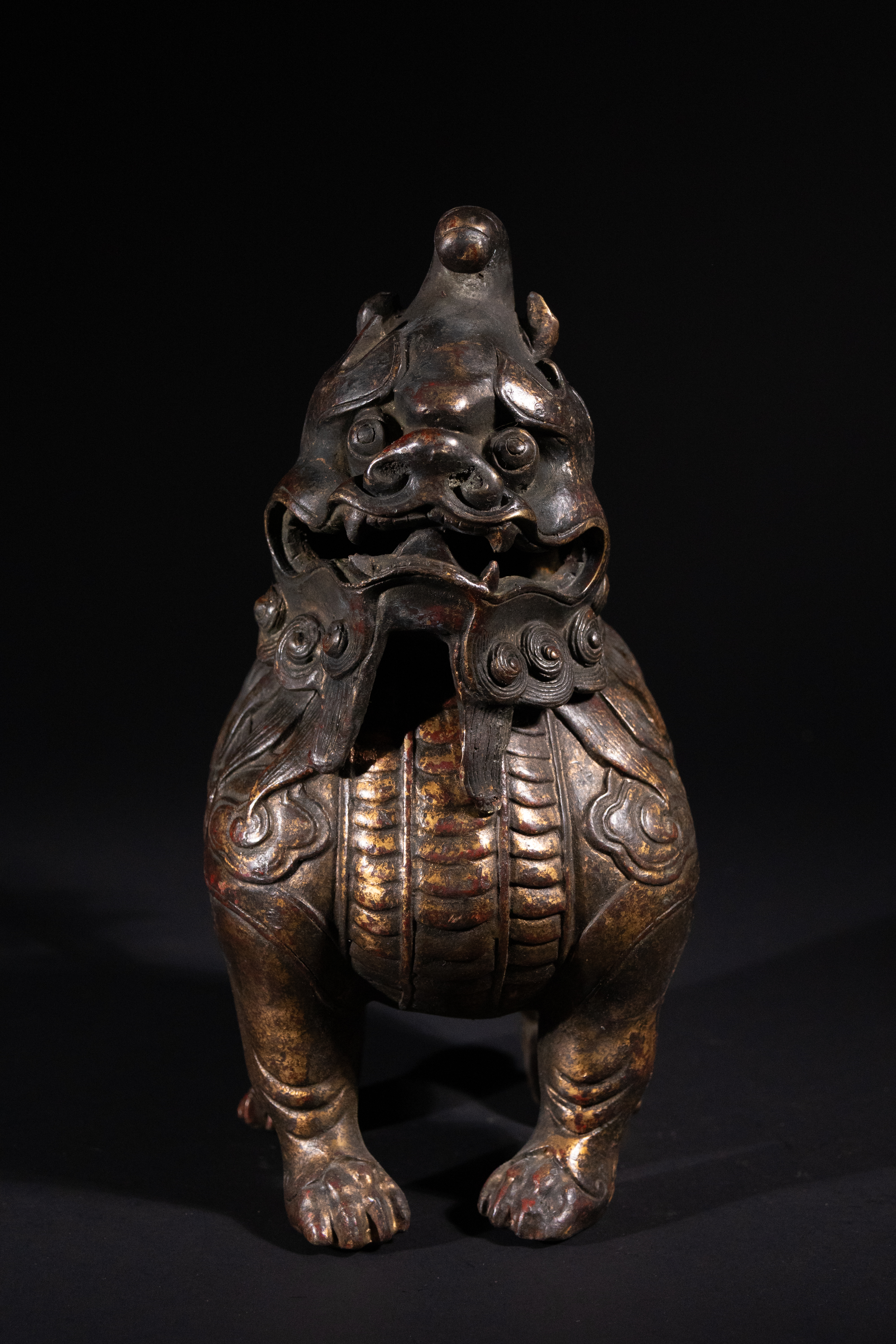 A Chinese parcel-gilt bronze censer, cast in the form of a crouching luduan, possibly Qianlong period. The mythical beast features a powerful head with prominent eyes and an open snout, with its removable head serving as the lid. Its body is segmented, resembling scales or armor, and it is adorned with a stylized flame-like tail. The surface exhibits a rich, dark patina with discernible traces of original gilding and reddish pigment, particularly on the raised decorative elements such as scrolling clouds and scales.