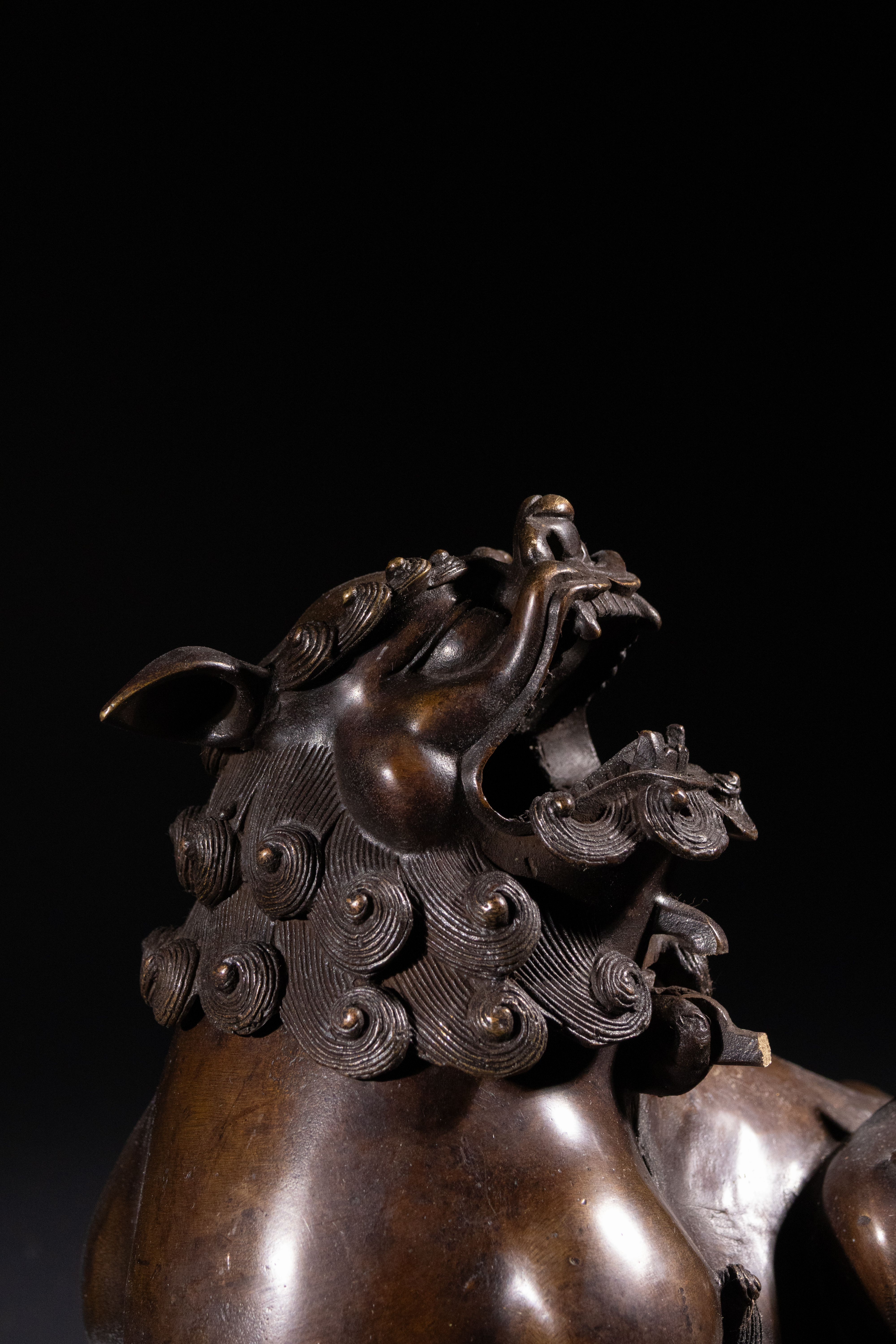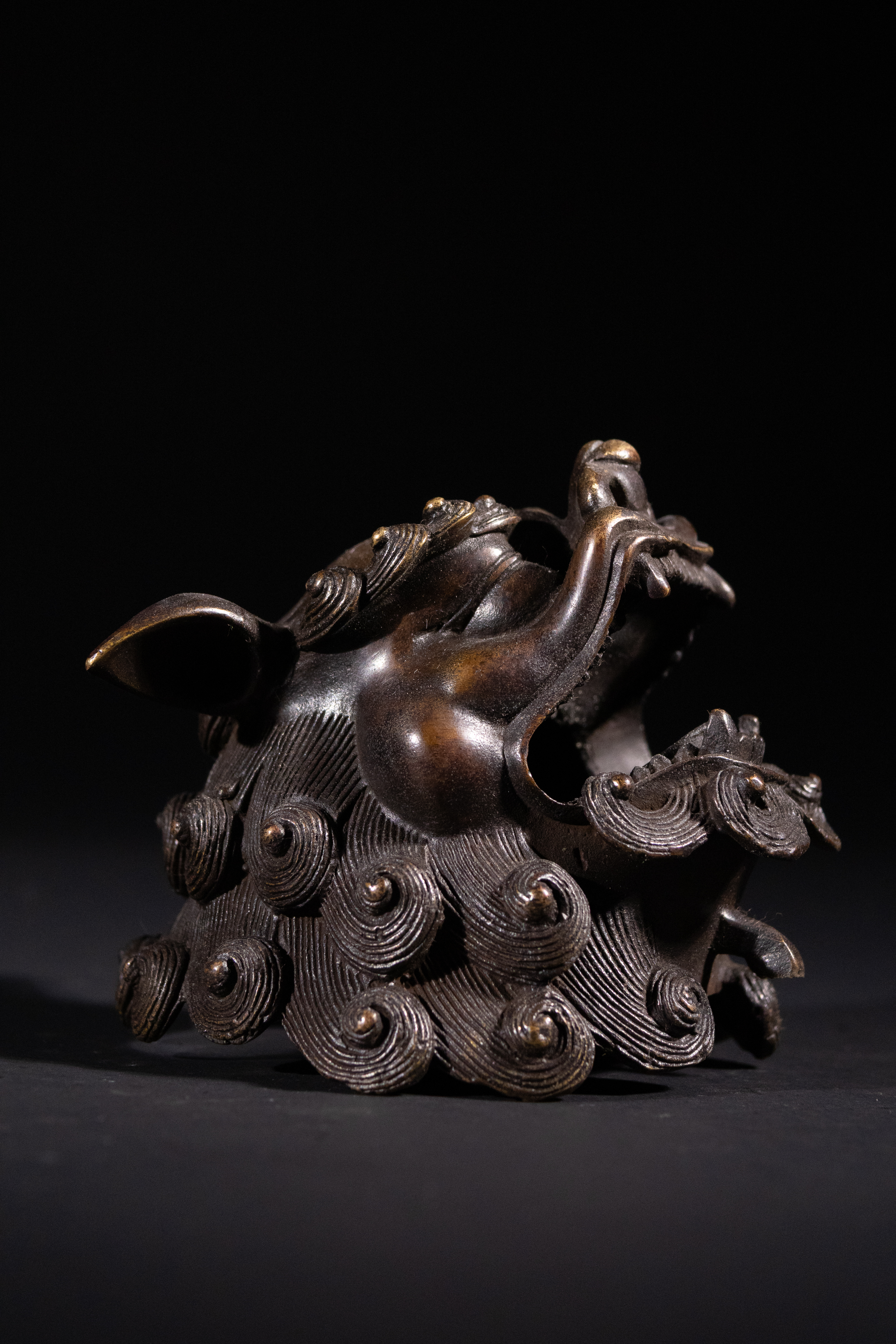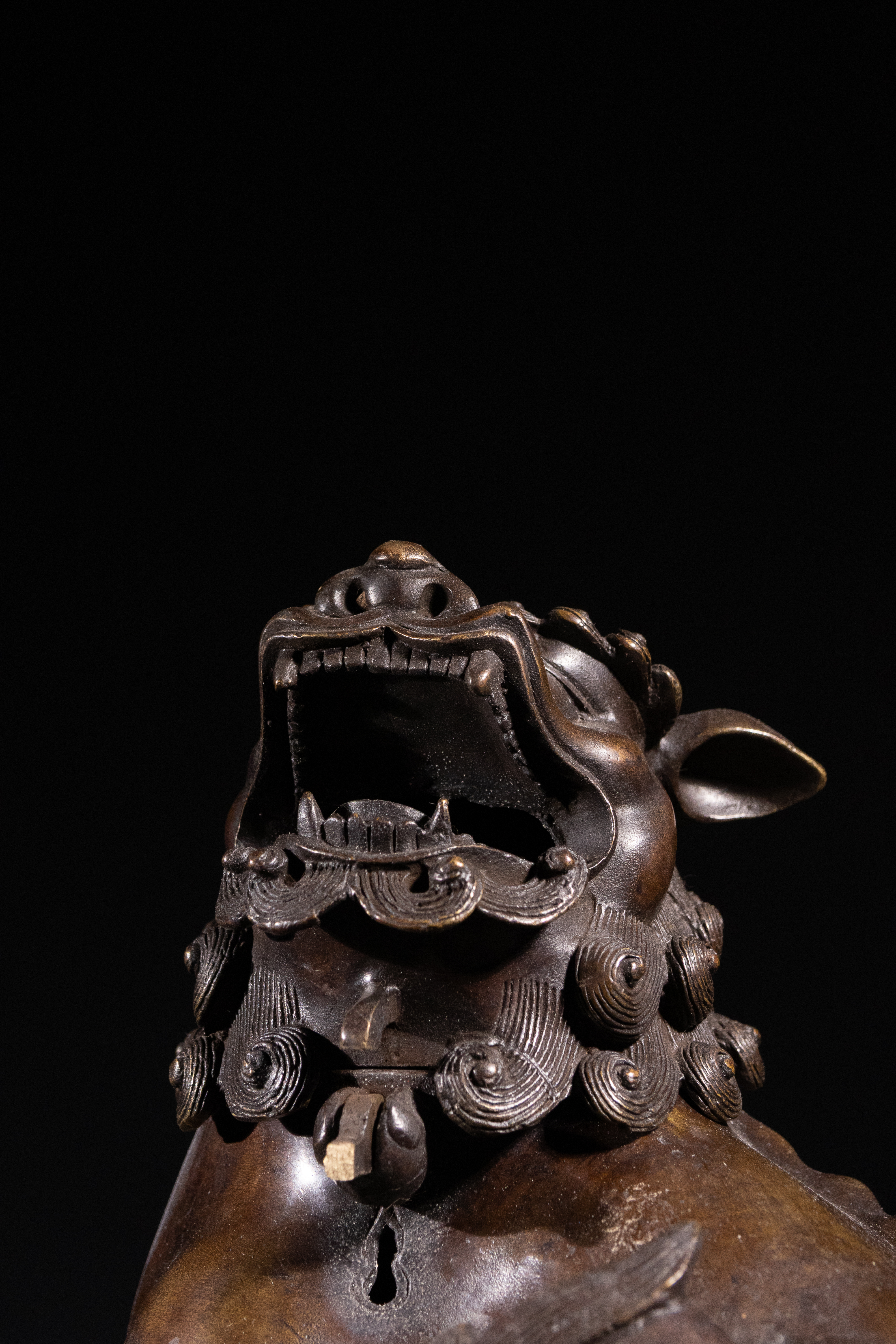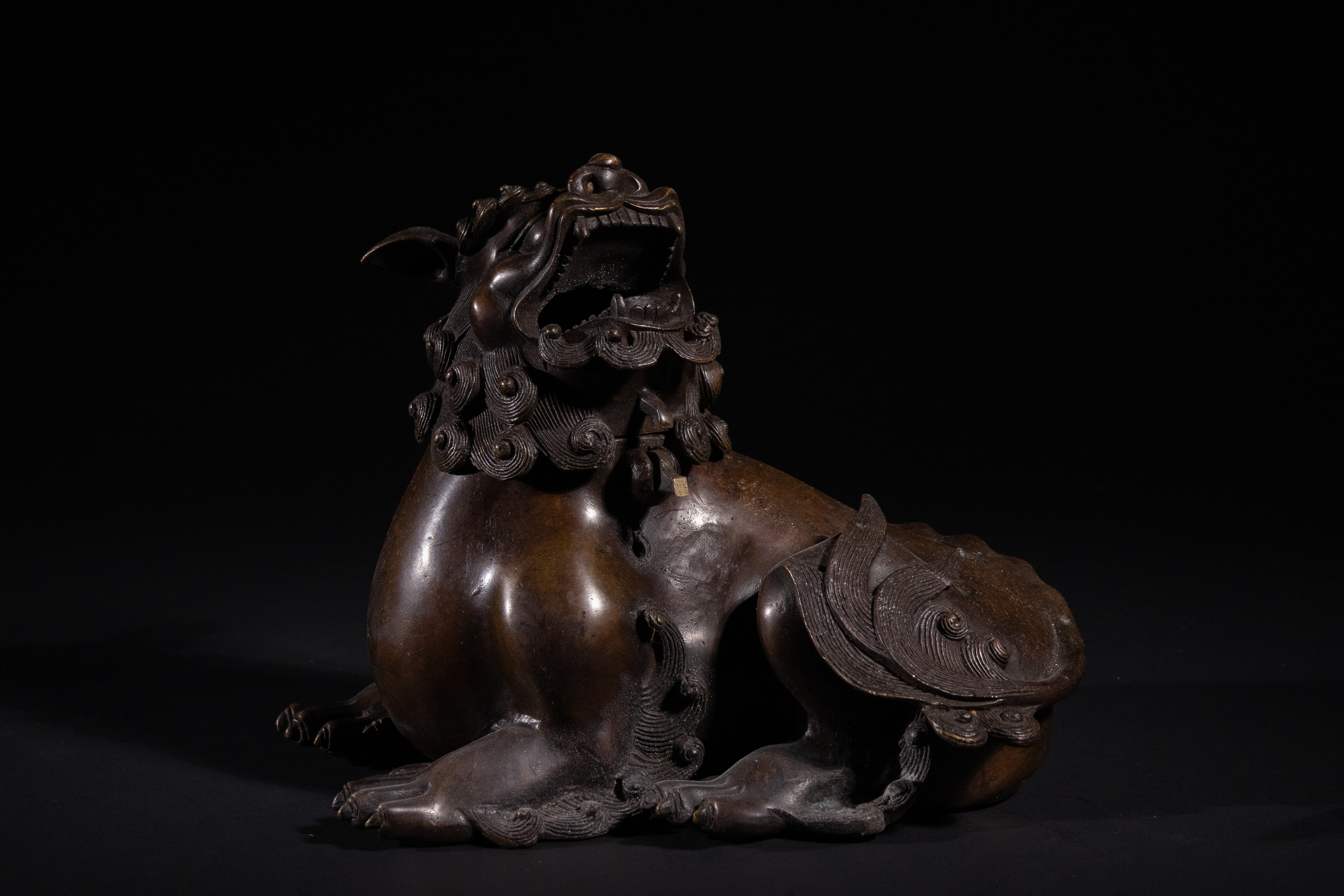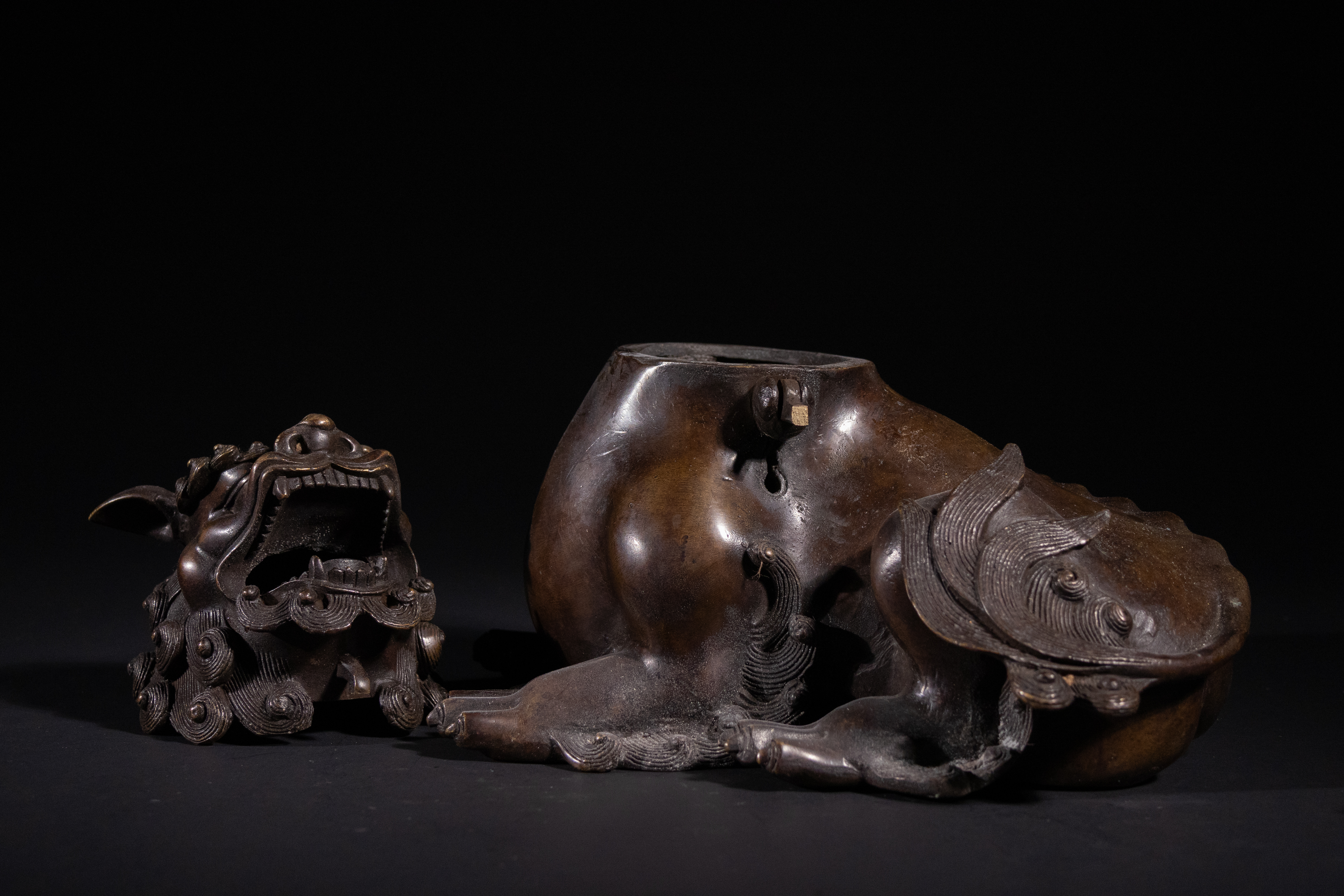 A patinated bronze figure of an East Asian-style mythical beast, likely a Buddhist lion or ‘Foo dog’, depicted in a recumbent pose with an open mouth and bared teeth. The figure is constructed as a two-part censer, with a hollow body and a detachable head, designed to emit smoke. It exhibits a rich, dark bronze patina consistent with age, featuring intricately cast details such as a scrolled mane, stylized scale-like patterns on its back and legs, and prominent claws.