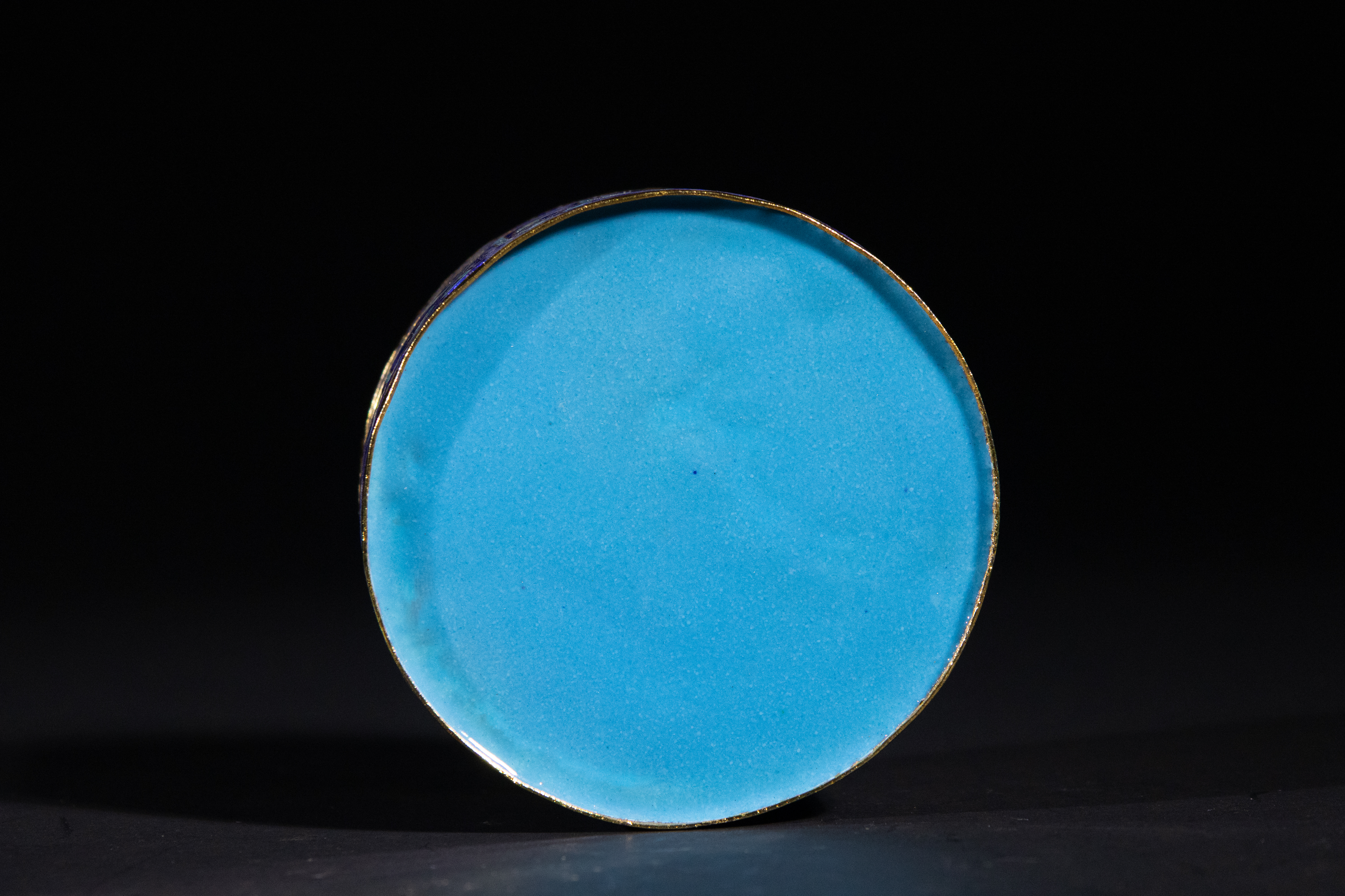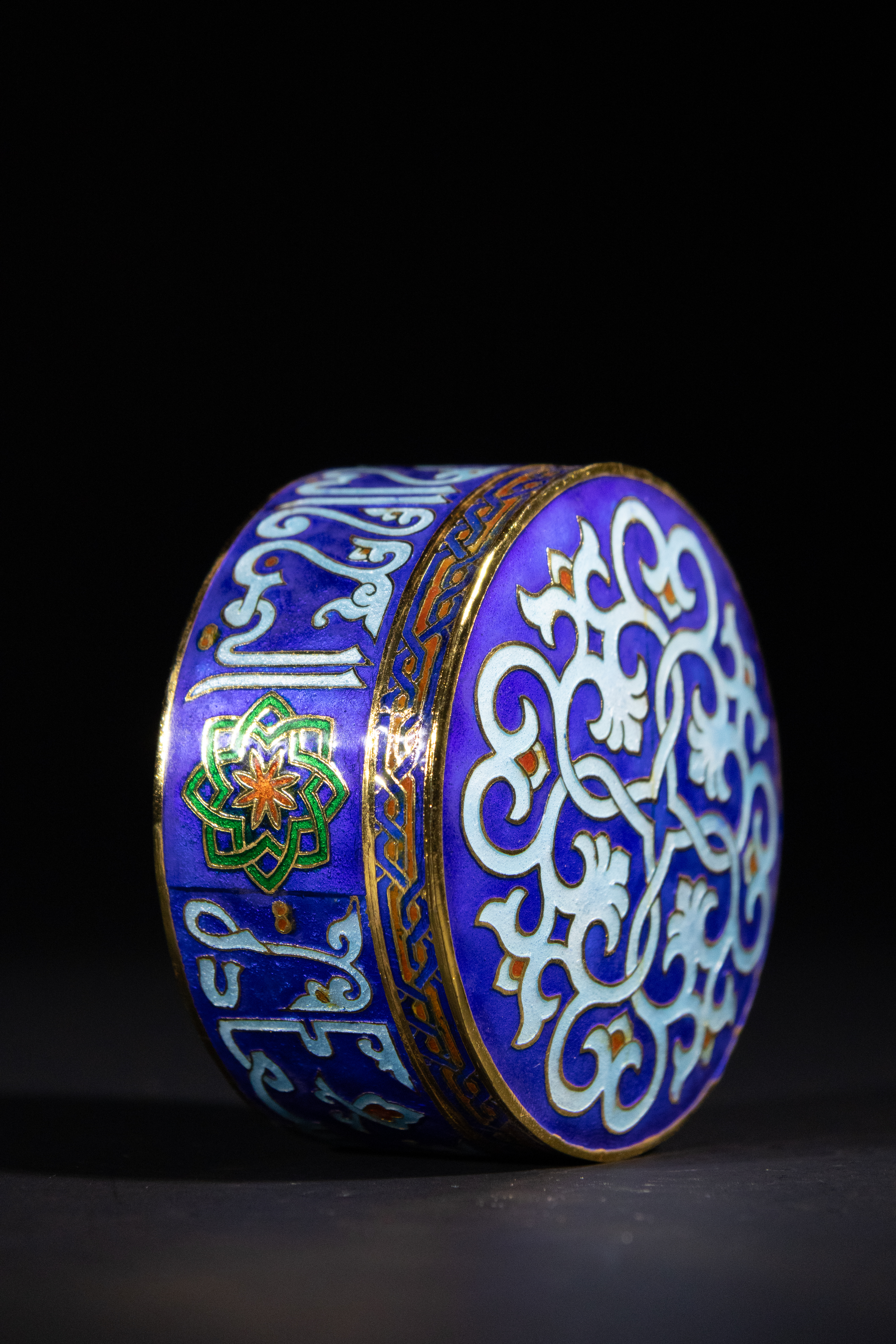 A circular, lidded box, likely intended as a trinket or pill box, crafted from gilded metal and elaborately decorated with intricate cloisonné enamel. The primary color is a deep royal blue, accented with lighter blues, white, orange, and green enamel. The lid features a complex arabesque or scrollwork motif. The sides are adorned with a band of stylized Arabic calligraphy, identified as verses from Surah Al-Ikhlas ("قُلْ هُوَ اللَّهُ أَحَدٌ اللَّهُ الصَّمَدُ" – Say: He is Allah, [the] One. Allah, the Eternal, the Absolute.), interspersed with geometric-floral starburst patterns. The bottom of the box is finished in a solid light turquoise enamel.