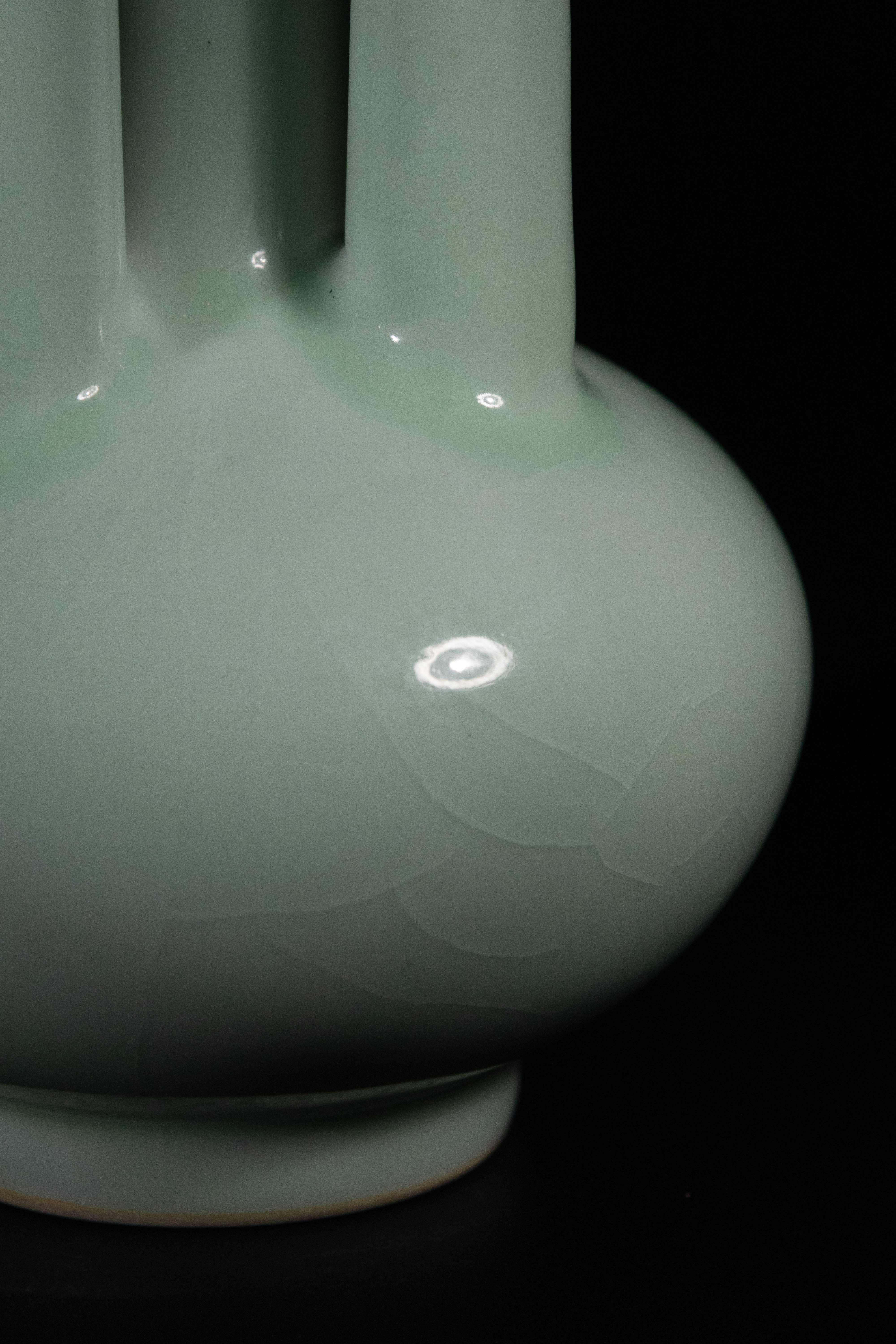 A celadon-glazed conjoined five-neck vase. This porcelain vessel features a globular body supporting three slender, cylindrical necks, all covered in a lustrous pale celadon glaze with an intentional, finely-crazed crackle pattern. The unglazed foot rim exposes a reddish-brown body. On the recessed base, a square, four-character seal mark reads ‘大清乾隆’ (Dà Qīng Qiánlóng), translating to ‘Great Qing Qianlong reign.’