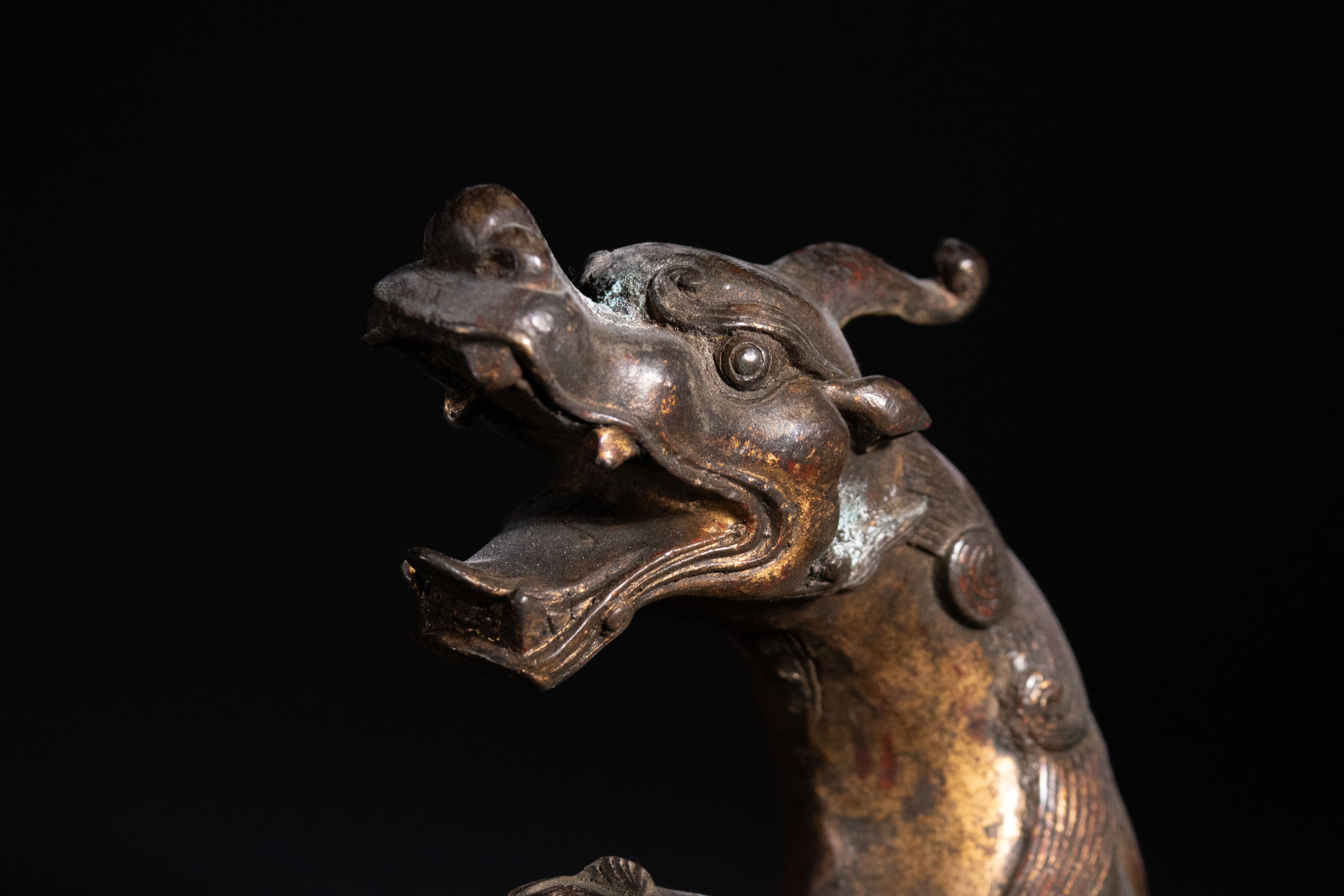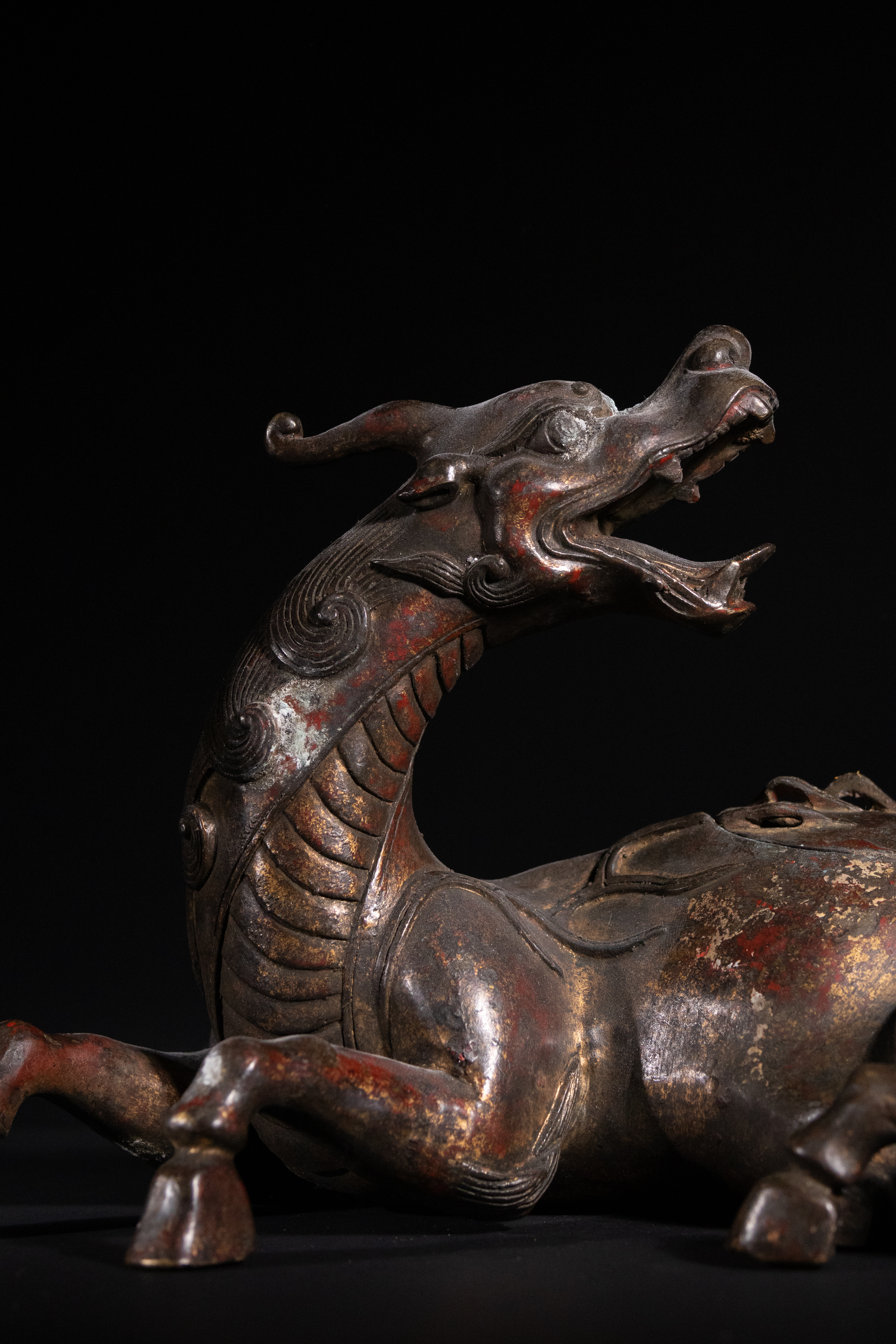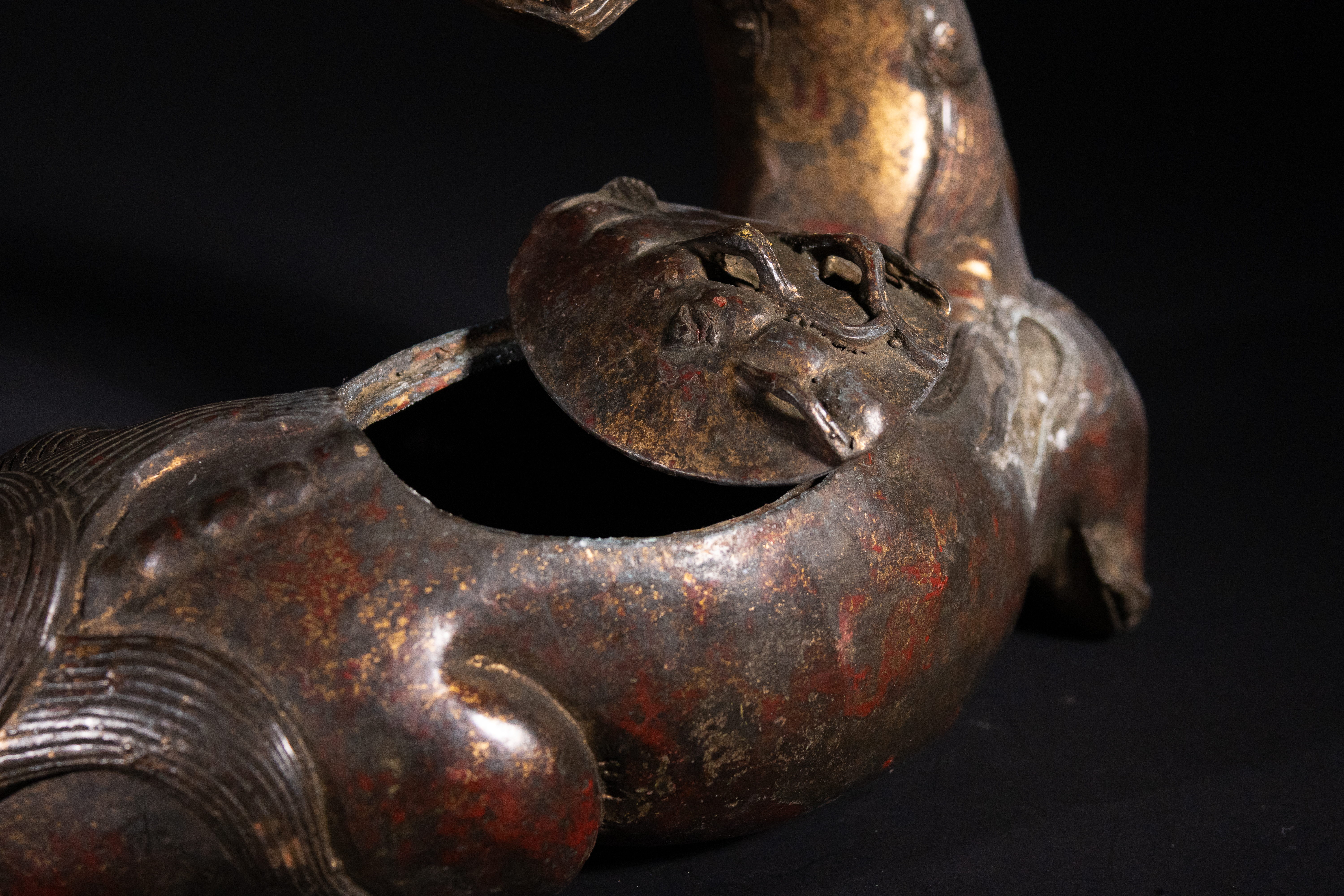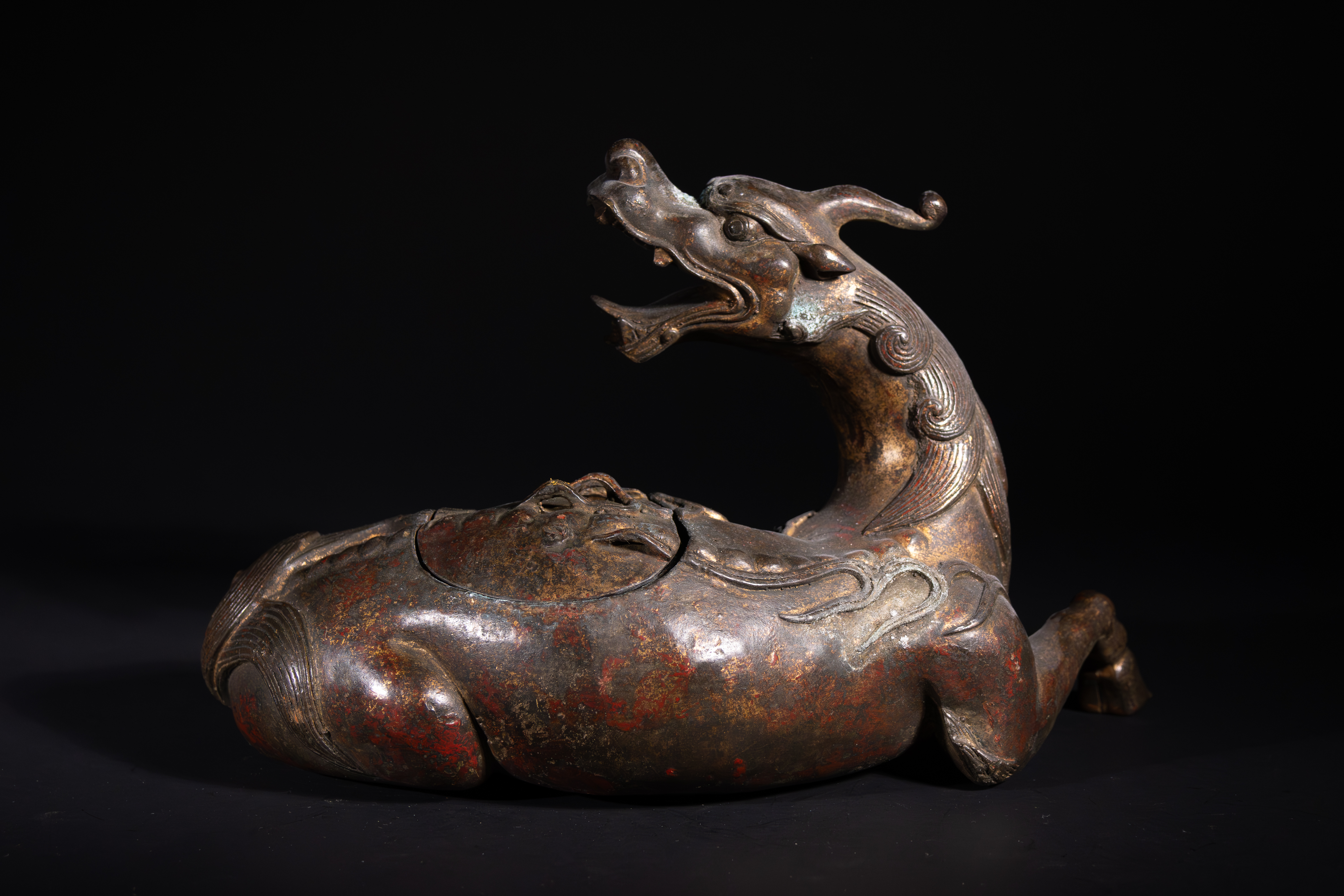 A cast bronze vessel sculpted in the form of a recumbent East Asian mythical creature, identified as a Qilin. The censer features a stylized dragon-like head with an open mouth, short horns, a scaled neck, and hooves. A removable lid, also decorated, is situated on the creature’s back. The surface displays extensive dark patination with coppery-red undertones and visible remnants of a faded gilt or lacquered finish.