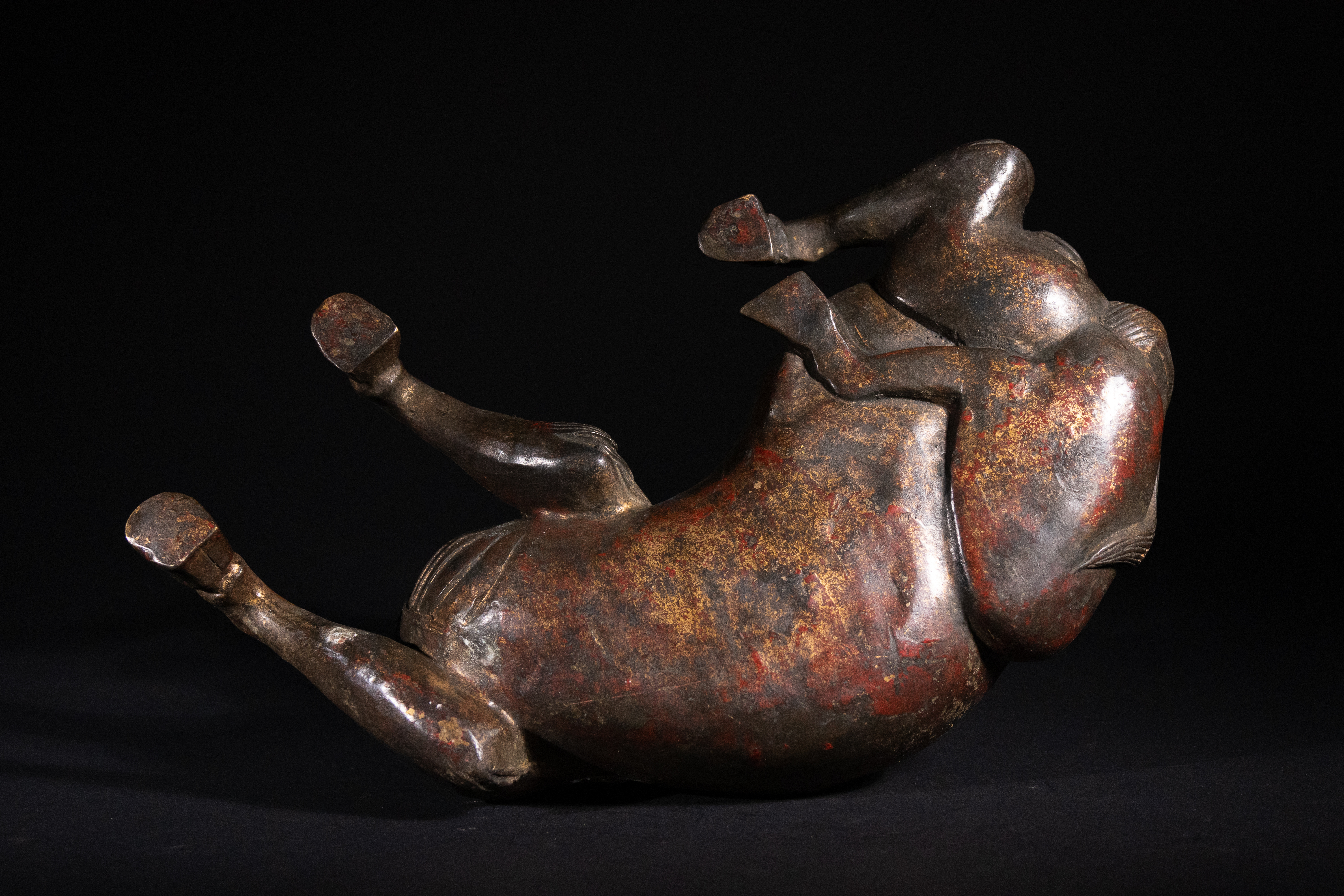 Extensive dark patination with coppery-red undertones. Significant surface wear and oxidation consistent with considerable age and use. The gilt or lacquered finish is faded with visible remnants. No visible text or markings are discernible. Overall good antique condition.