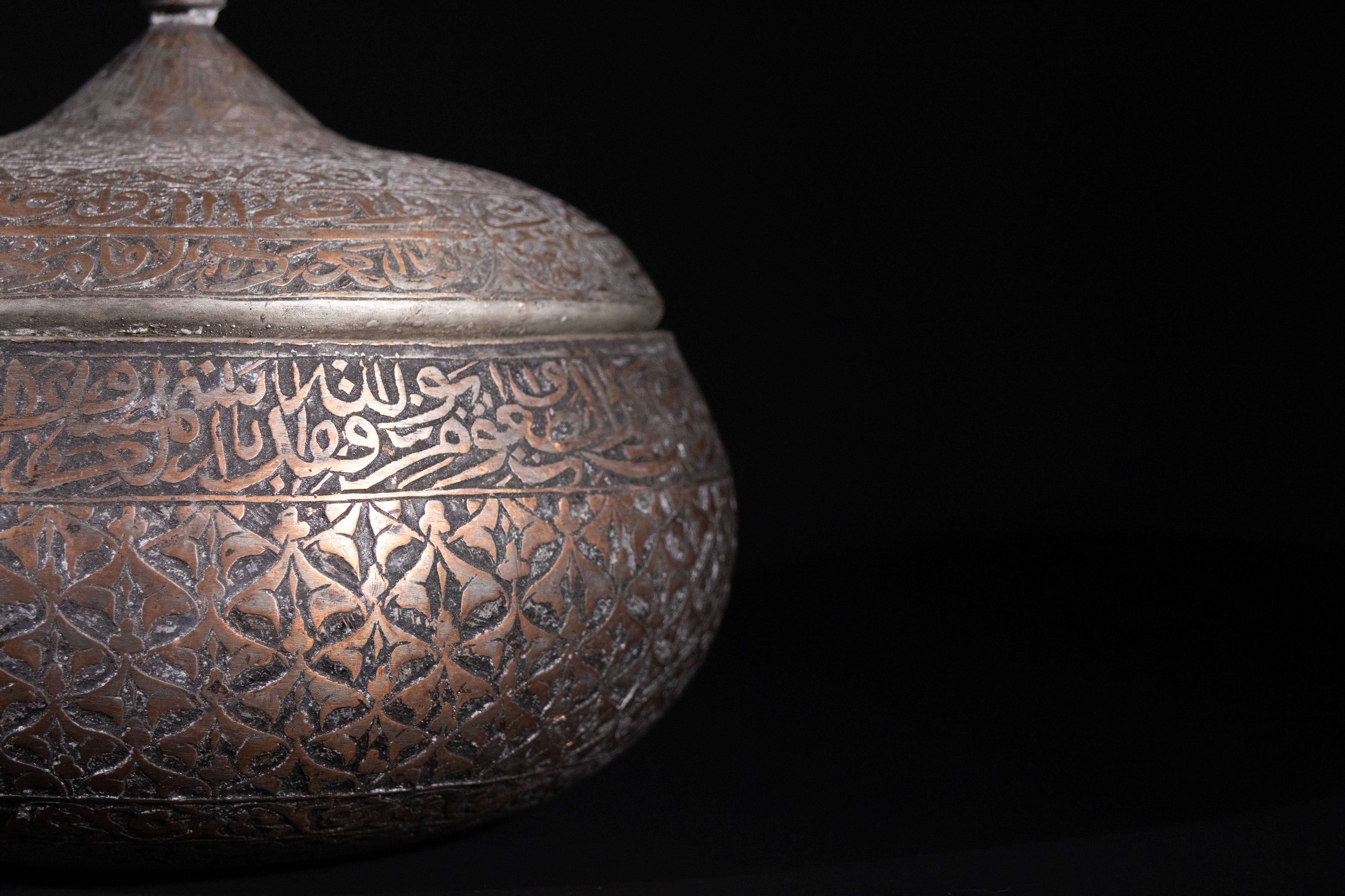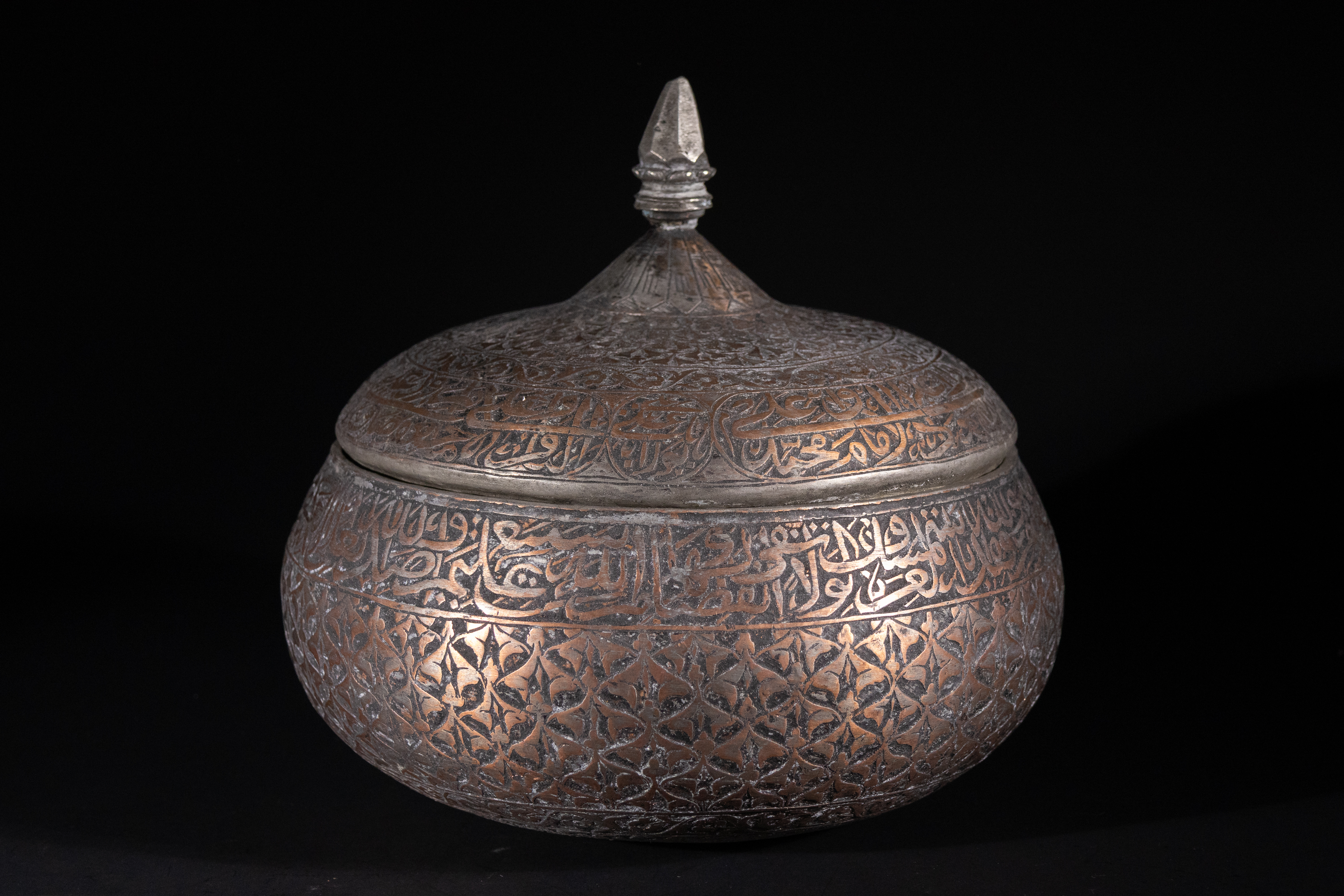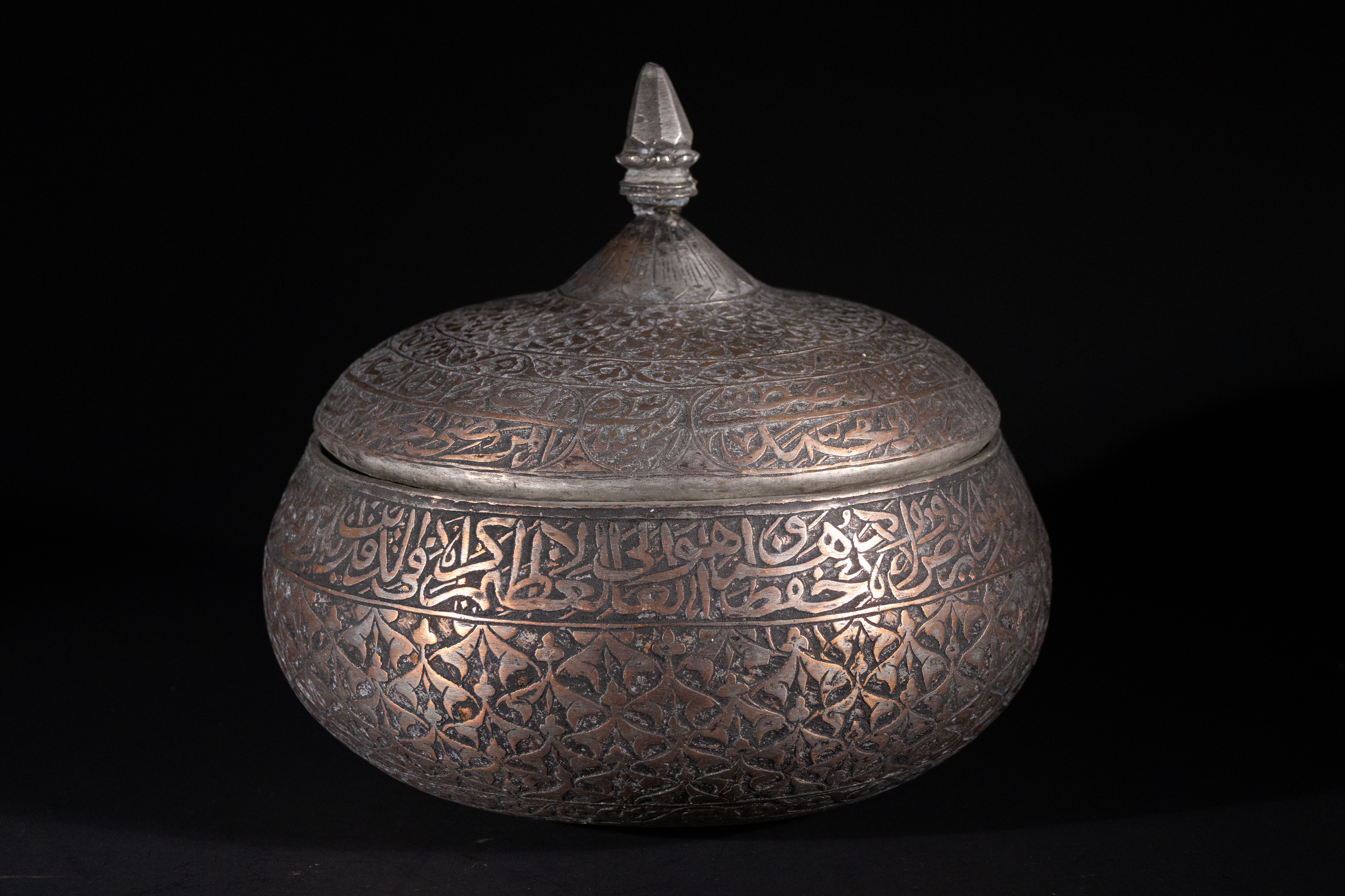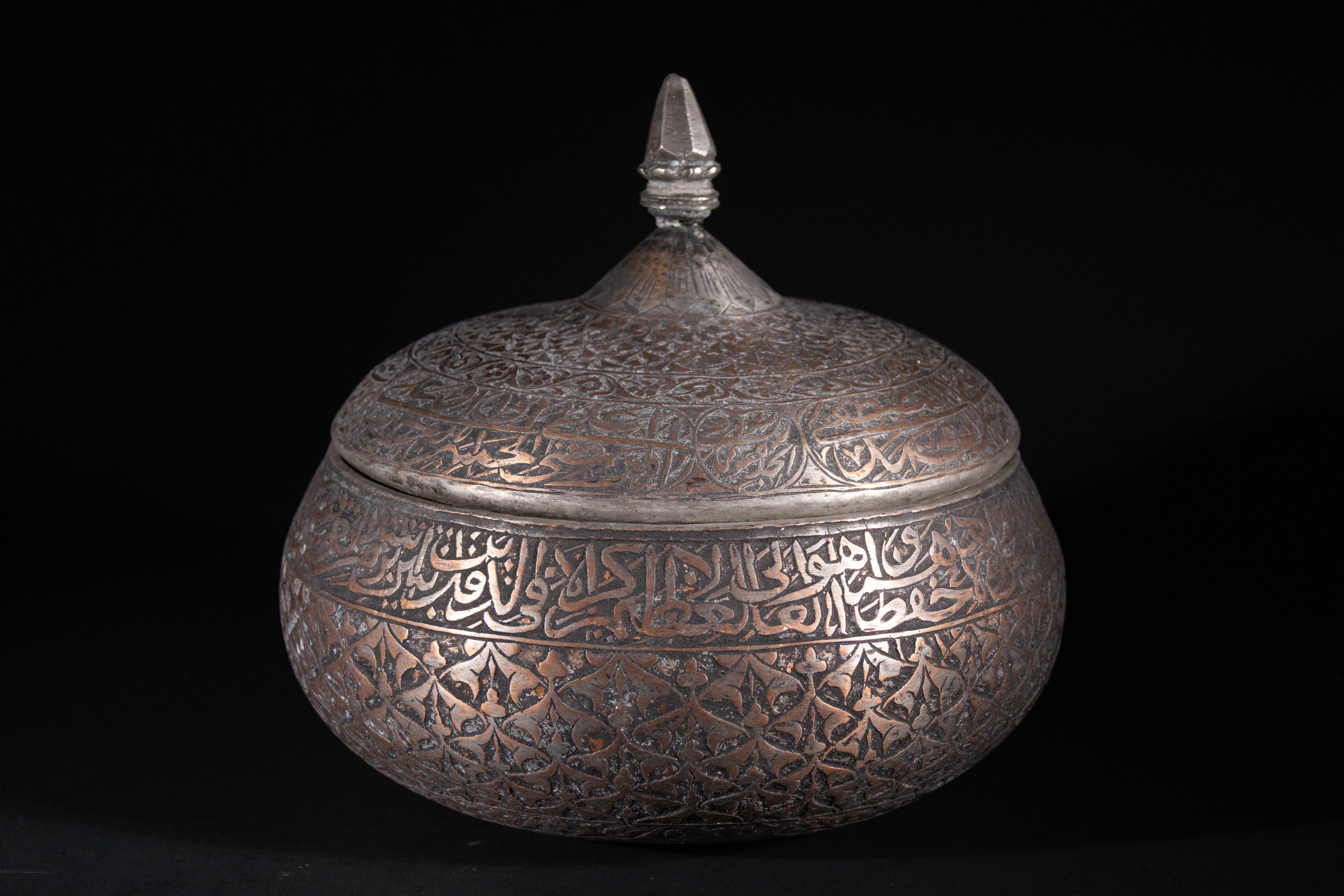 Lot 68: A Persian Tinned Copper Calligraphic Lidded Bowl, 17th/18th Century