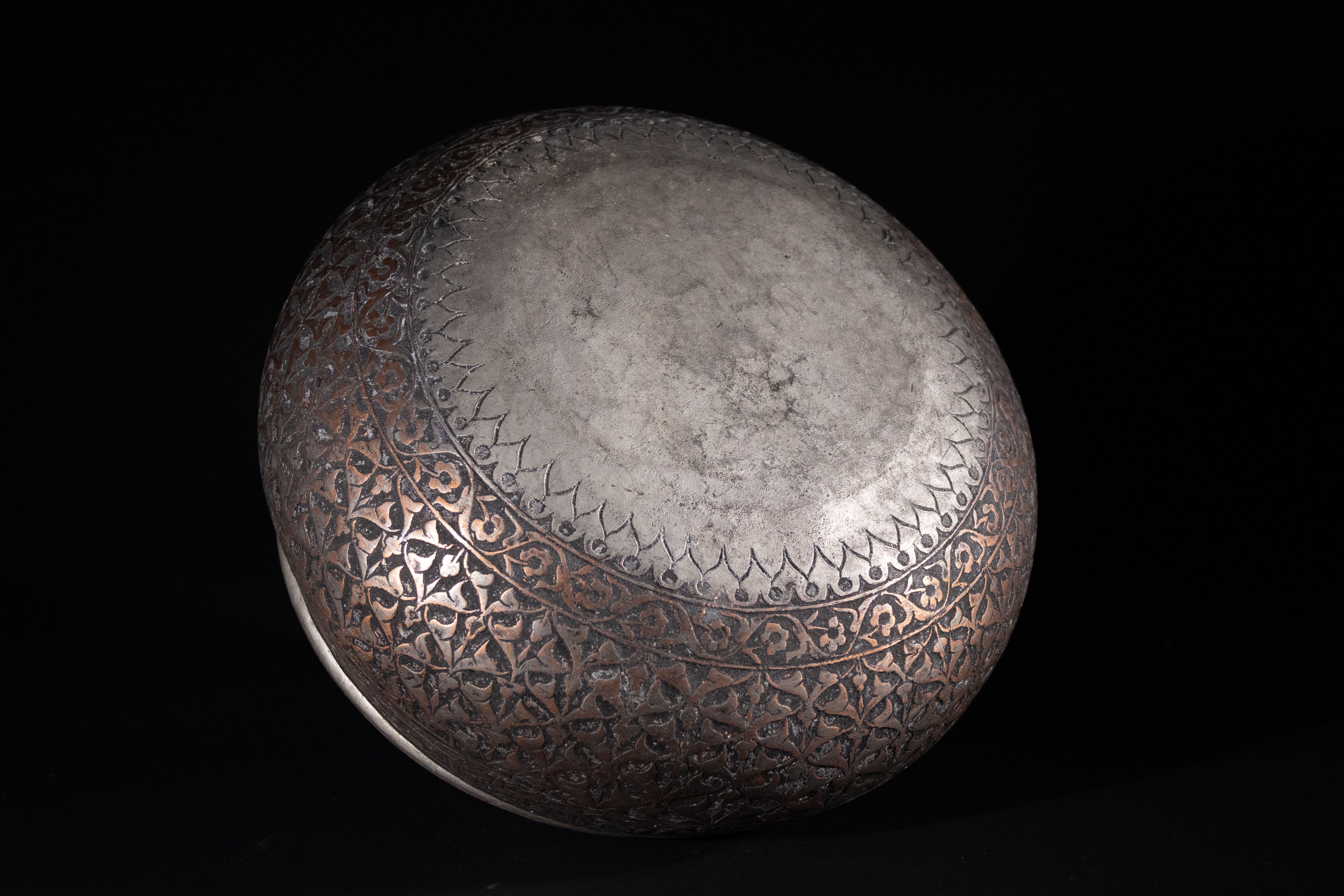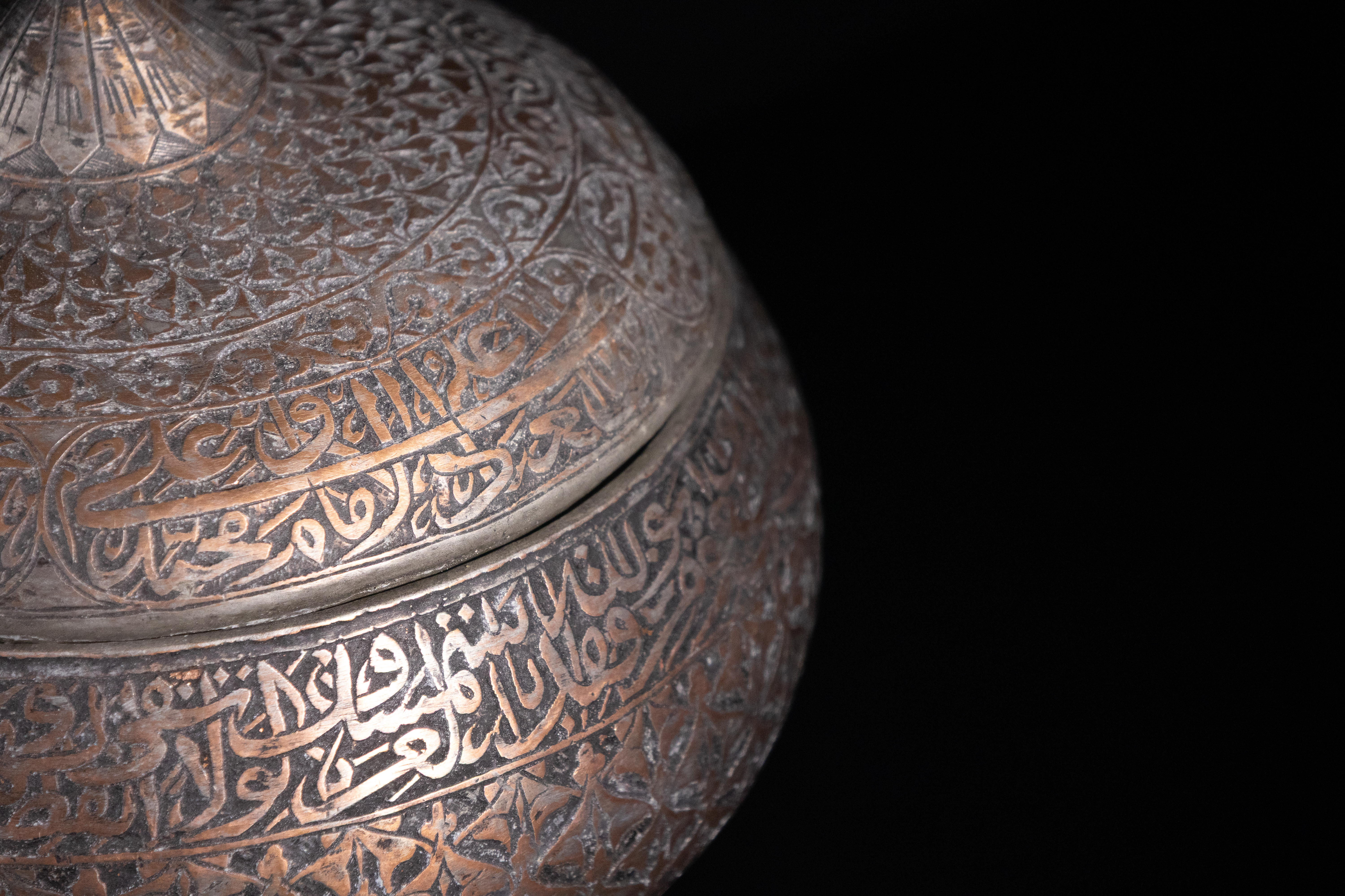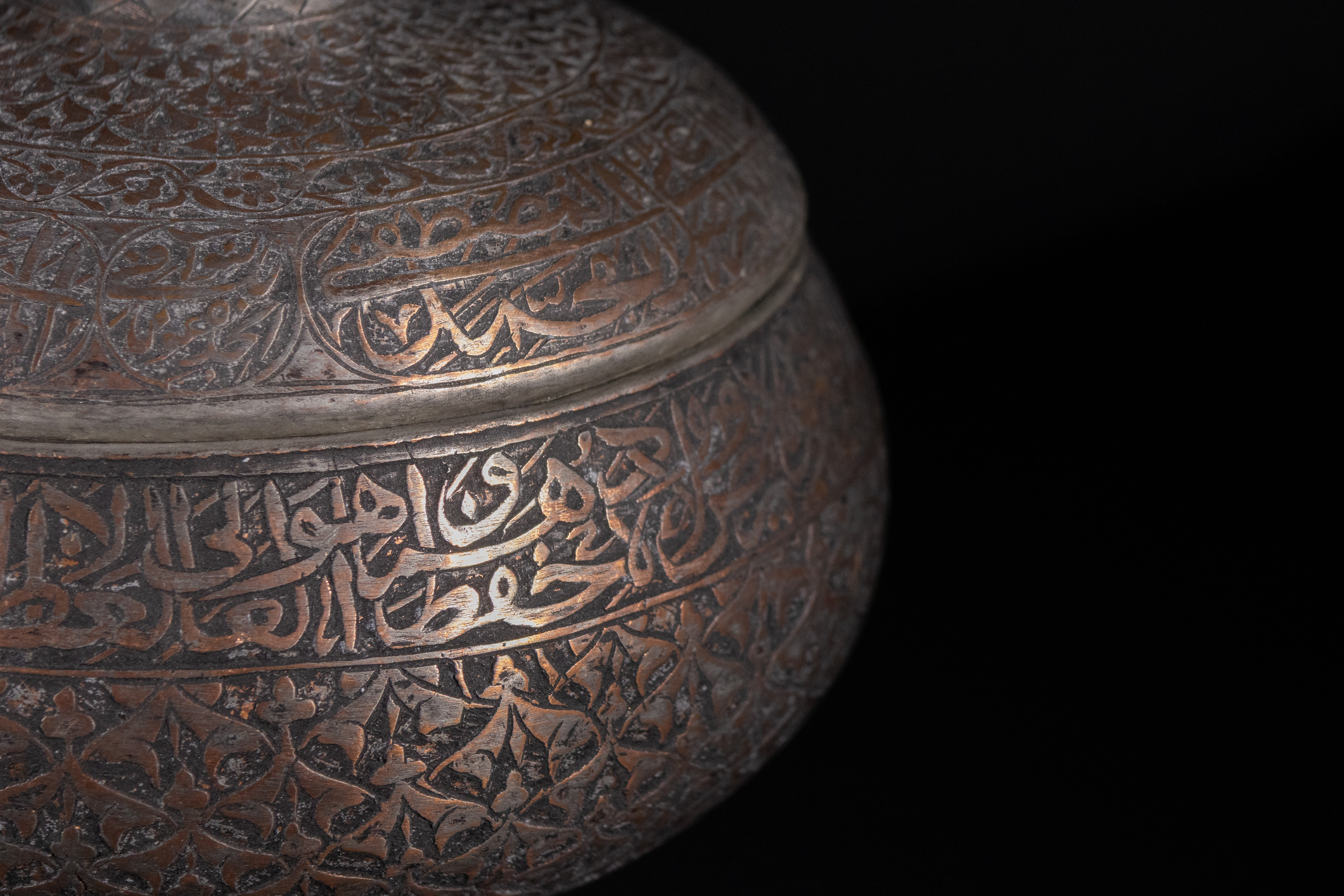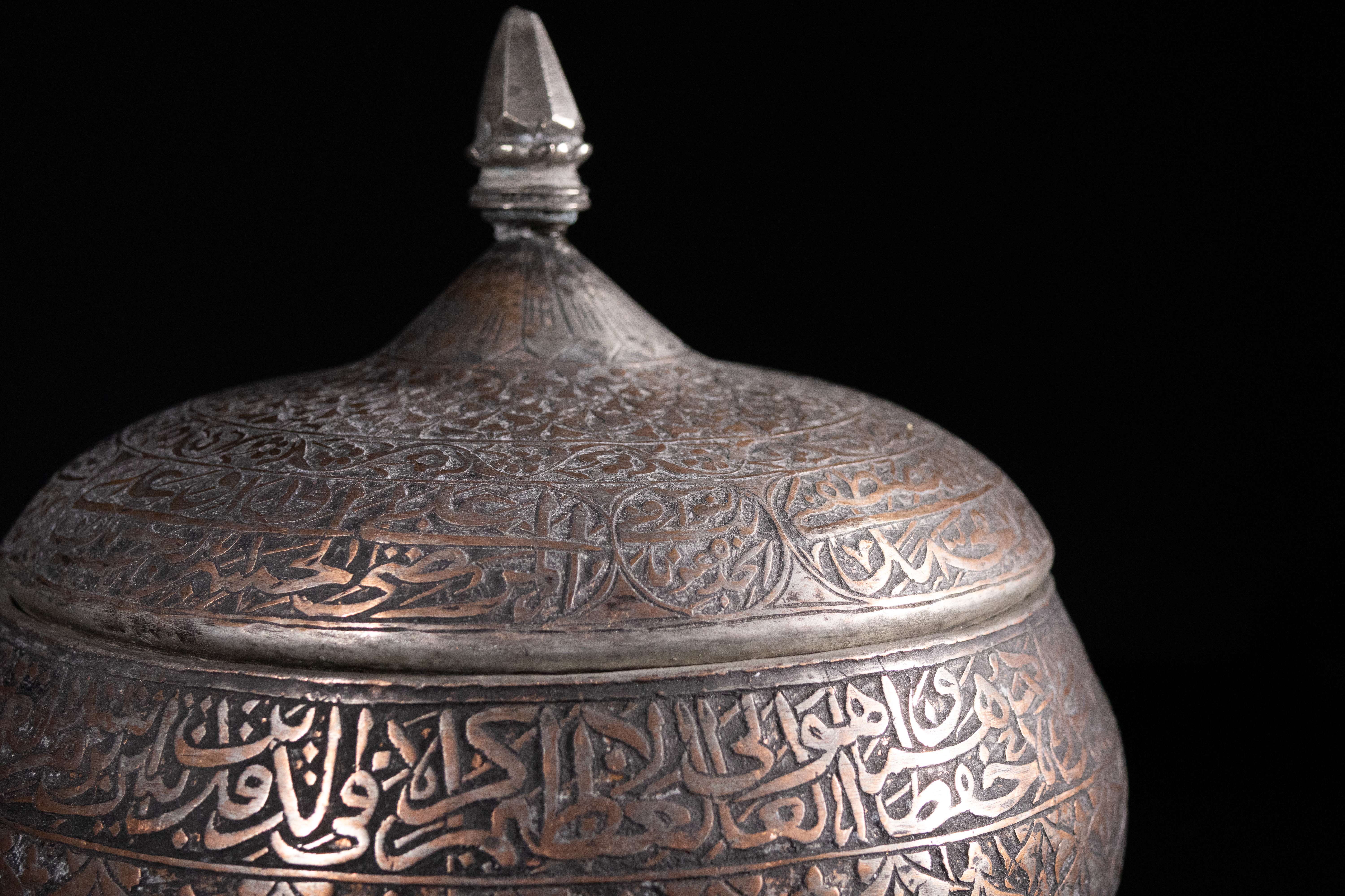 Lot 68: A Persian Tinned Copper Calligraphic Lidded Bowl, 17th/18th Century