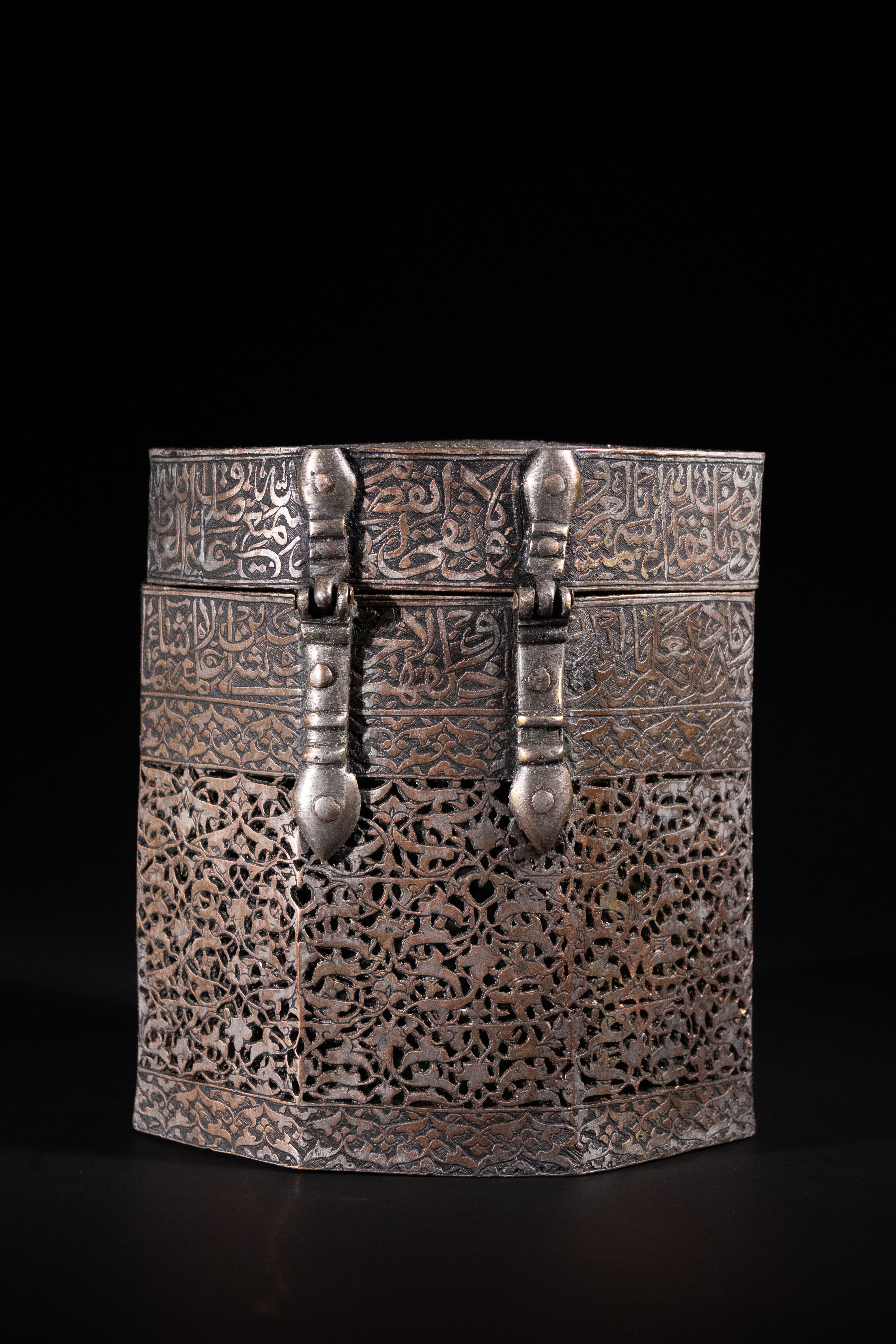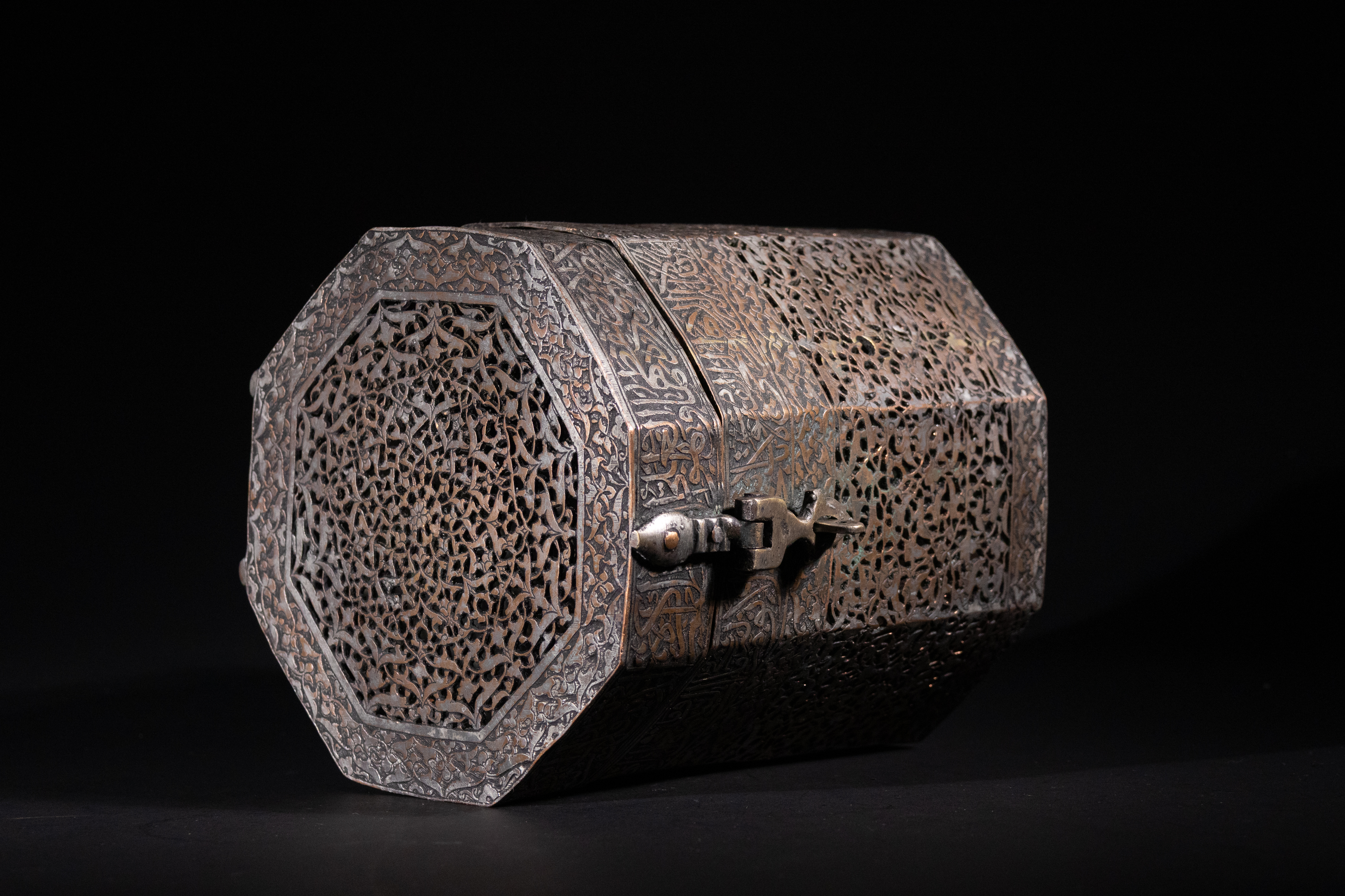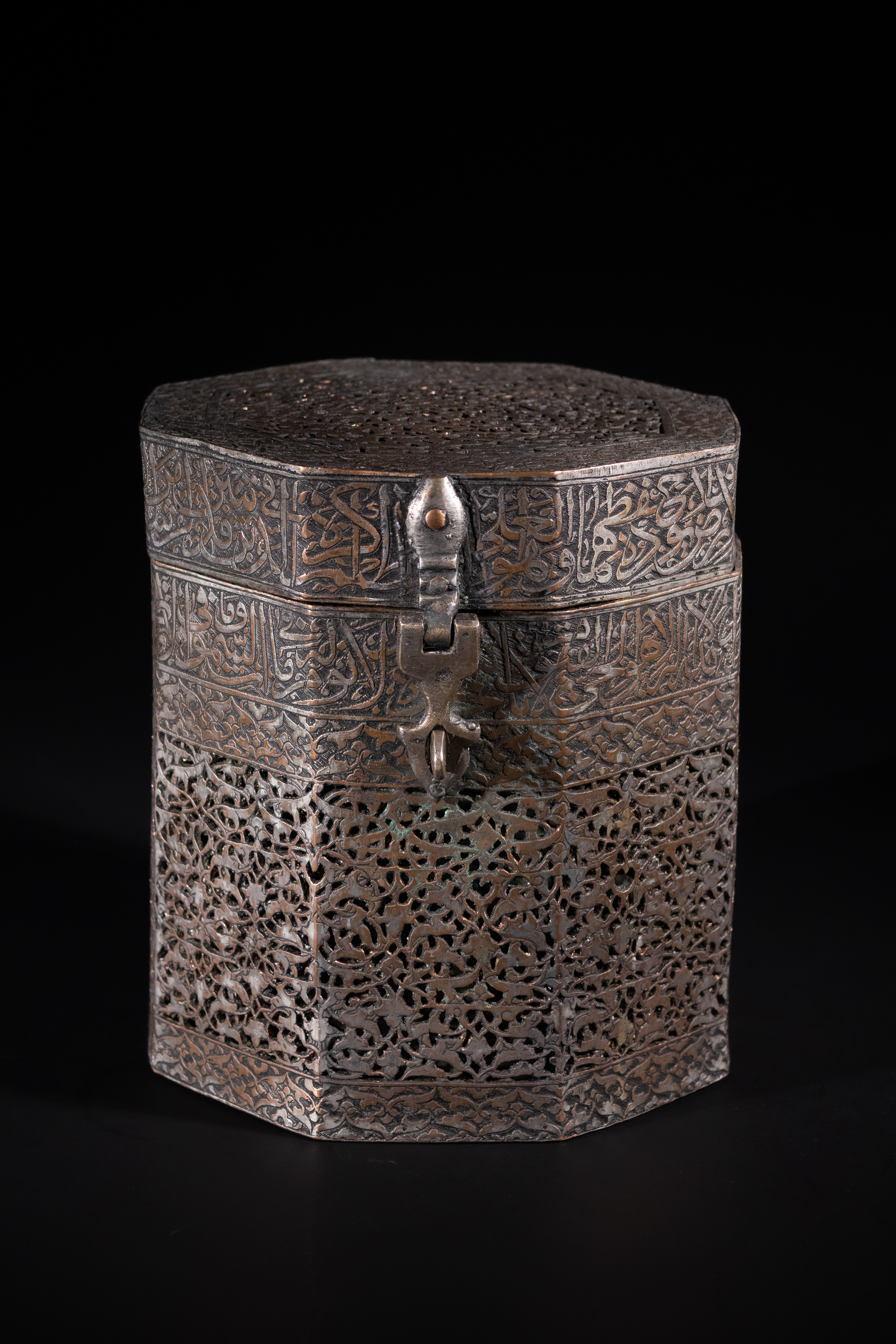 An octagonal metal casket, crafted from a dark, likely silvered or tinned copper alloy, consistent with Islamic metalwork. The hinged lid and upper body band are ornately decorated with finely executed Arabic calligraphy, including the discernible phrase "بسم الله الرحمن الرحيم" (In the name of Allah, the Most Gracious, the Most Merciful). The main body features extensive pierced work in an intricate arabesque or geometric pattern, giving it a filigree appearance, often referred to as ‘jali’ work. A functional hinged clasp secures the lid.