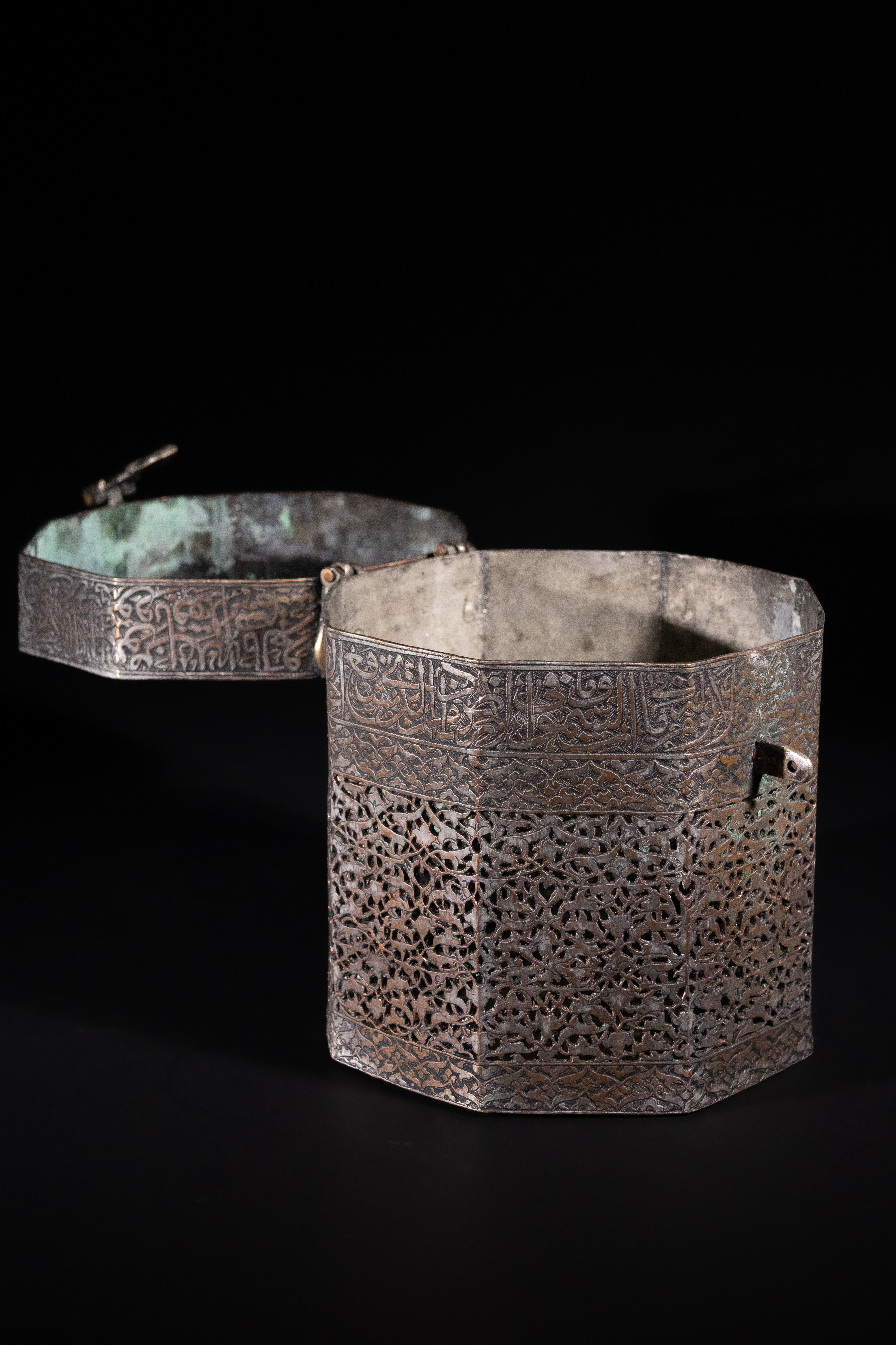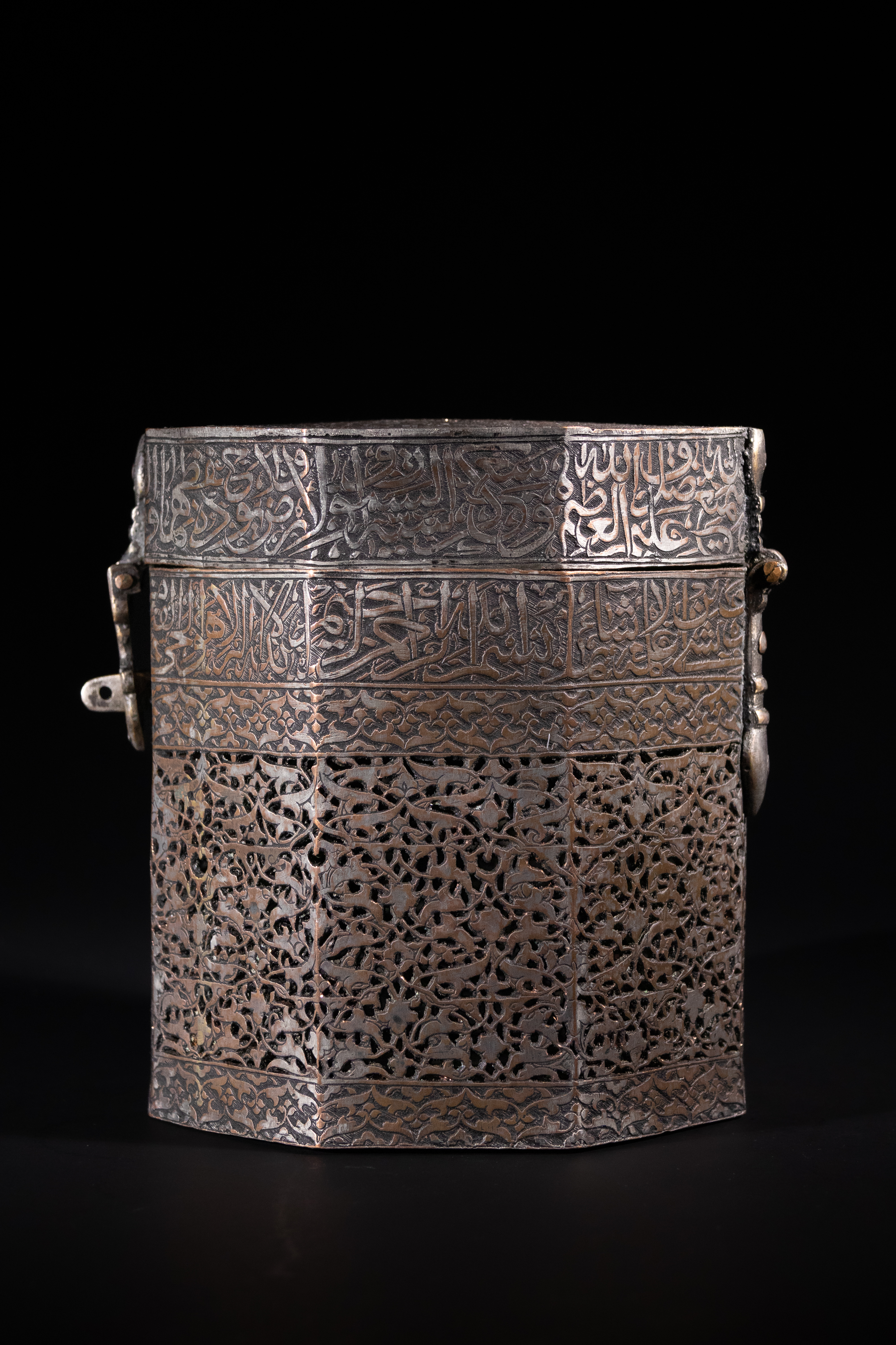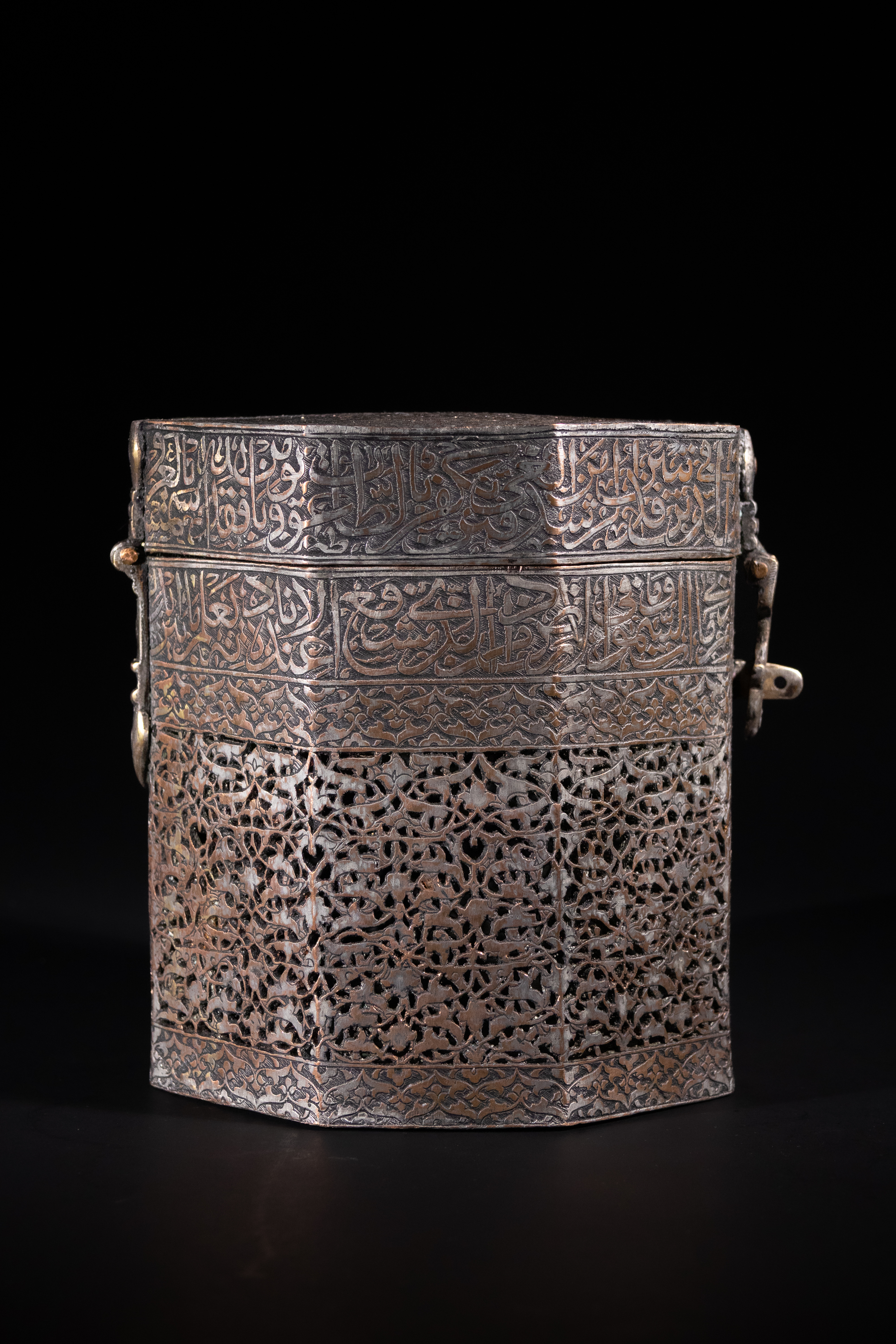 An octagonal metal casket, crafted from a dark, likely silvered or tinned copper alloy, consistent with Islamic metalwork. The hinged lid and upper body band are ornately decorated with finely executed Arabic calligraphy, including the discernible phrase "بسم الله الرحمن الرحيم" (In the name of Allah, the Most Gracious, the Most Merciful). The main body features extensive pierced work in an intricate arabesque or geometric pattern, giving it a filigree appearance, often referred to as ‘jali’ work. A functional hinged clasp secures the lid.