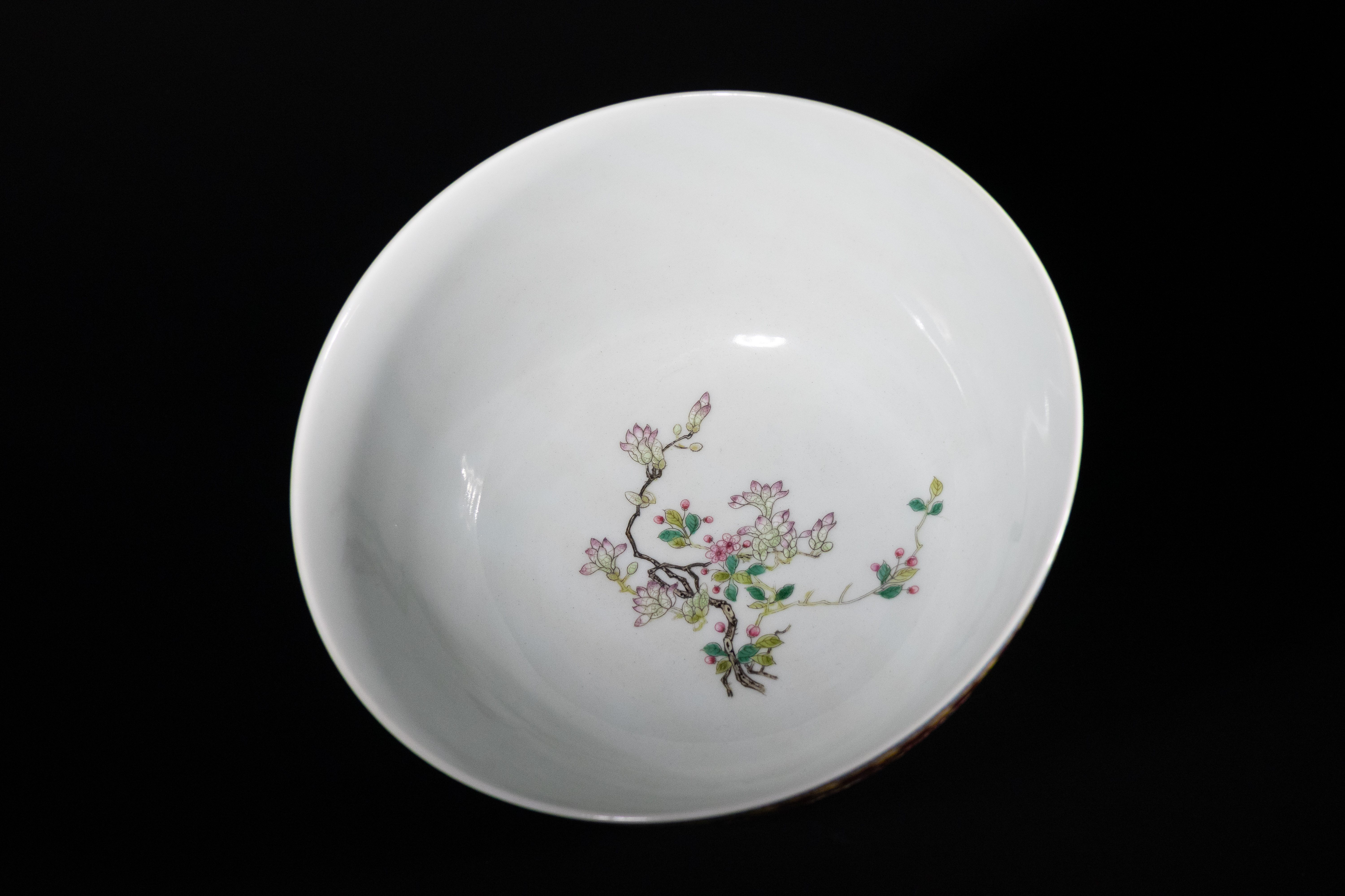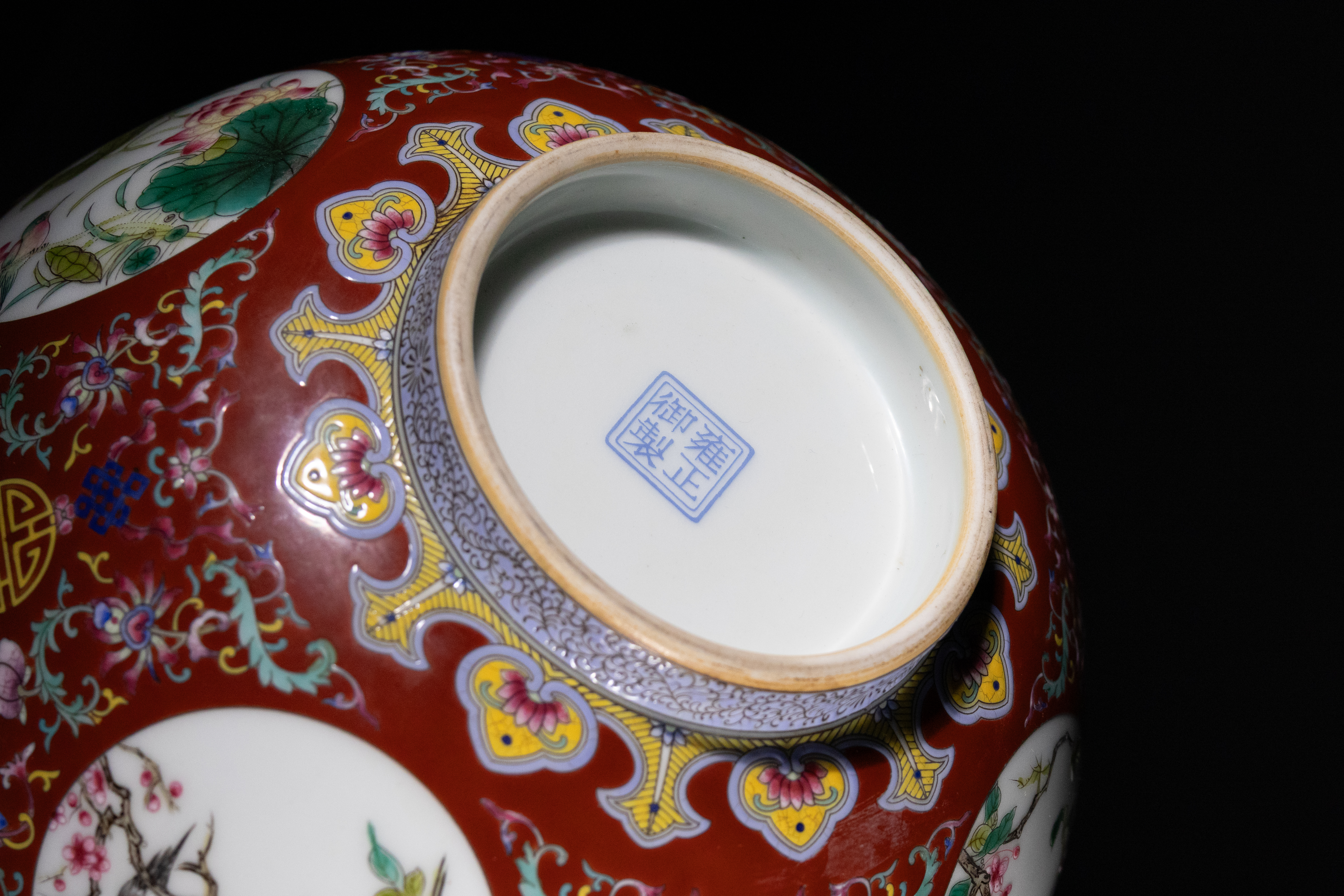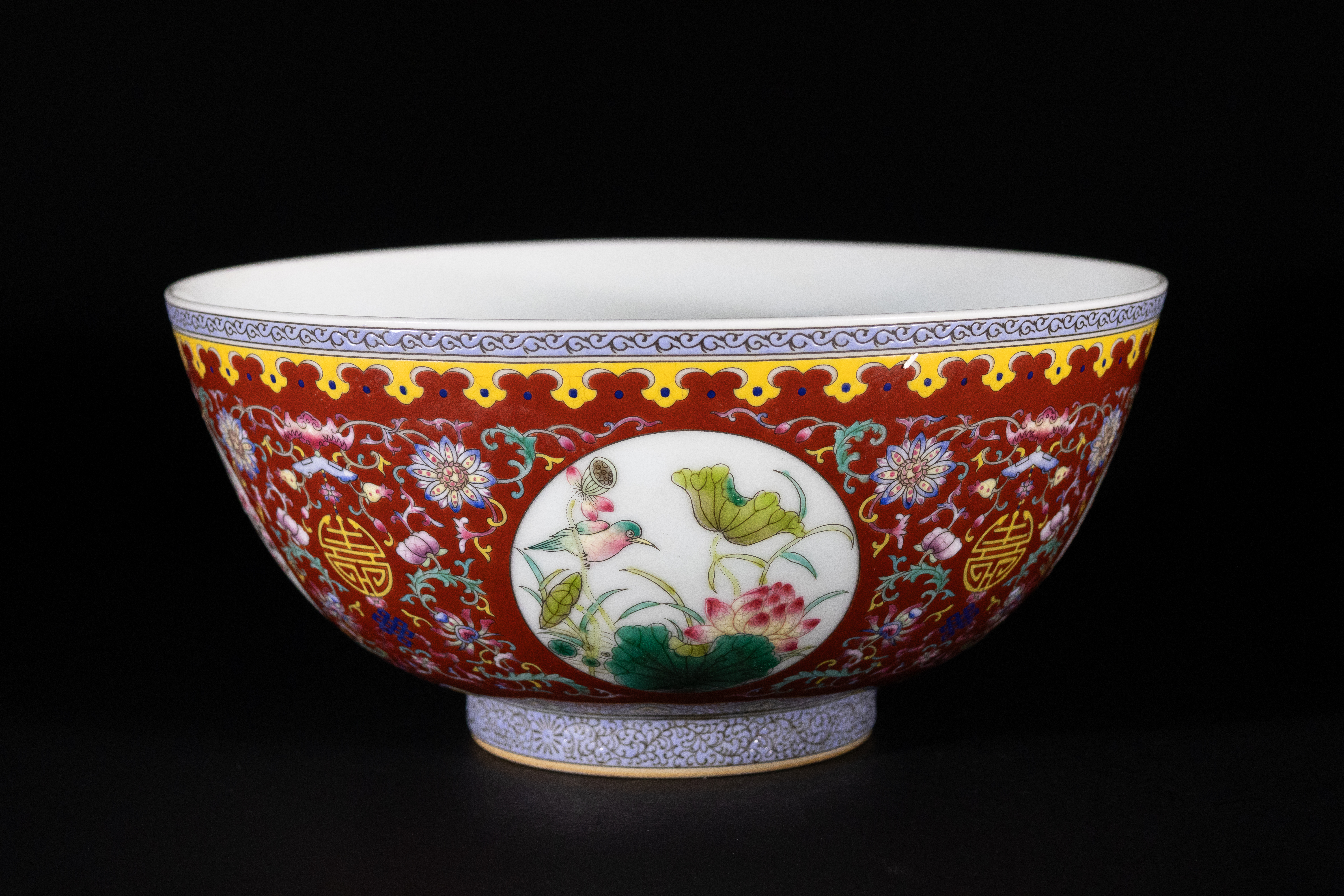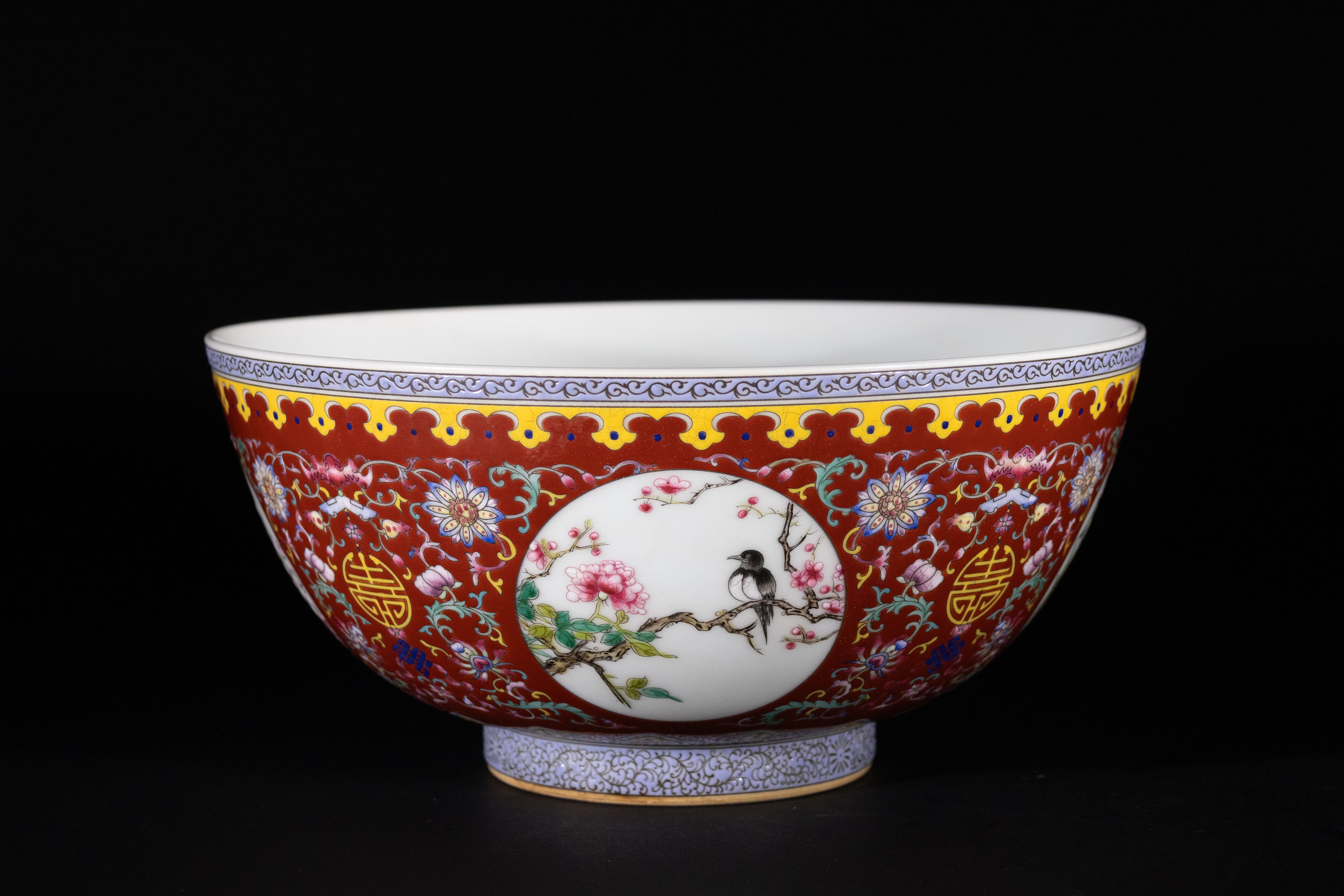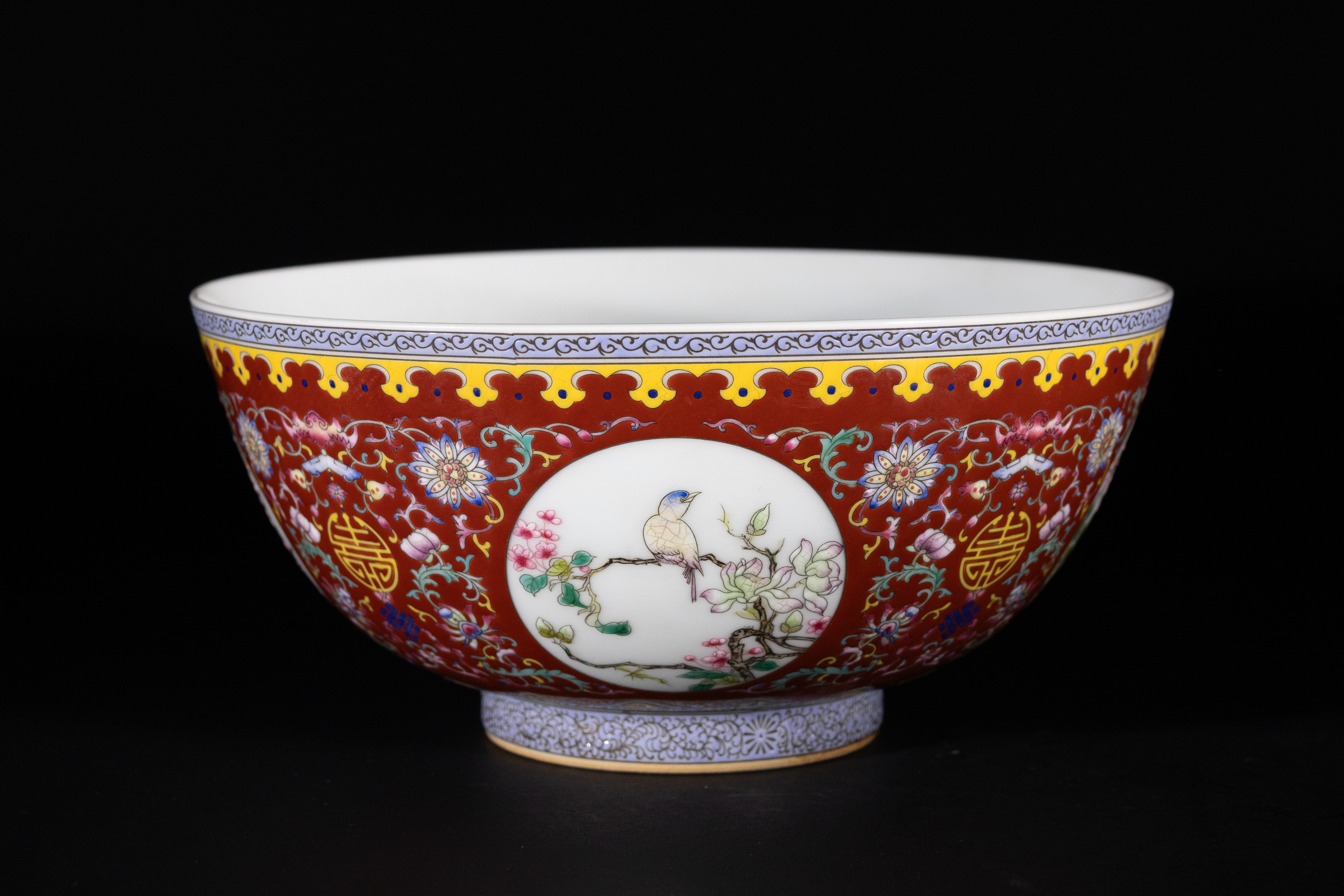 Lot 75: A Chinese Famille Rose Red-Ground 'Shou' Medallion Bowl, Yongzheng Mark
