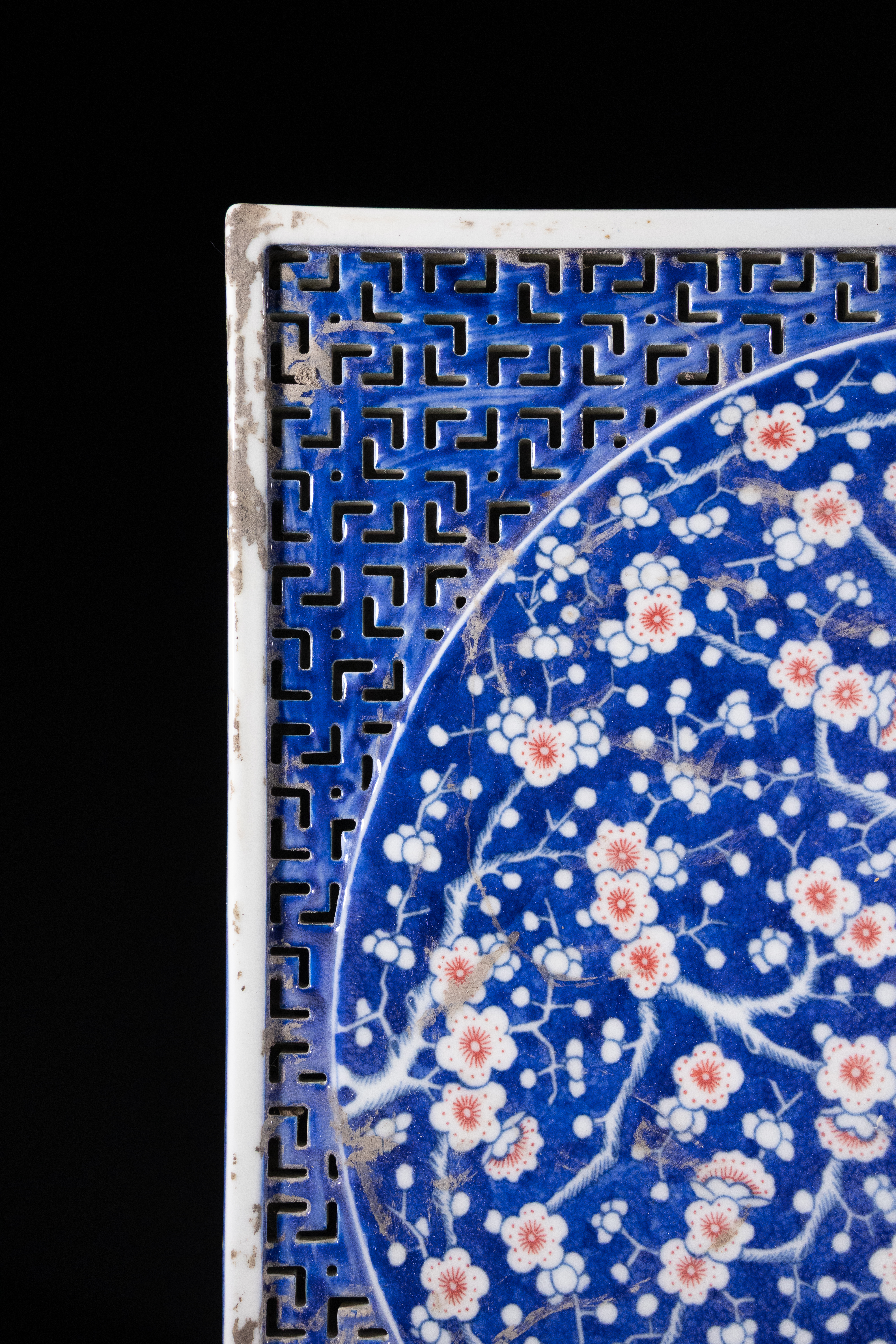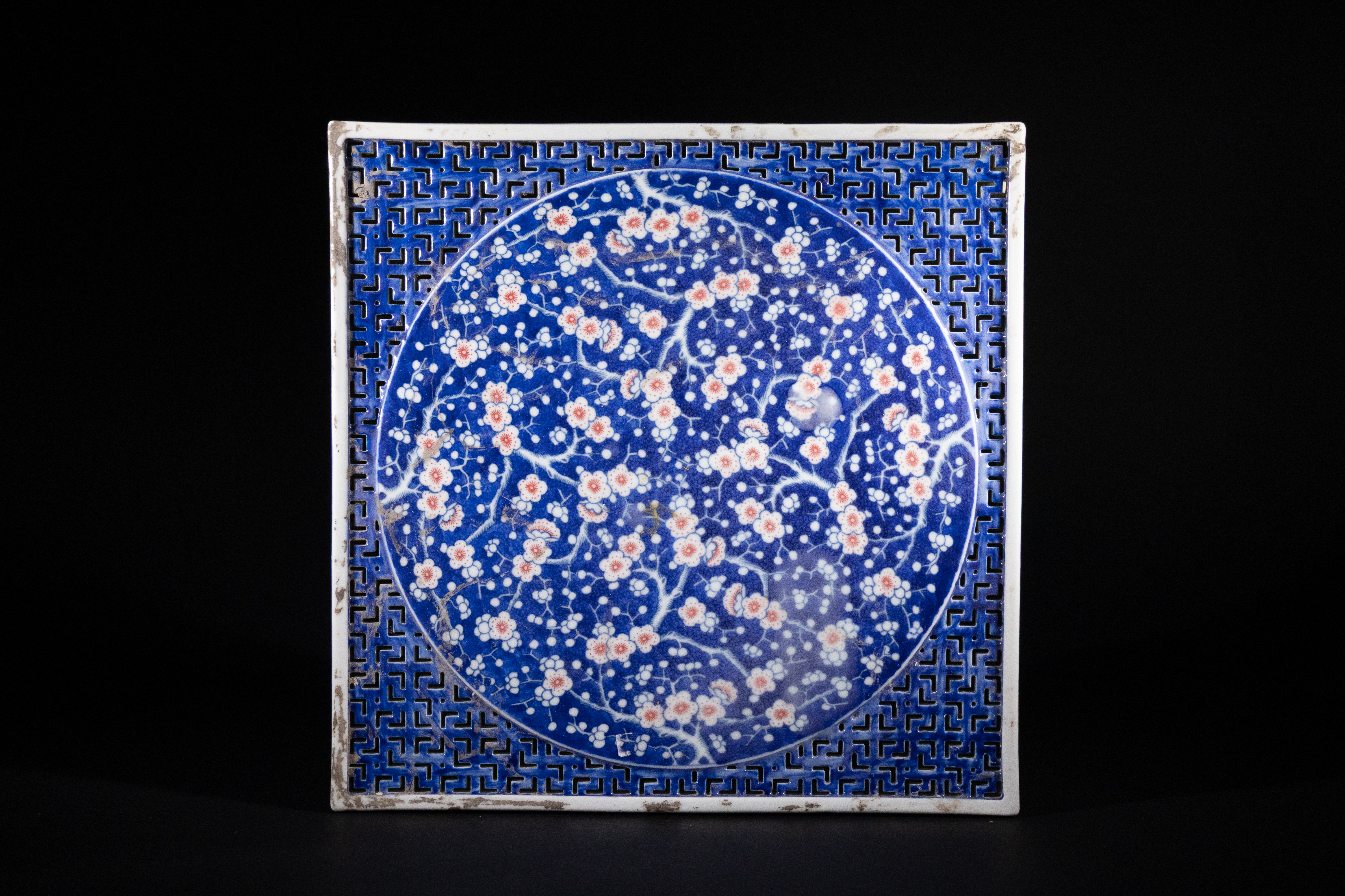 Fair to good condition. There is noticeable glaze loss and chipping to the outer white frame and corners. Minor surface grime and wear are present within the lattice border. The central prunus design remains largely vibrant and intact.