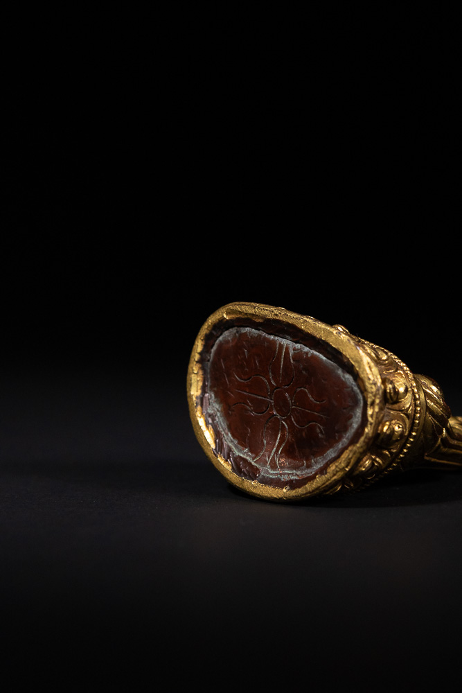 This Tibetan gold gilt bronze figure depicts a seated Buddhist figure, identifiable as an arhat or lama. The figure is rendered in *padmasana* with hands resting in a meditative gesture, wearing simple monastic robes draped over the left shoulder. The expression is serene, with elongated ears and a shaven head, characteristic of Himalayan or Tibetan Buddhist iconography. It is set upon a double-lotus pedestal. The underside of the base features an intact reddish-brown sealing plate, possibly lacquered wood or a composite material, incised with a stylized auspicious Buddhist symbol.