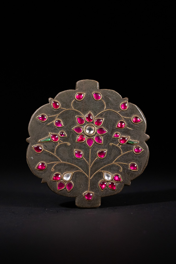 An Indian glass-set jade lobed plaque, featuring a finely inlaid floral design on one side. The decoration consists of a central seven-petaled flower with a colorless cabochon center and six red cabochons, from which intricate gilt-inlaid stems branch outwards, bearing numerous additional red, a few colorless, and small green cabochon ‘buds’ or ‘berries’. The dark green jade plaque has a plain reverse, displaying natural striations in the stone and a central area of surface abrasion.