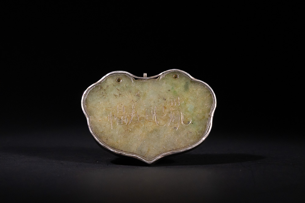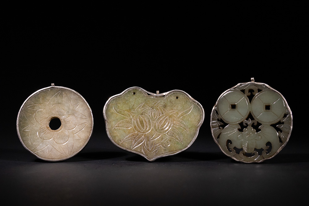 A lot of three Chinese carved jade pendants or amulets, each set within a silver-colored metal frame with a suspension loop. The leftmost pendant is a circular disc with a central aperture, featuring carved floral motifs. The central pendant is a lobed, cloud-shaped piece, carved on one side with floral and leaf designs. Its reverse side features four Chinese characters: ‘福壽綿長’ (fú shòu mián cháng), translating to ‘May your blessings and longevity be continuous/enduring’. The rightmost pendant features an openwork design of two circular elements, possibly stylized coins, surmounting a stylized bat, all crafted from a light greenish jade, within a matching metal setting.