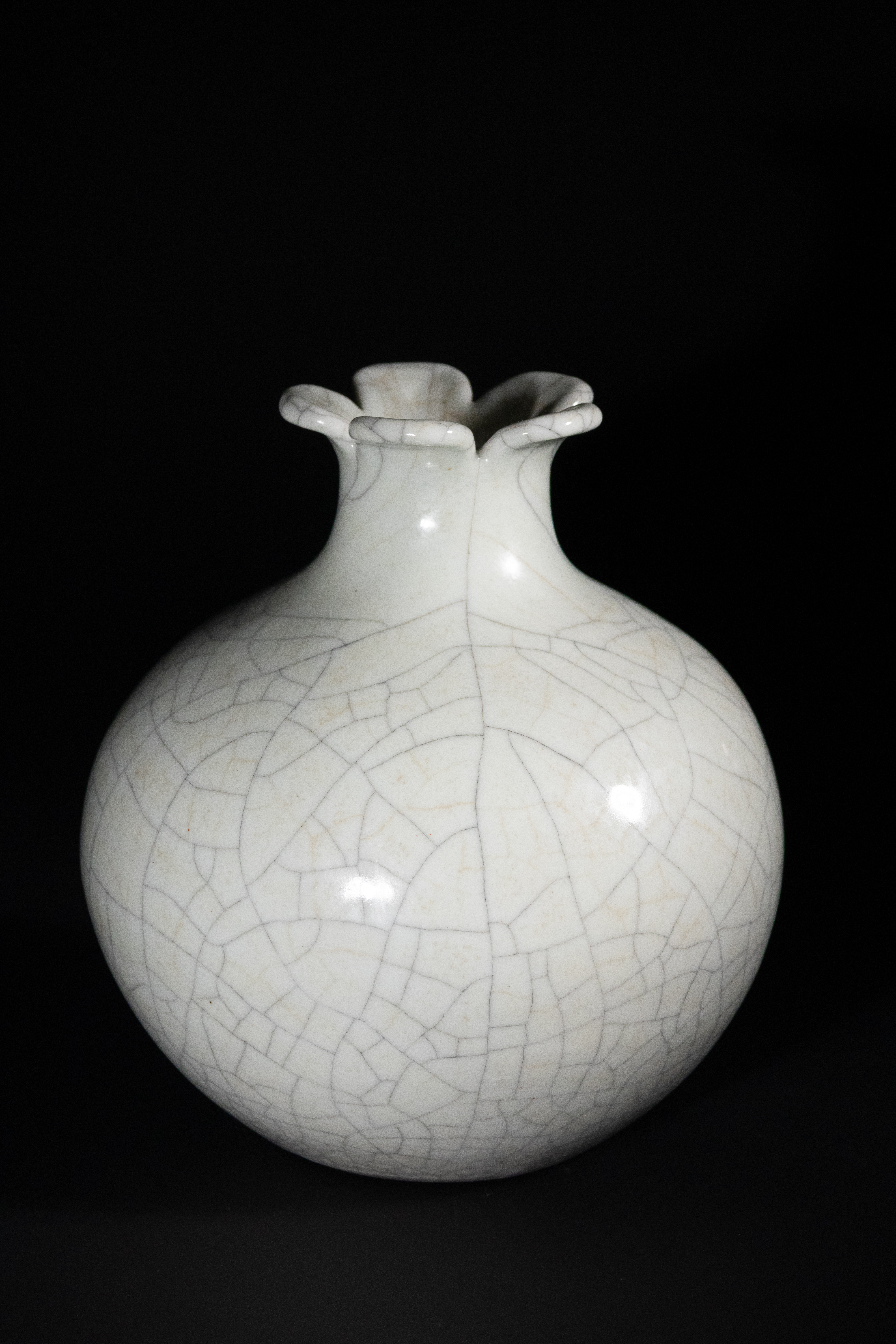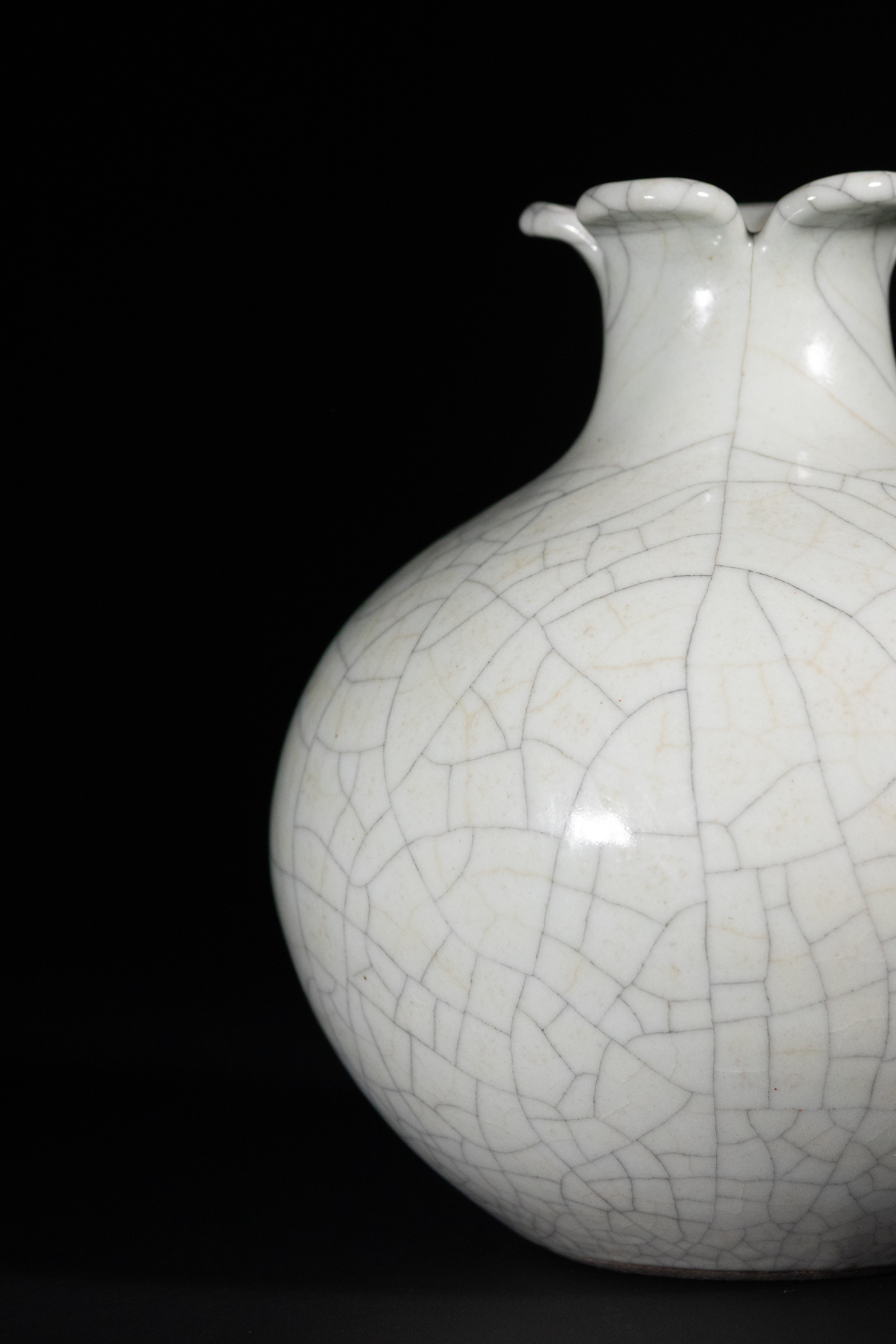 A Chinese Ge-Type Glazed Porcelain Vase, bearing an underglaze blue Qianlong Nian Zhi mark to the base, Qing Dynasty. The globular body is covered in a pale, off-white or celadon-toned glaze, exhibiting an extensive, intentional crackle pattern across its entire surface. It features a short, tapering neck that flares into a distinct five-lobed or petal-form rim. The unglazed footrim reveals a reddish-brown body material.