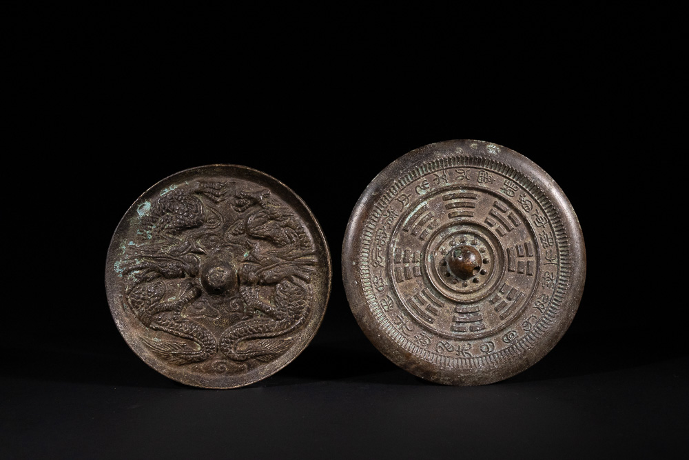 Lot 90: A Pair of Chinese Bronze Mirrors, one with Dragon Motif, the other with Bagua and Inscriptions